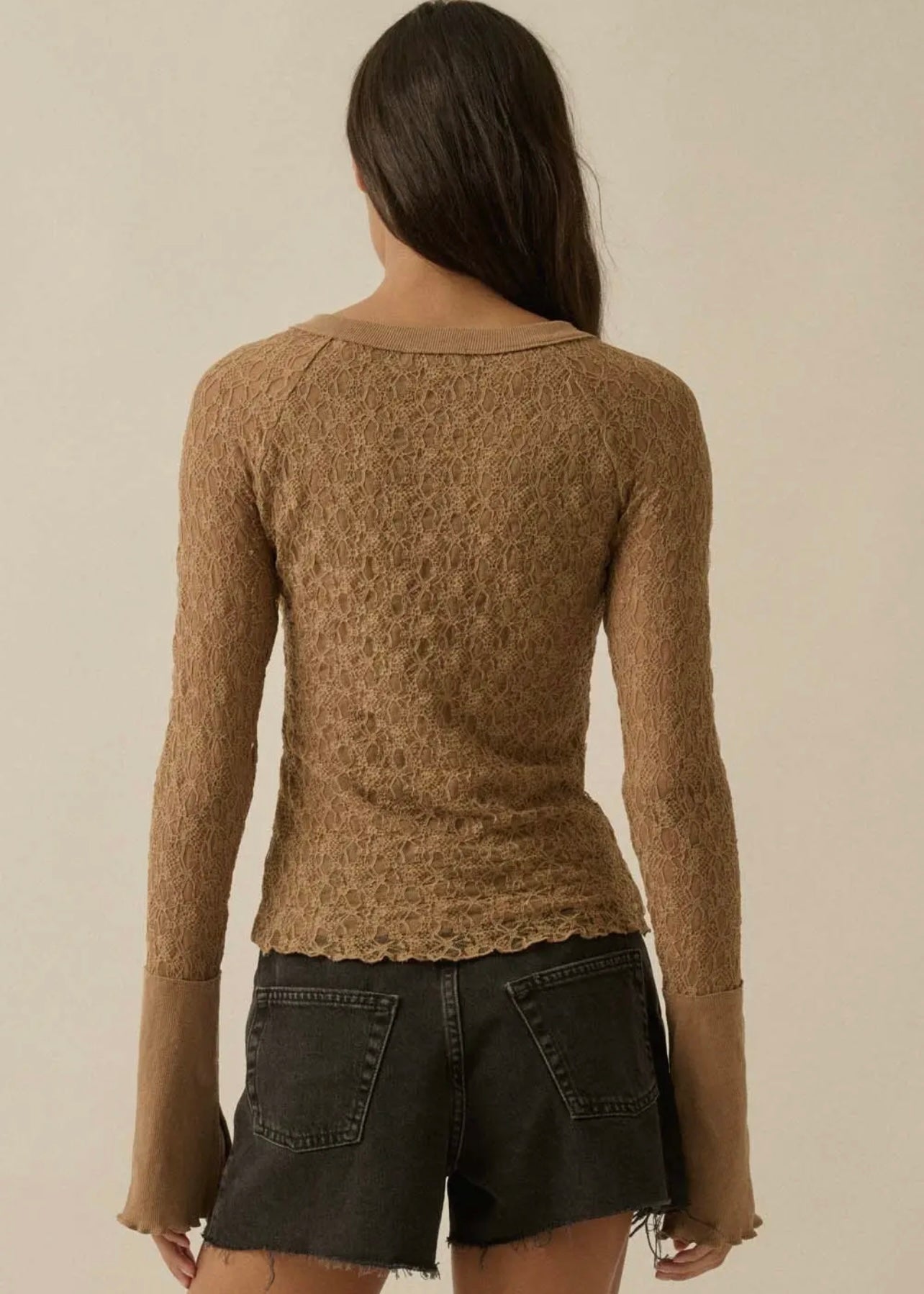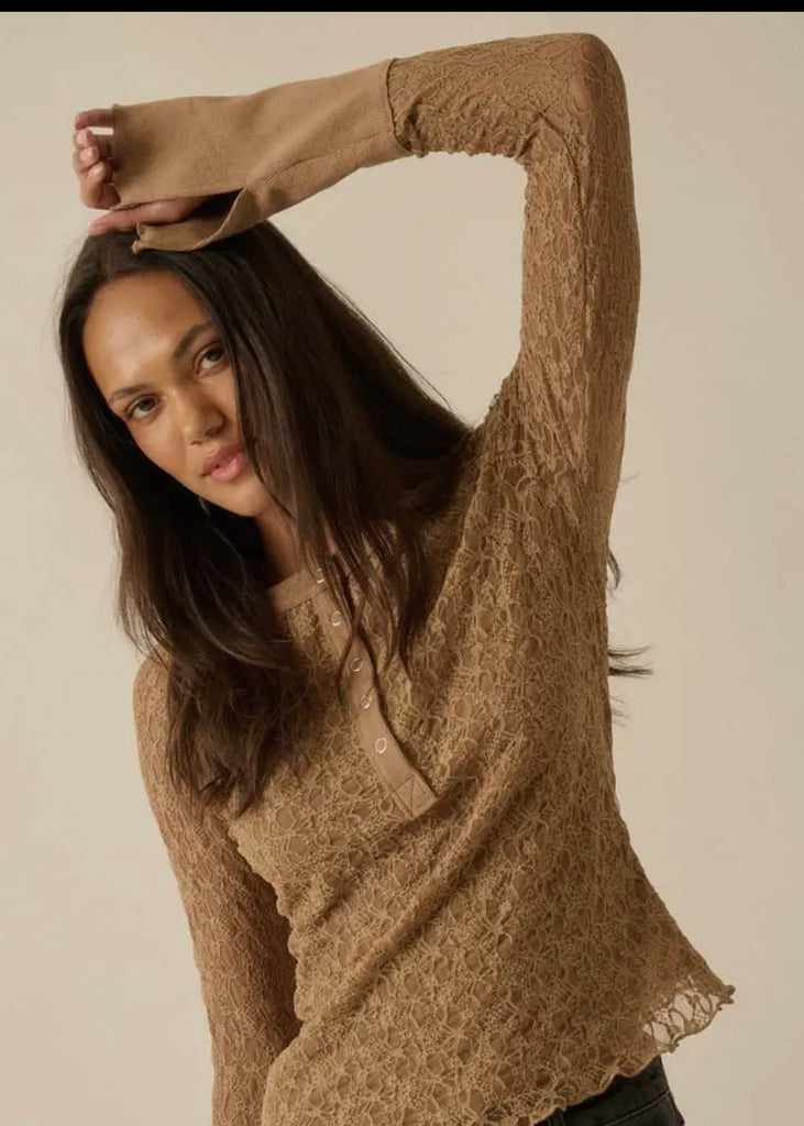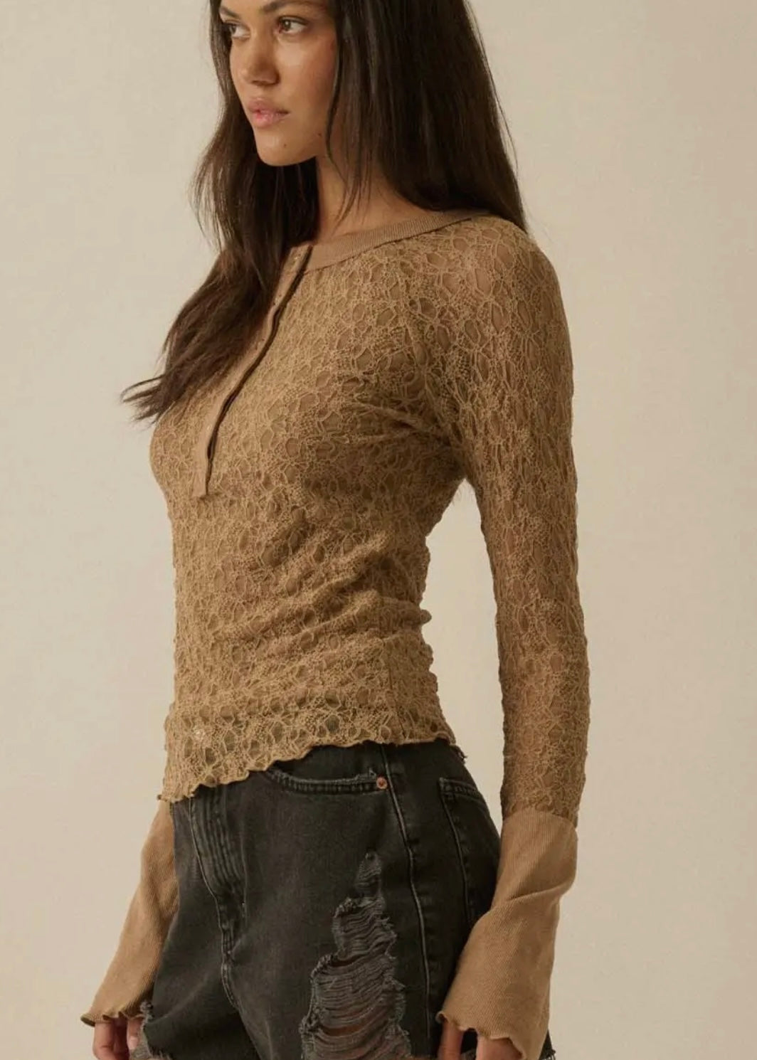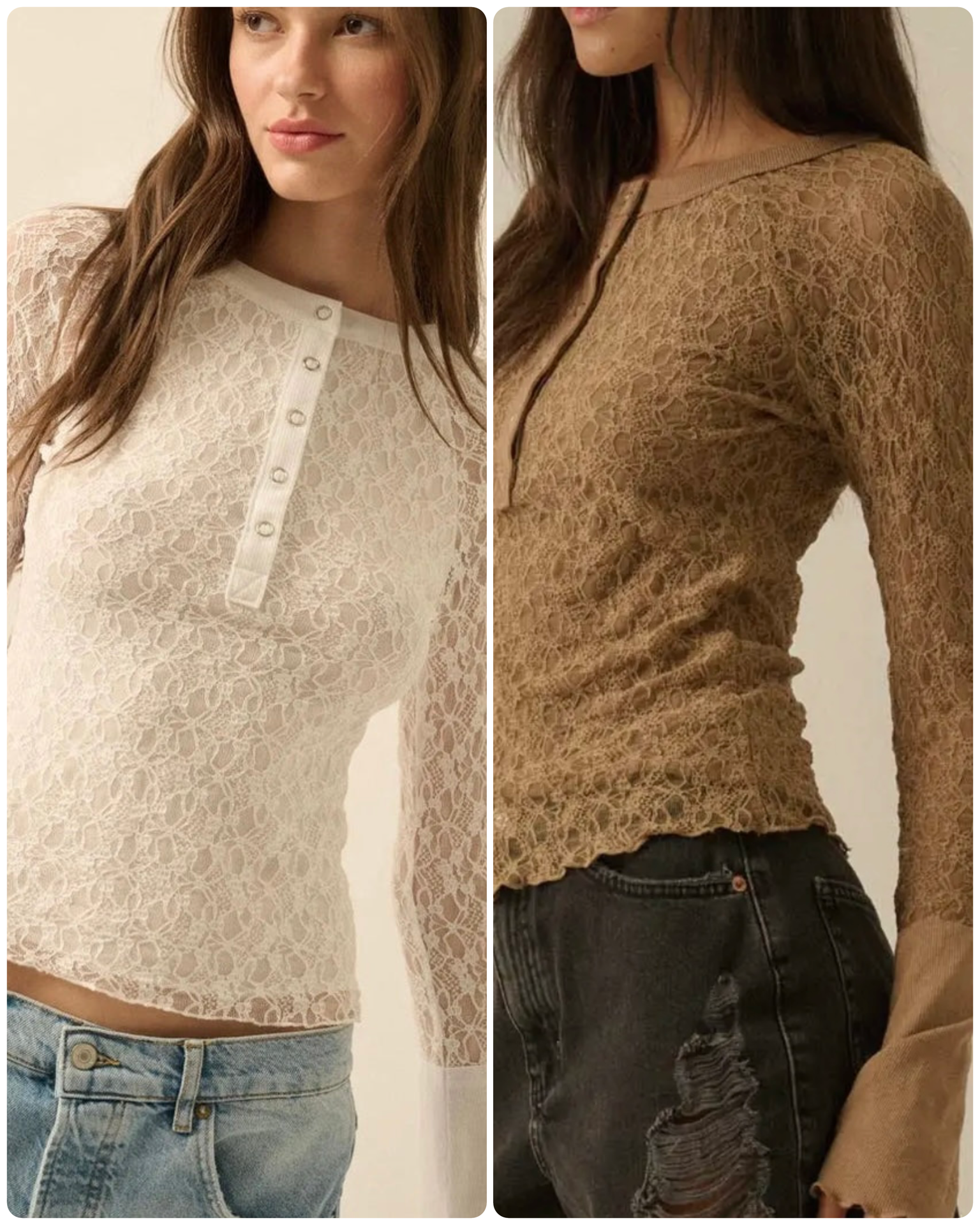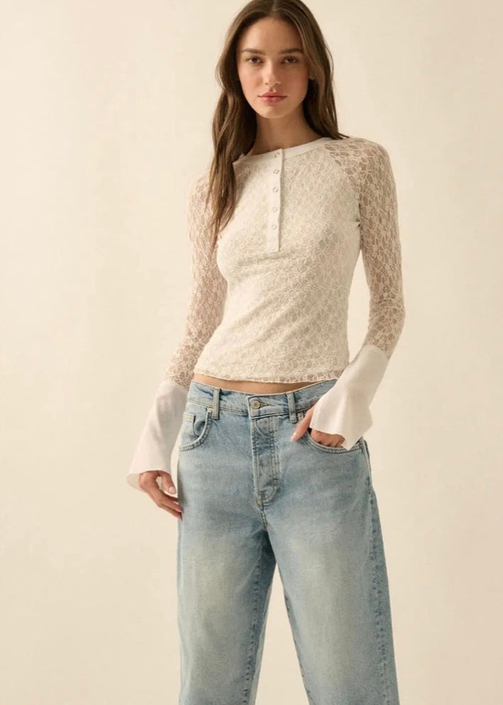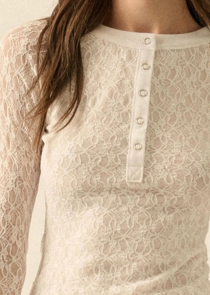 Featuring a delicate floral lace design and a round neckline trimmed with soft rib-knit, this top adds a flirty touch to your outfit. Long raglan sleeves lead to split cuffs with contrasting rib-knit for a fun, unexpected twist. The half-snap henley closure makes dressing easy, while the sleeveless lining keeps you cool and comfy all day long. Perfect for mixing playful details with classic style