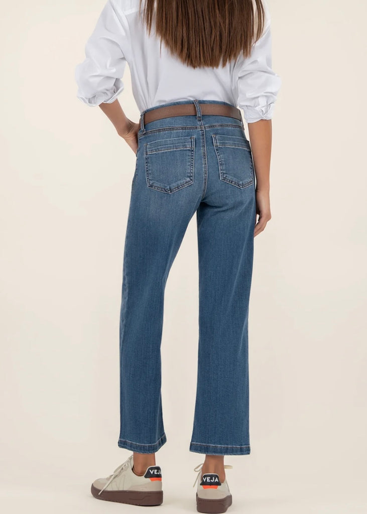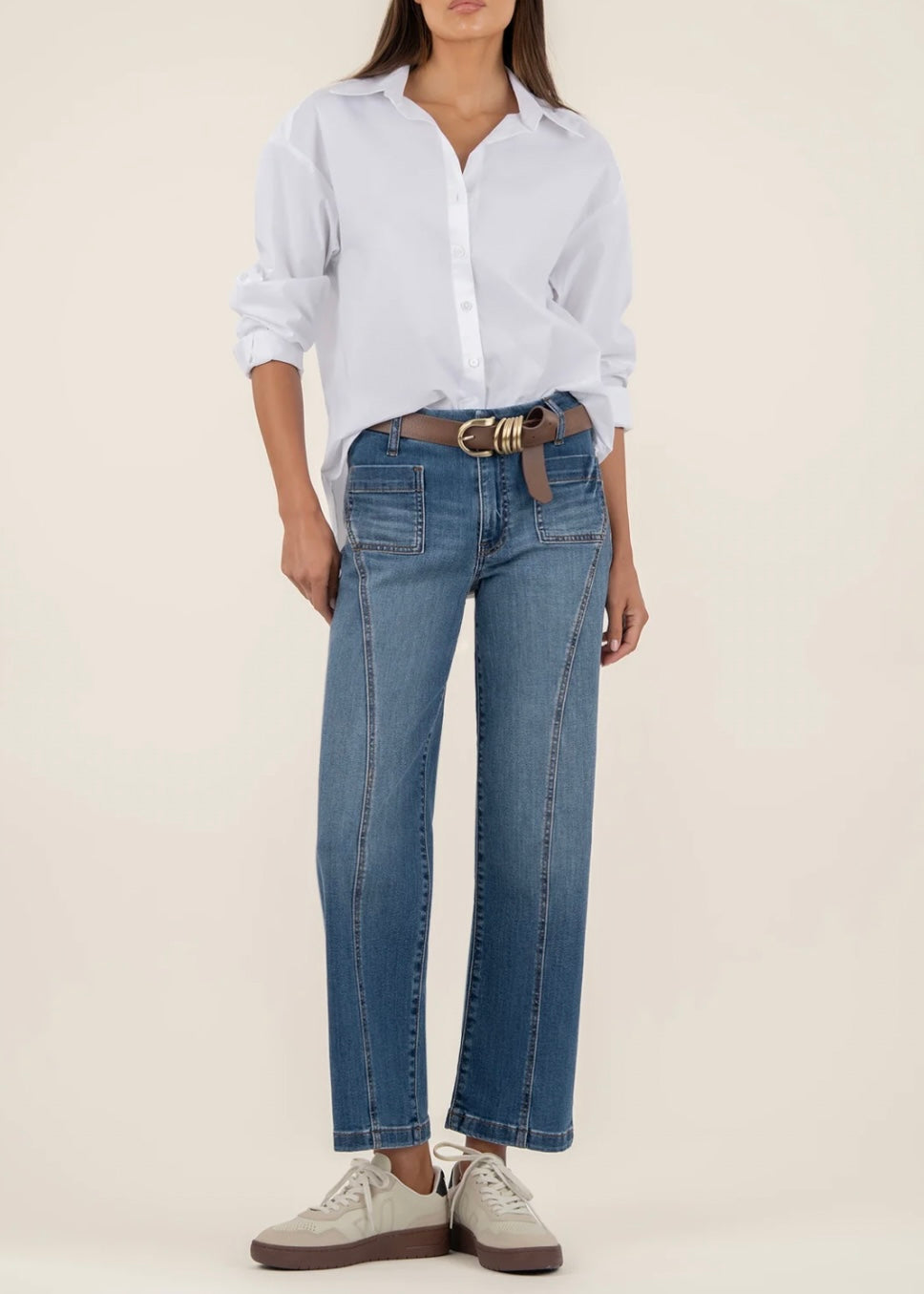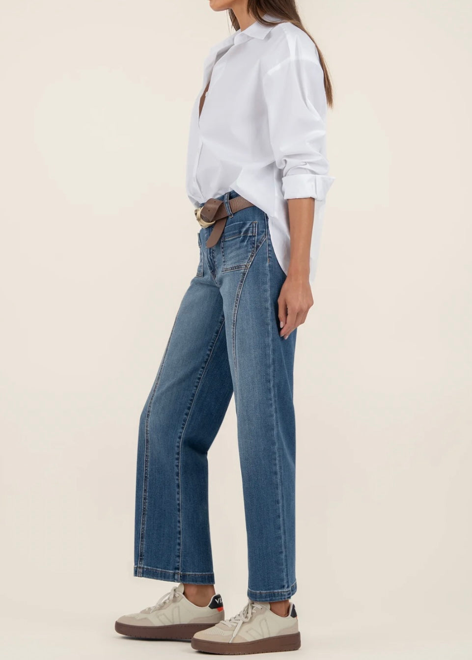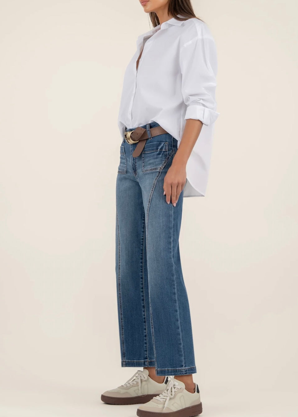 These high-rise wide-leg jeans in a classic medium wash feature patch pockets and a front seam detail for a structured, modern silhouette. Perfect for effortless style with a tailored edge.