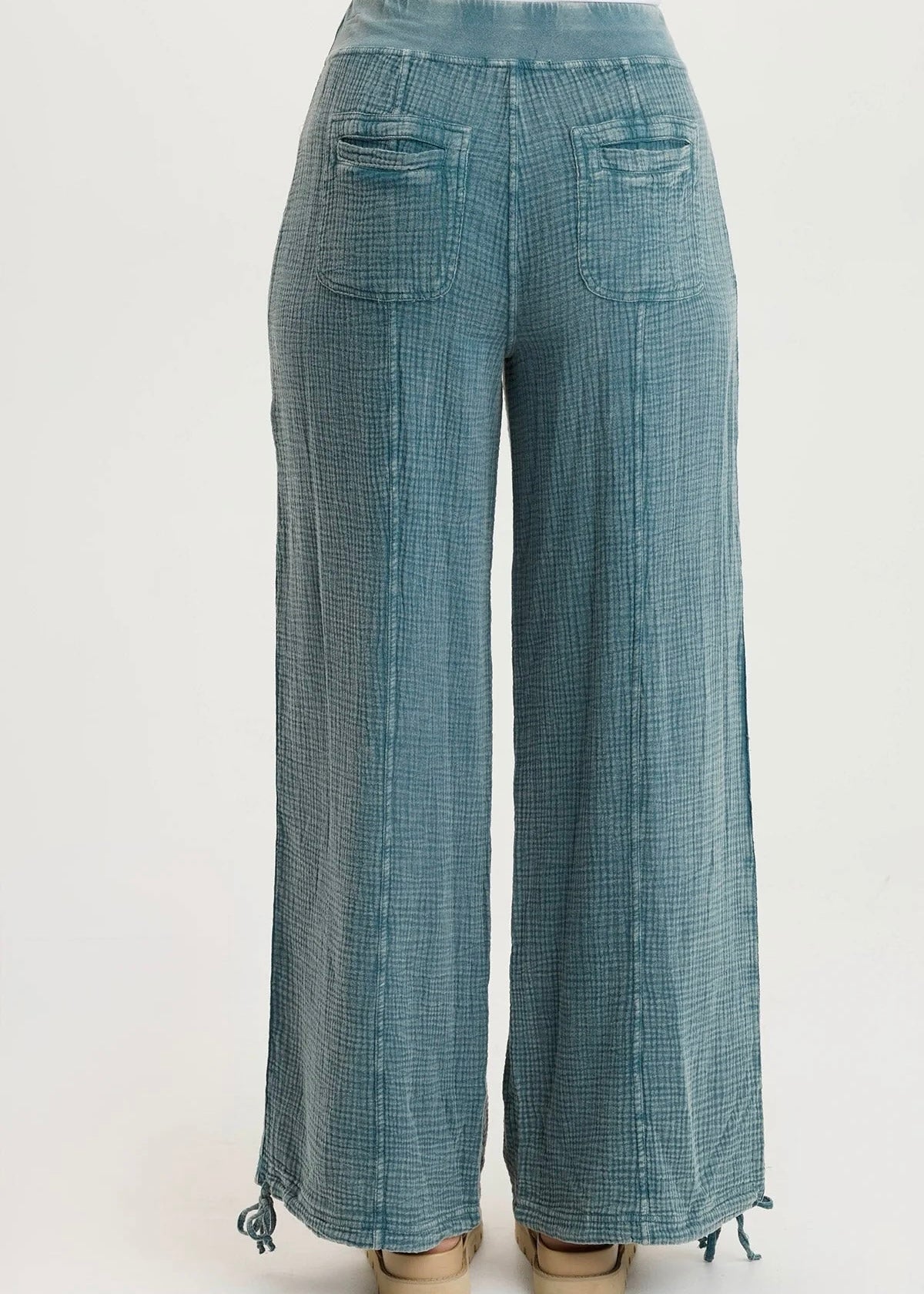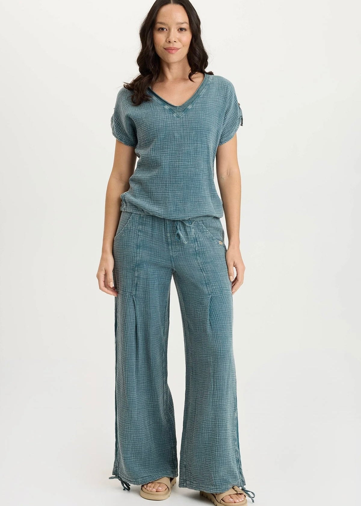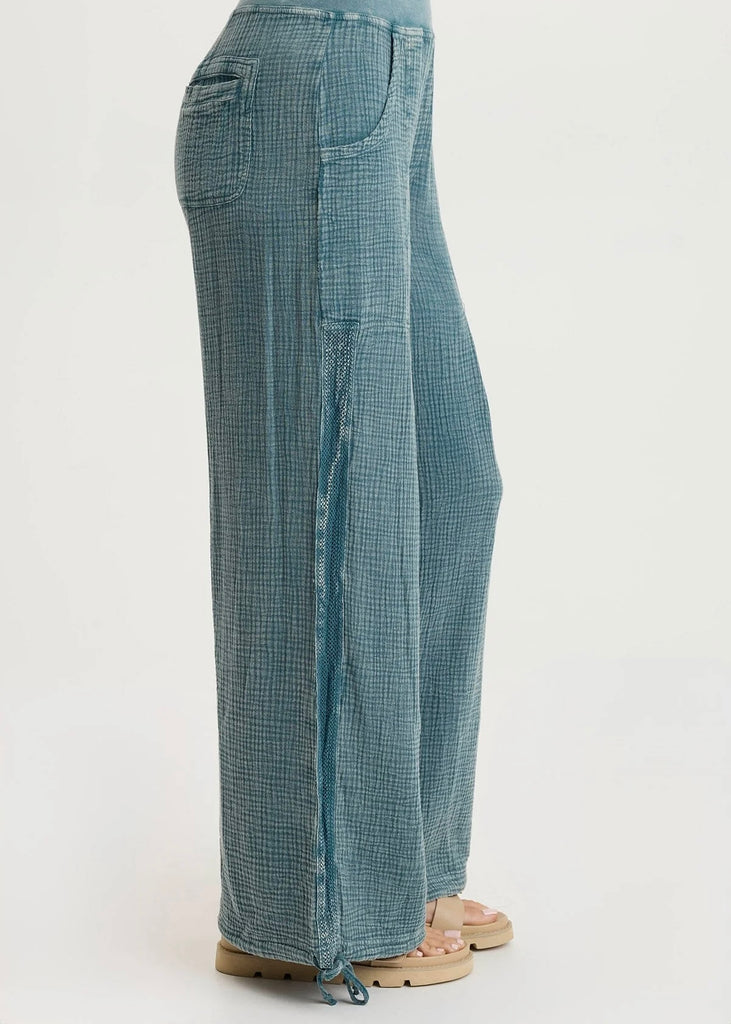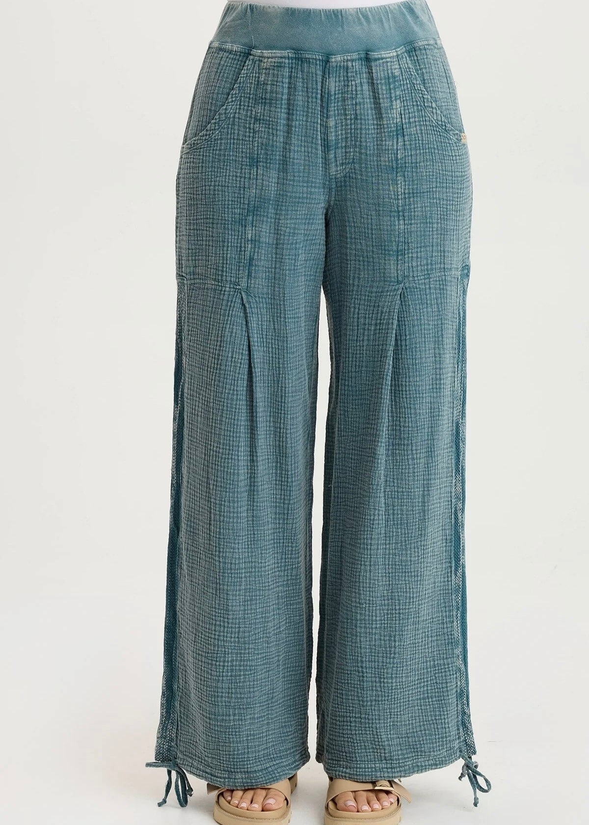 Two pleats adorn the front leg panels on this mesh trimmed, cinched leg opening pull-on pant. Lenka also has two front pockets and two back welt pockets.