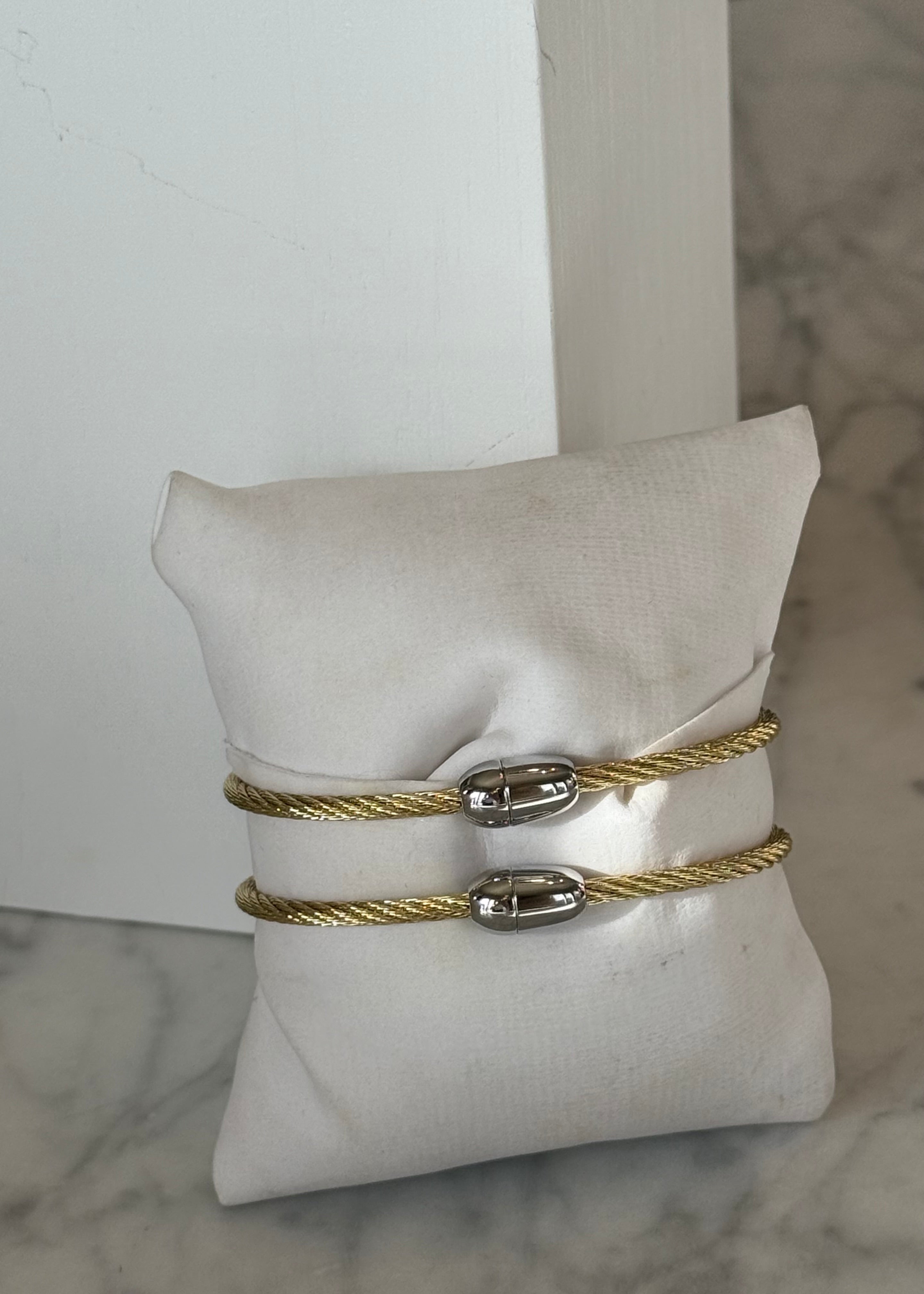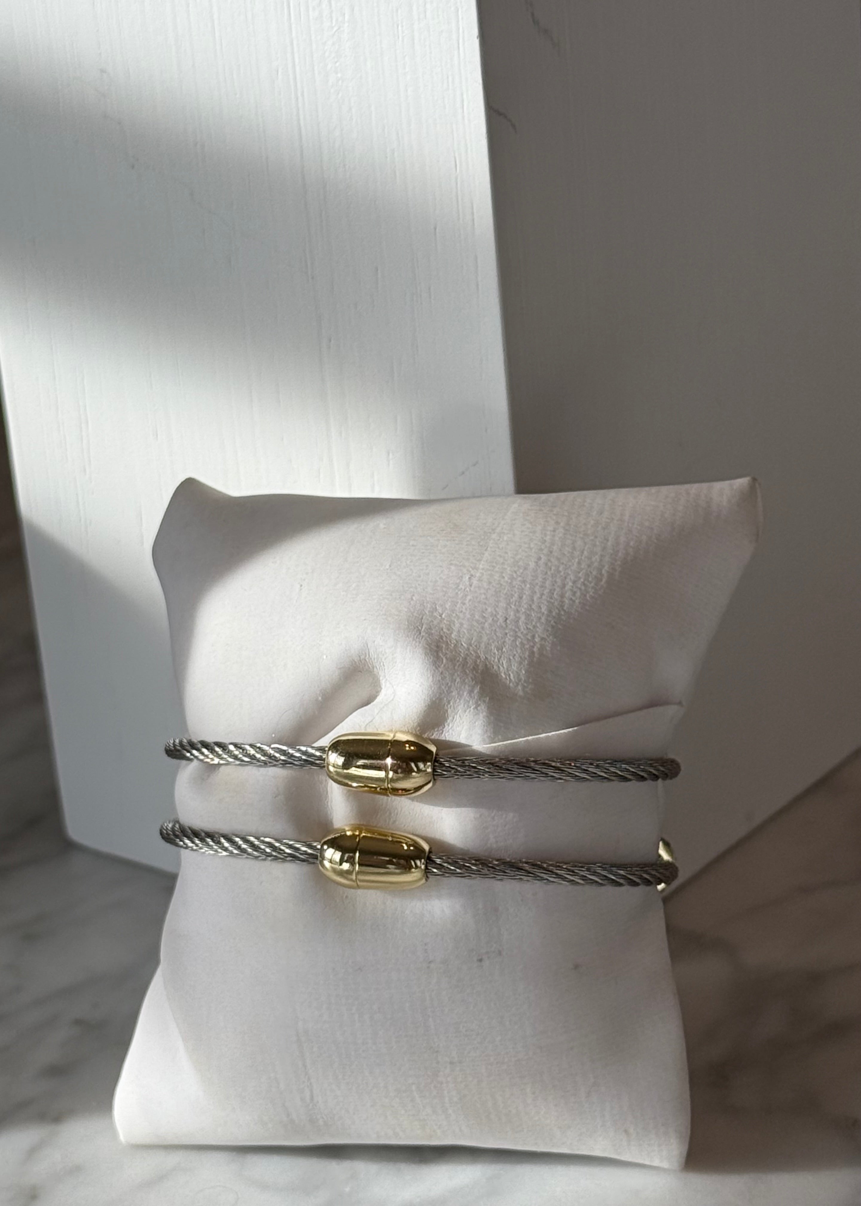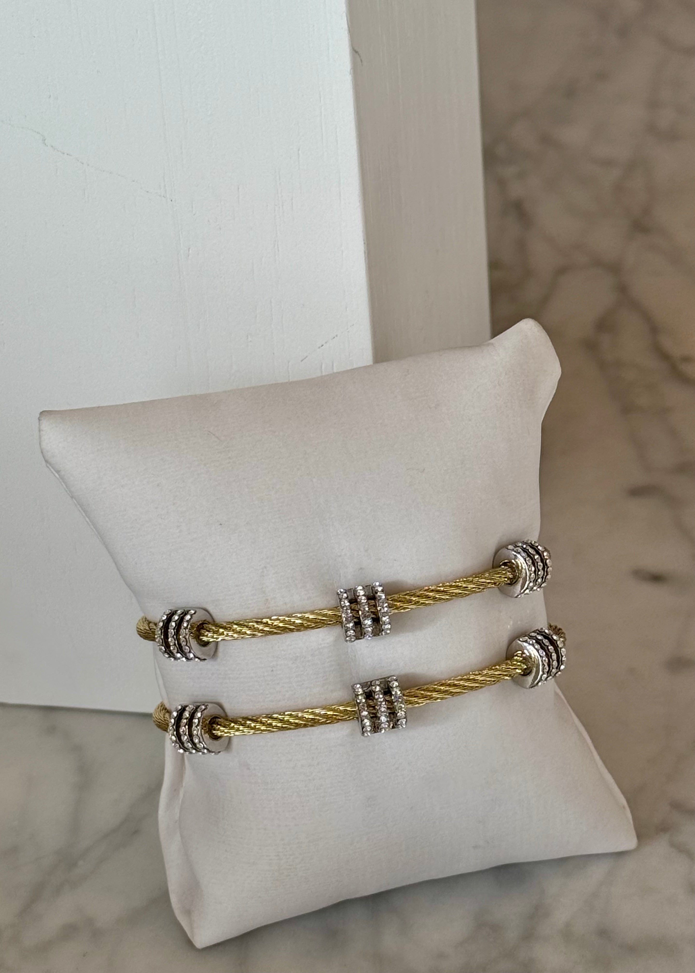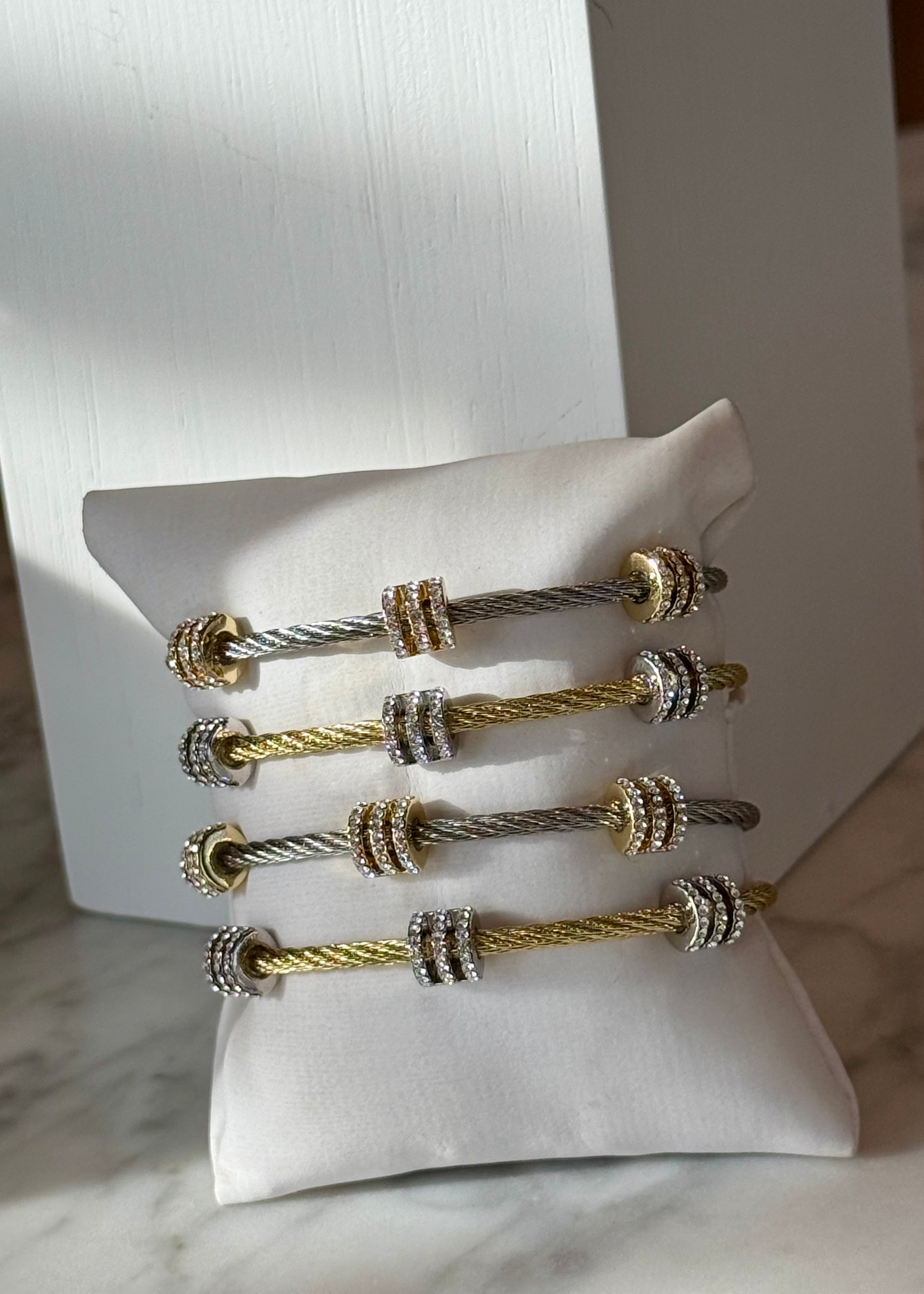 Get the best of both worlds with the Casey Bracelet. This mixed metal cable bracelet not only adds a touch of edginess to your look, but also features pave accents for a touch of sparkle. Perfect for any occasion, this bracelet is a must-have for any jewelry collection!