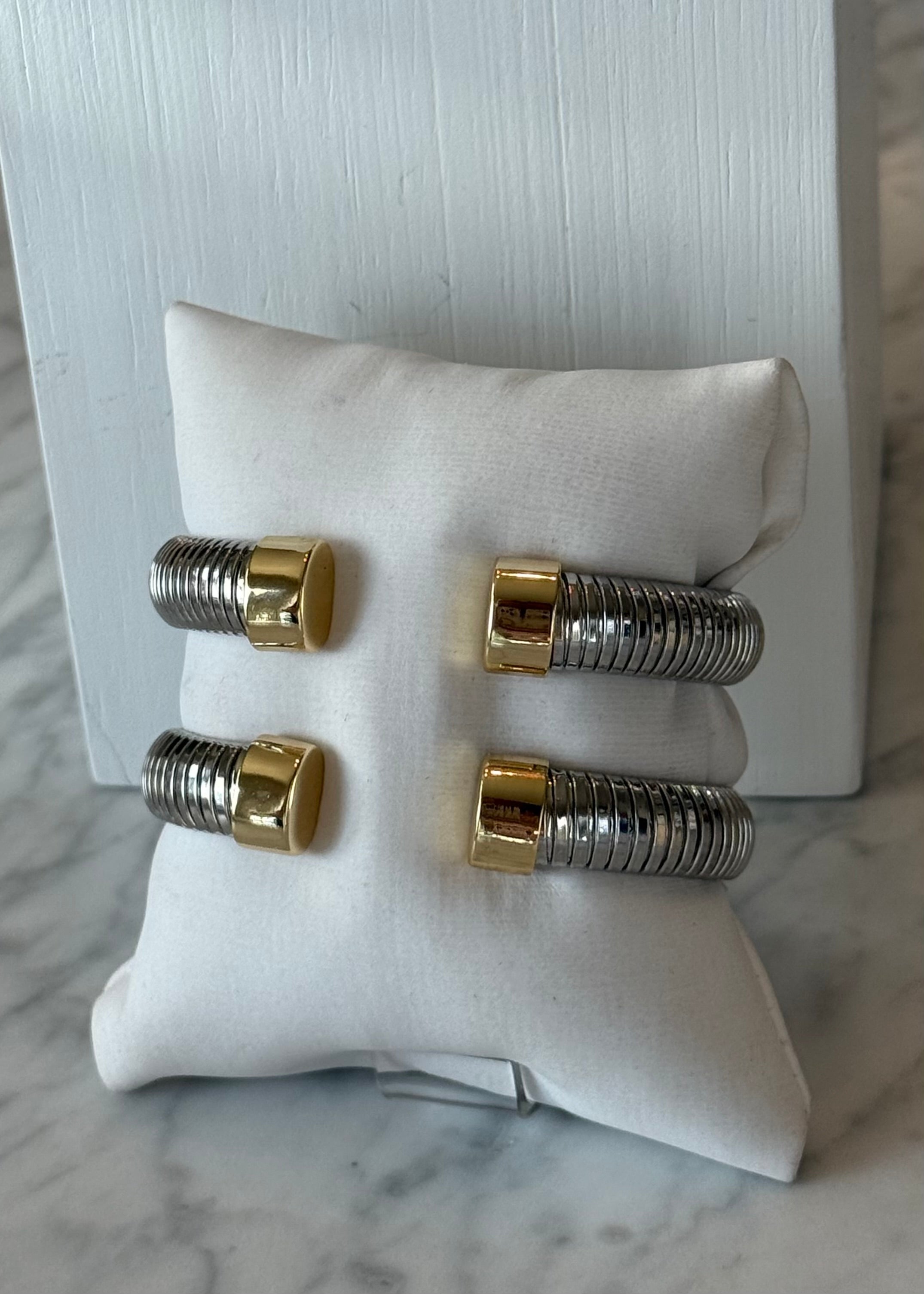 Get ready to cuff it up with the Cosmo Cuff! This mixed metal accessory adds a touch of chic to any outfit with its silver cable and gold cap design. Plus, its adjustable feature ensures a perfect fit.