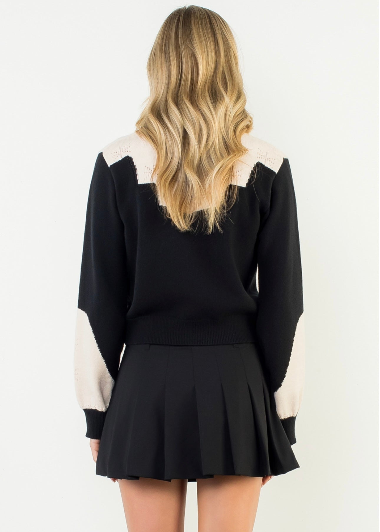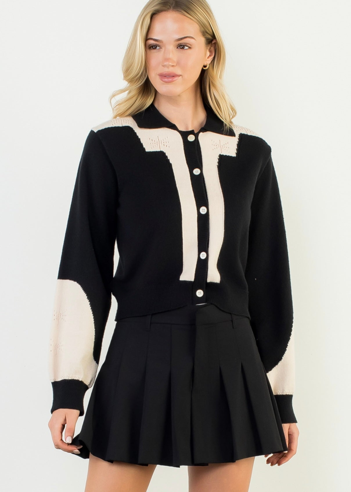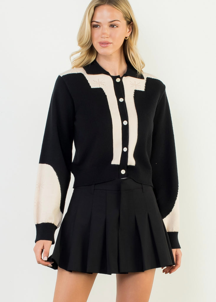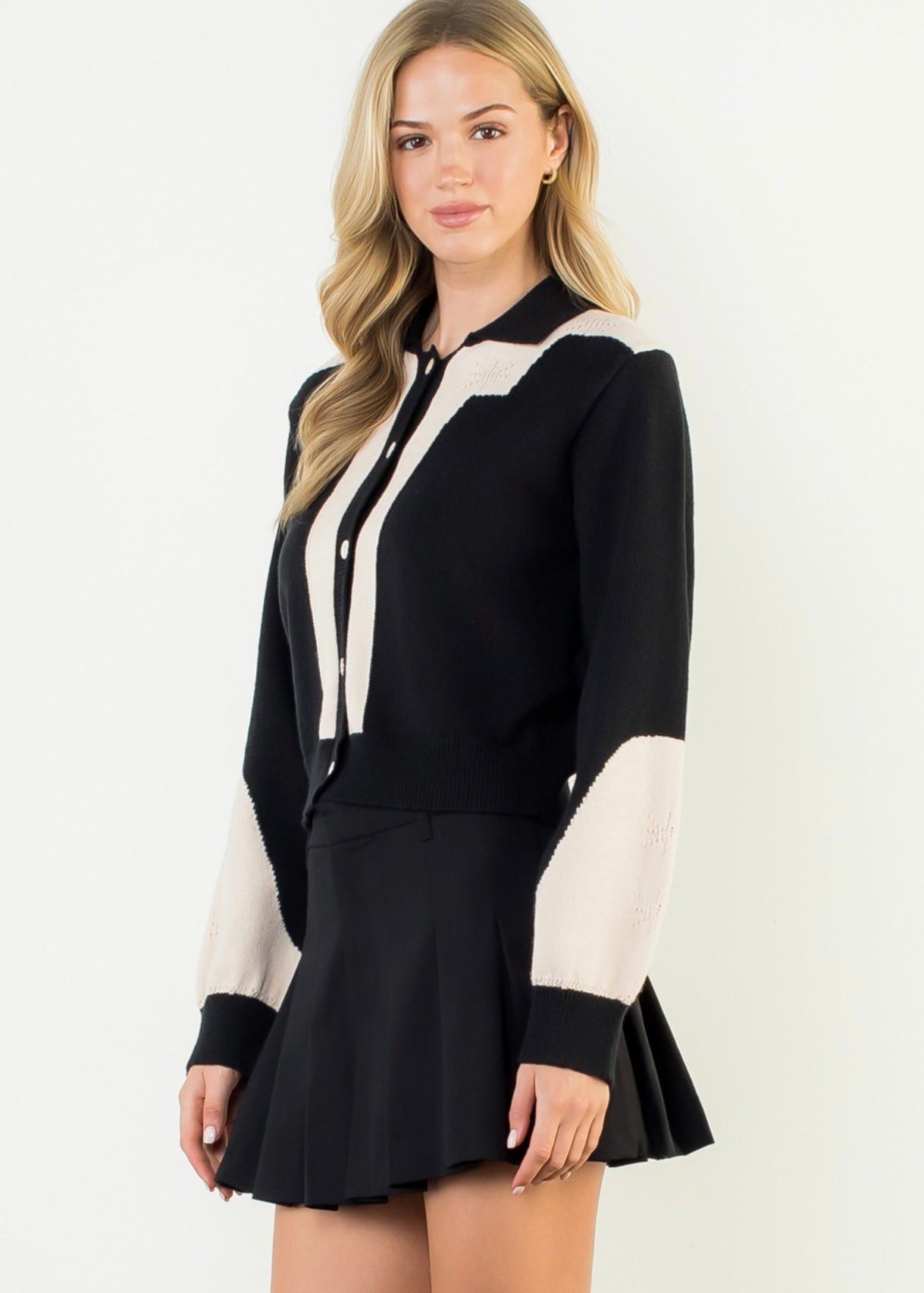 The Nora Cardigan is cute and girly color blocking will make you stand out while still looking professional. Perfect for adding a bit of fun to any outfit.