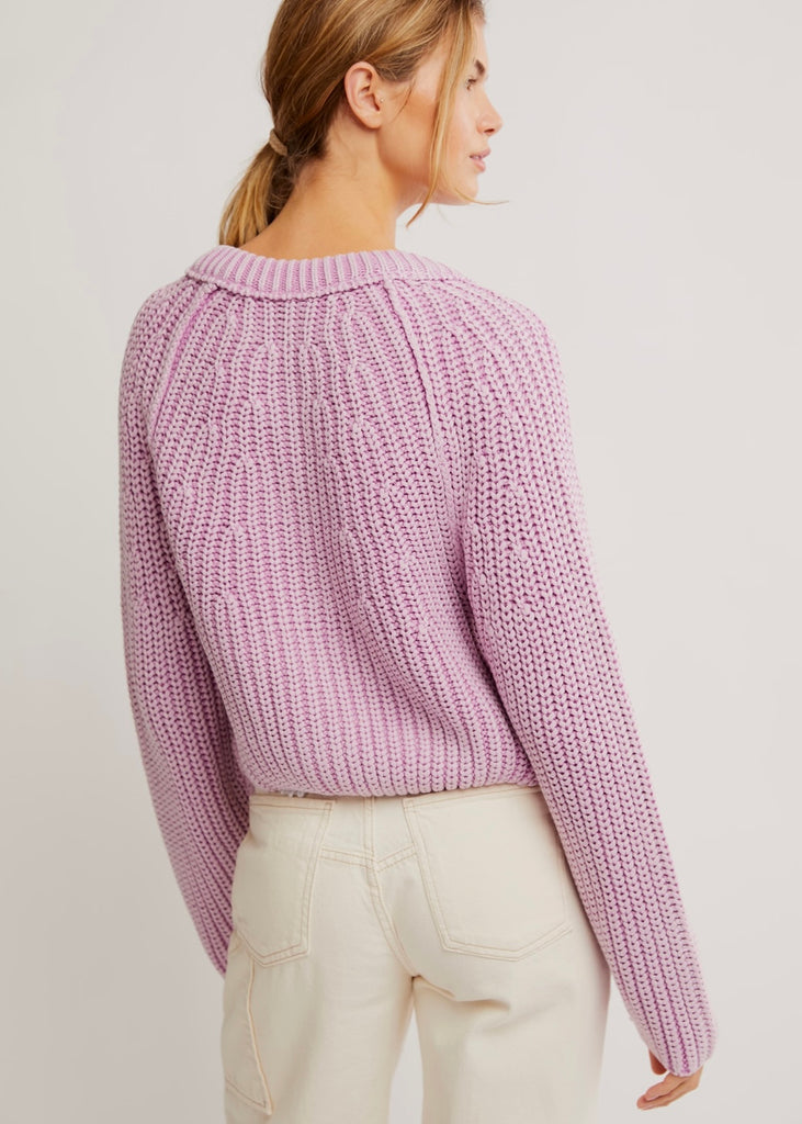 Features: Defined neckline, chunky knit fabrication, button-front closure