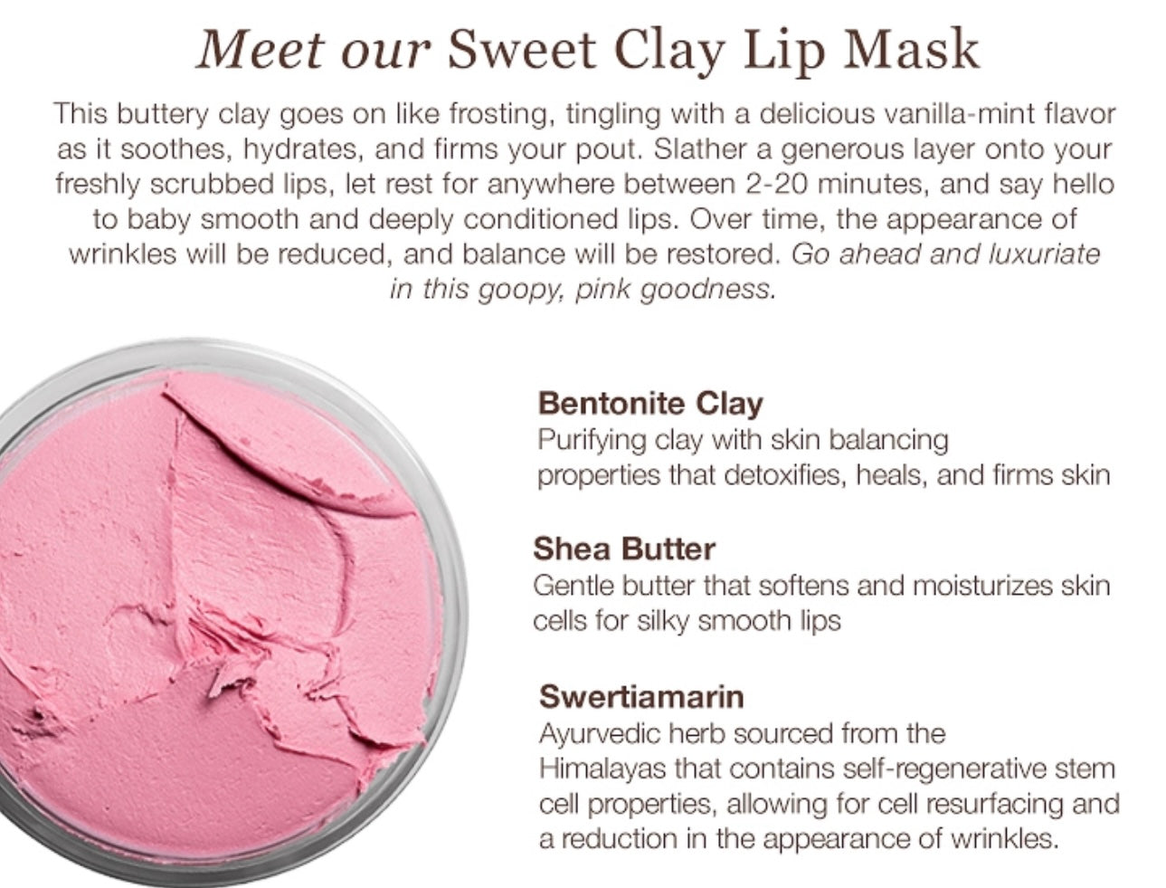 Regenerate your lips with Sara Happ's pink pot of perfection. This rich, frosting-like mask, goes on thick and luxuriously, packed with healing Bentonite clay, softening Shea Butter, soothing natural oils and regenerative Swertiamarin, an Ayurvedic herb sourced from the Himalayans.