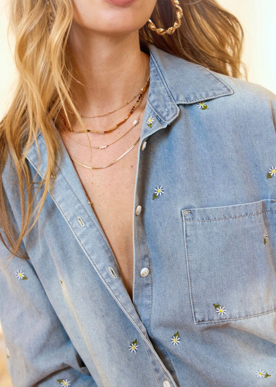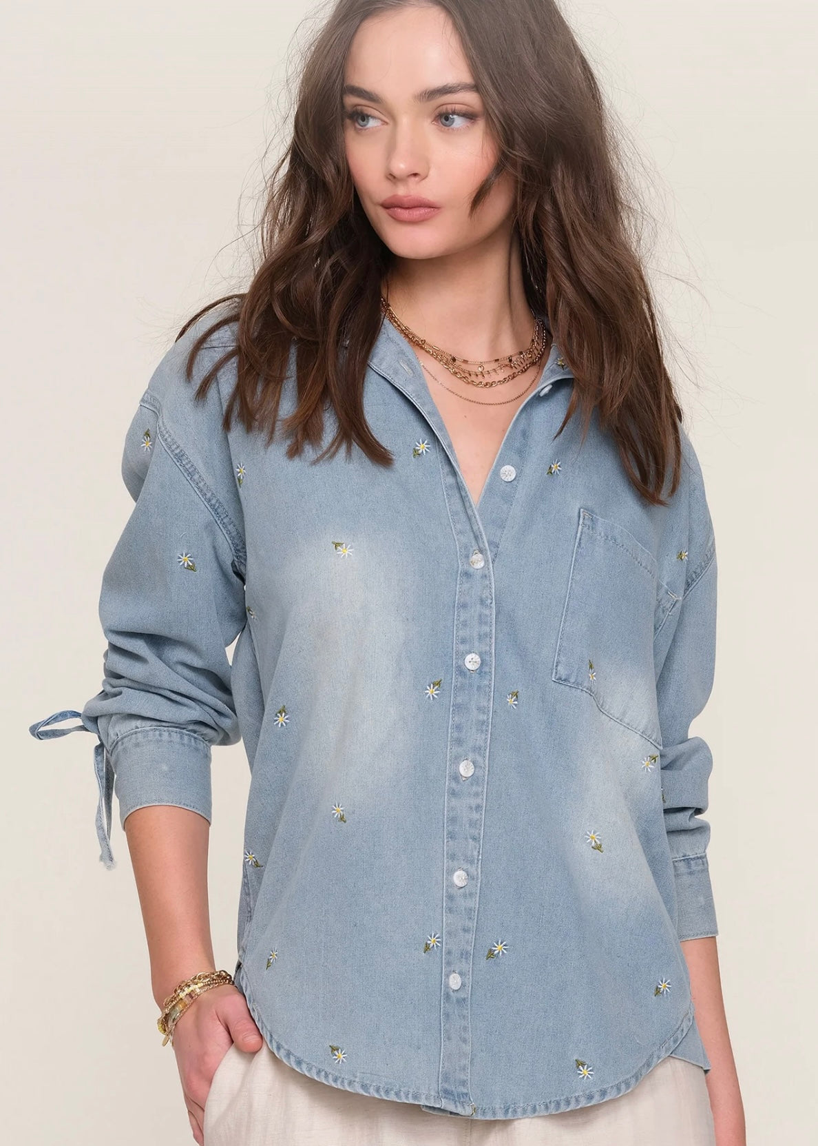 The Harper Shirt is a classic button down with a relaxed fit and rouched sleeves. It's made from a soft, washed denim and adorned with floral embroidery.