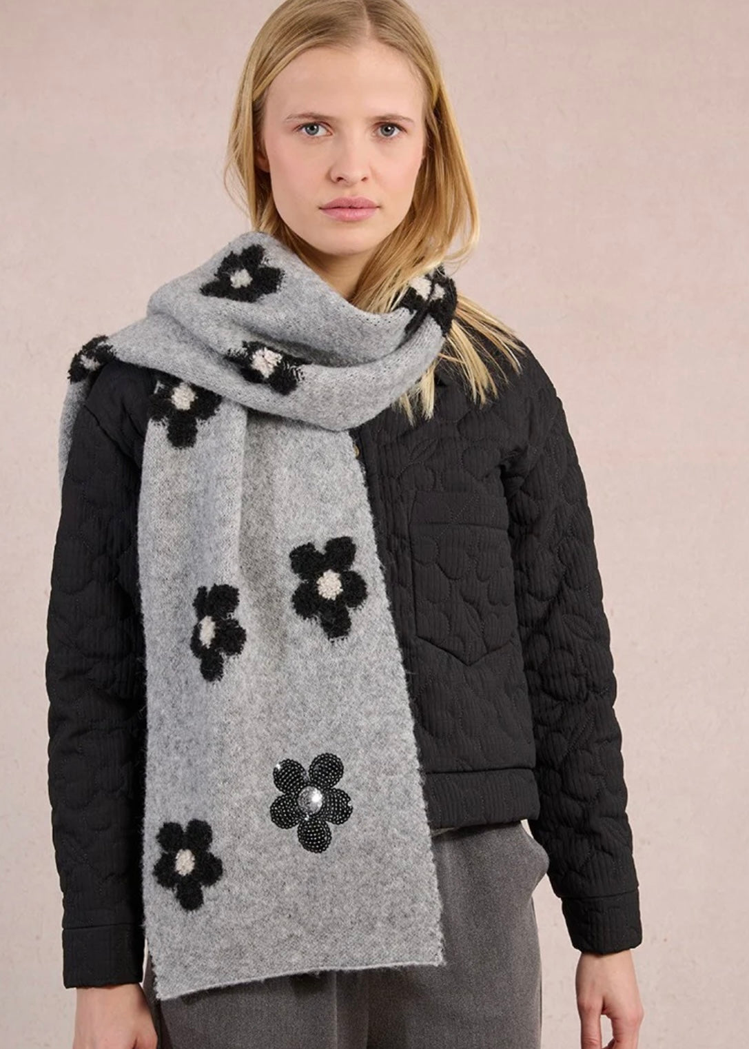Add a touch of sparkle and fun to your outfit with this knitted scarf, featuring a whimsical rhinestone flower pattern. Soft and cozy, it’s the perfect playful accessory to brighten chilly days while keeping you warm and stylish.