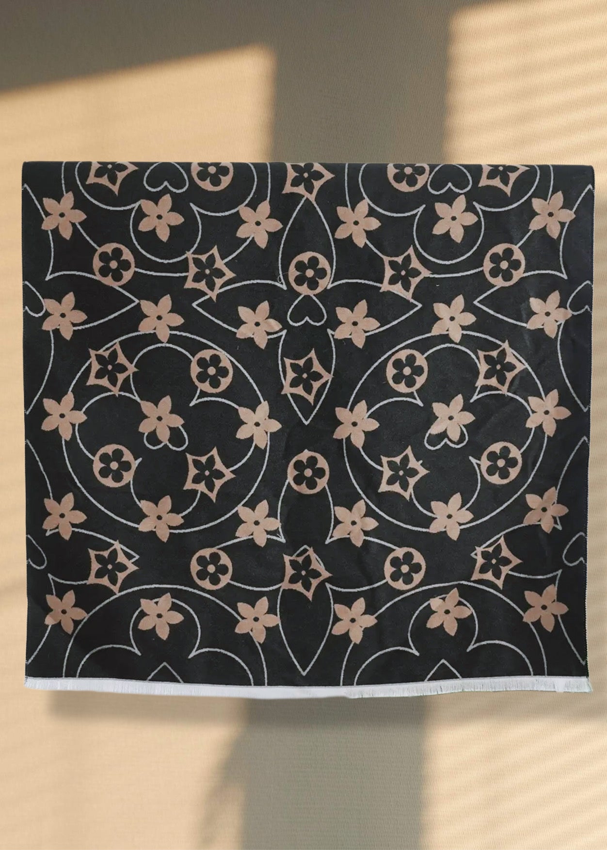 The Midnight Bloom Scarf boasts a delicate FLOWER MONOGRAM PATTERN and lightweight design, finished with a stylish FRINGE EDGE