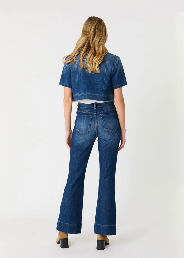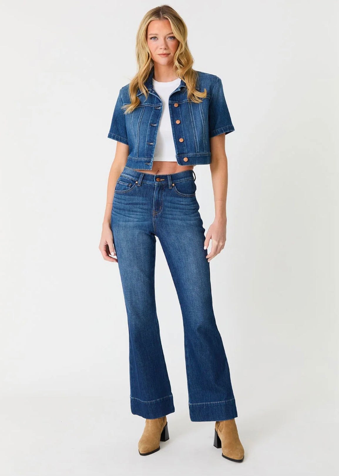 • If you've got shoes to show off, the Claudia Flare is your jean. Designed with a mid-rise and slim fit through the hip and thigh, it finishes in a cropped bootcut leg with an easy raw hem