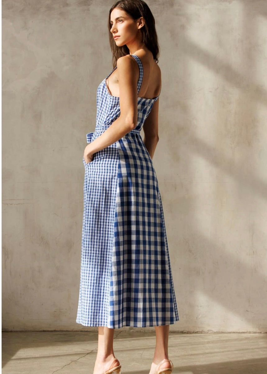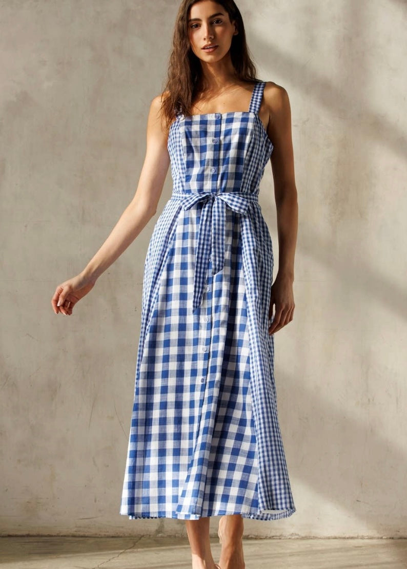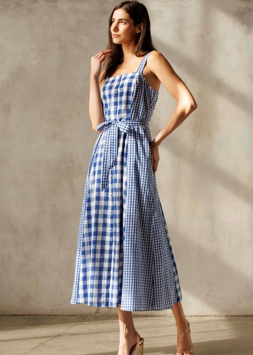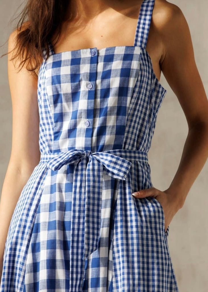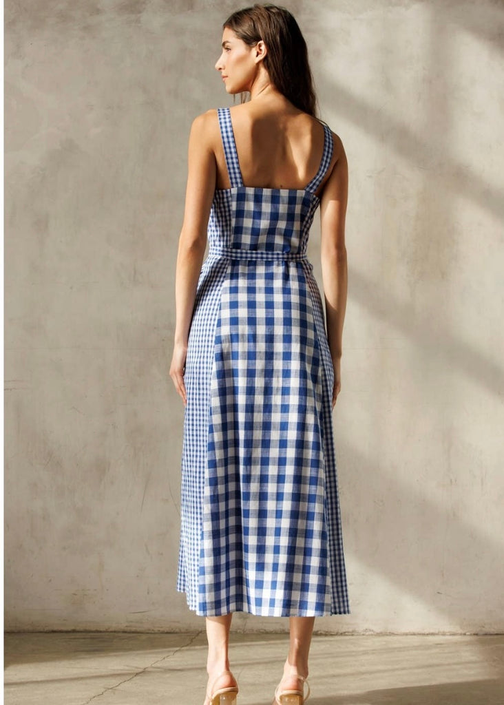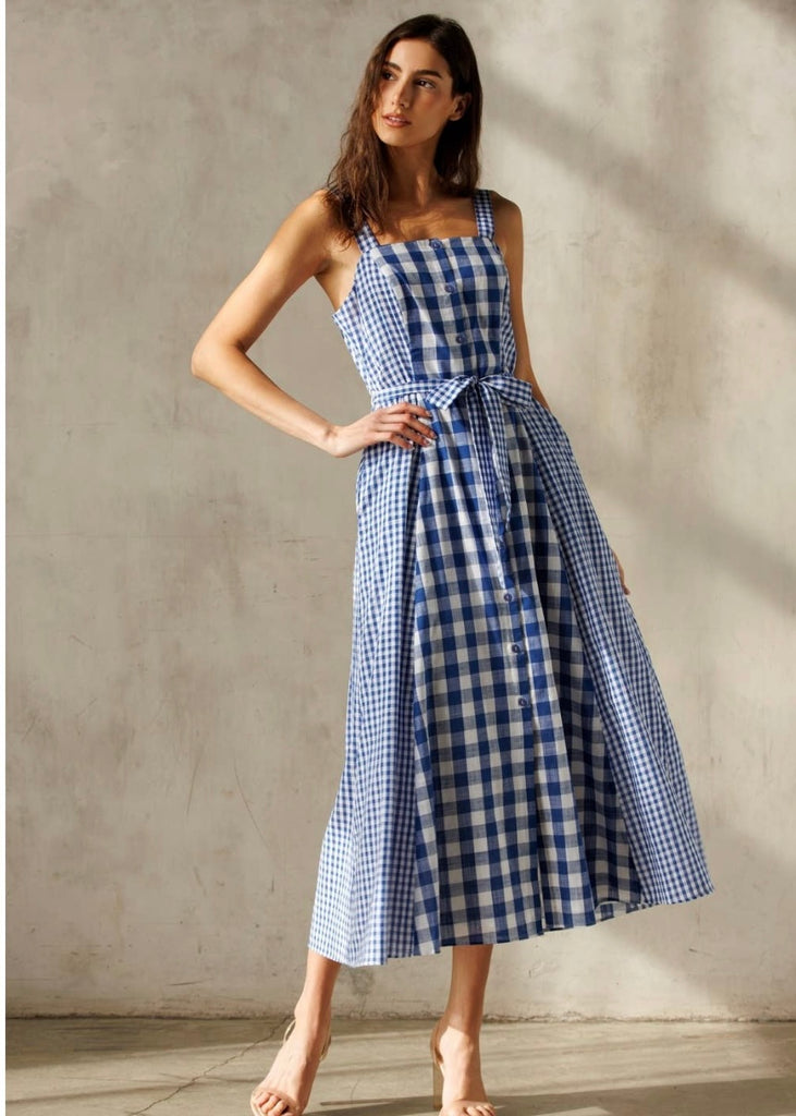 This bold blue gingham midi dress is a refreshing take on a classic summer staple. Featuring a flattering square neckline and thick shoulder straps, the dress boasts a tailored bodice with button-down details and a waist tie that adds definition and charm. The contrasting gingham panels create visual interest, while the full, flowy skirt and side pockets ensure comfort and practicality.