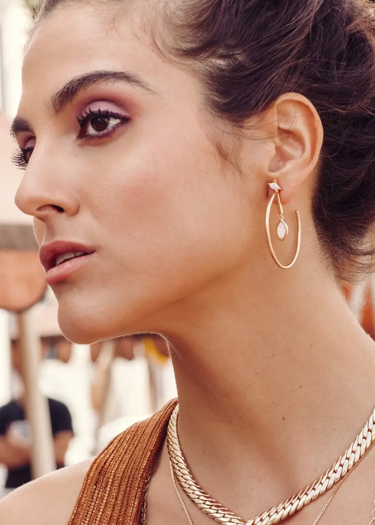 Gemstone marquise charms dangle and shimmer on these not so basic hoops.
