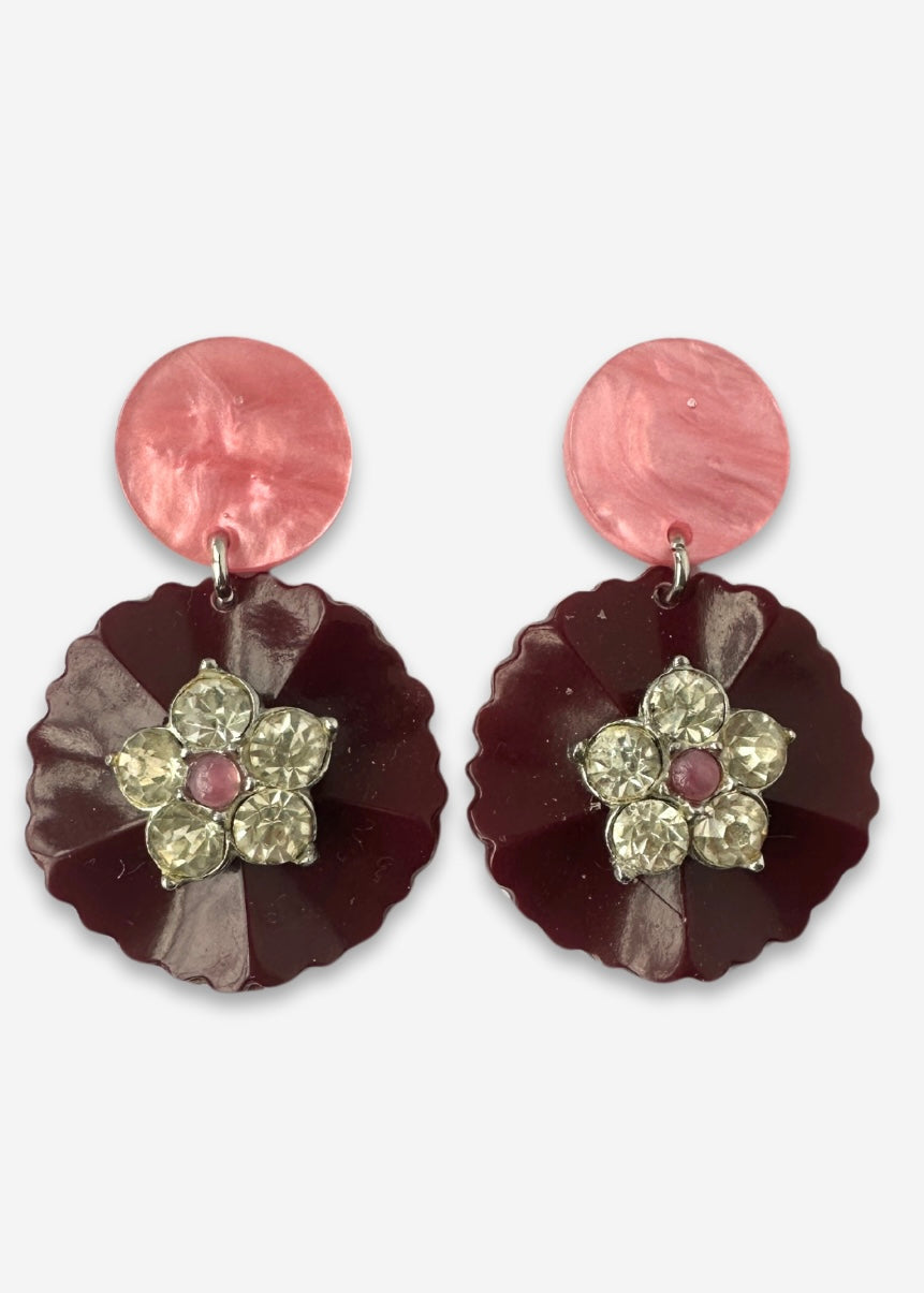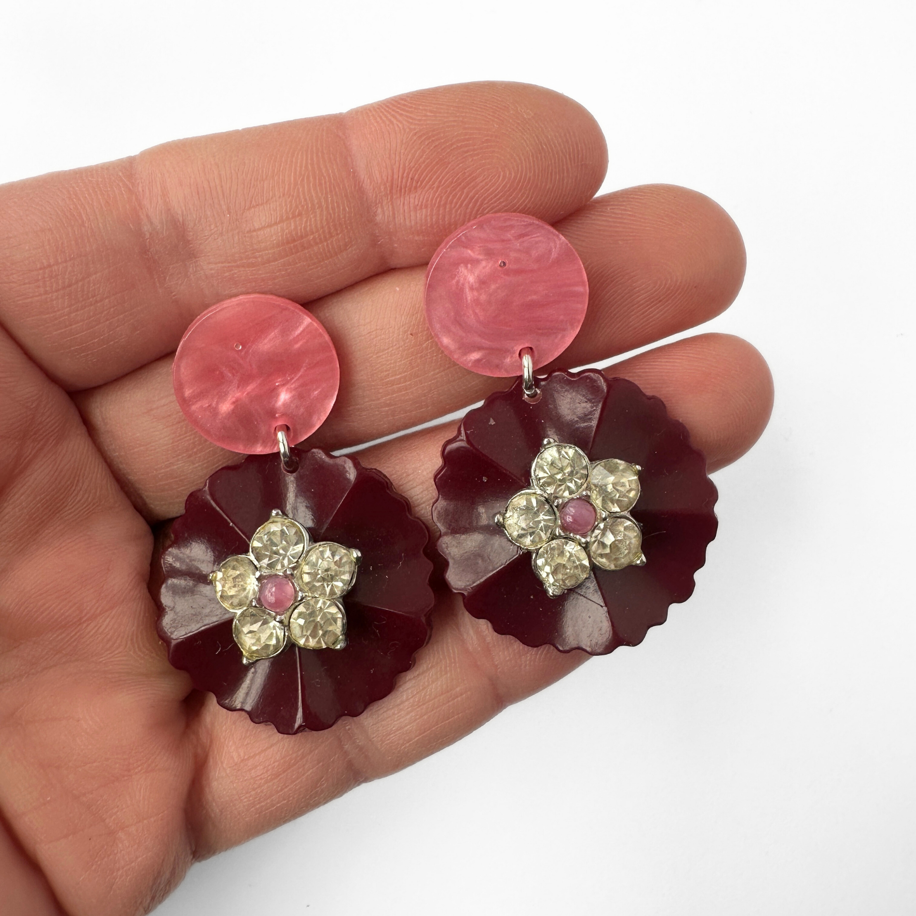 • Vintage burgundy bakelite scalloped buttons, embellished with vintage rhinestone flowers