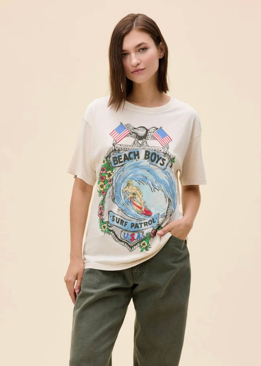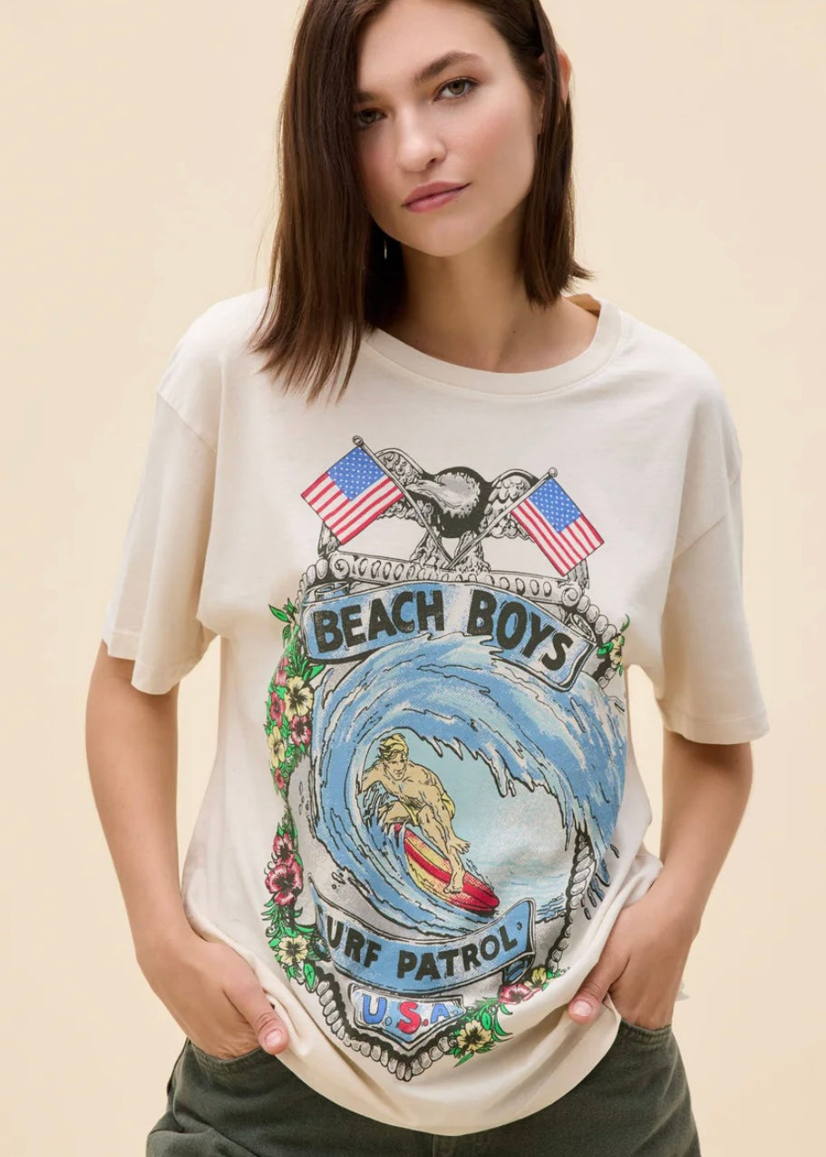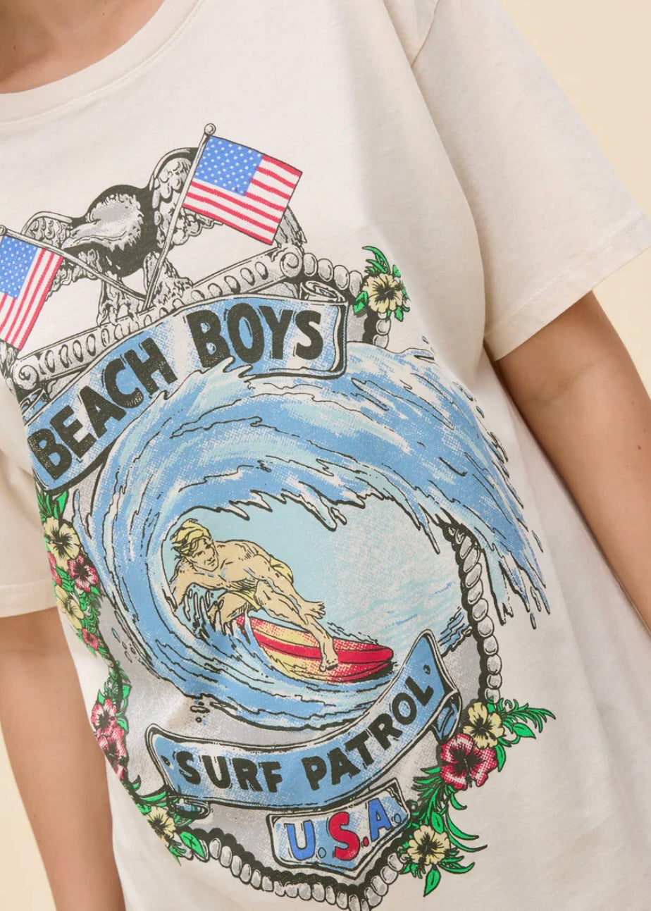 Establishing California culture with a surf-rock sound, The Beach Boys' surf patrol artwork of a sheriff's badge hits as an emblem on this Boyfriend Tee. Stamped with the group's track Catch A Wave, it's sure to be a fan-favorite.