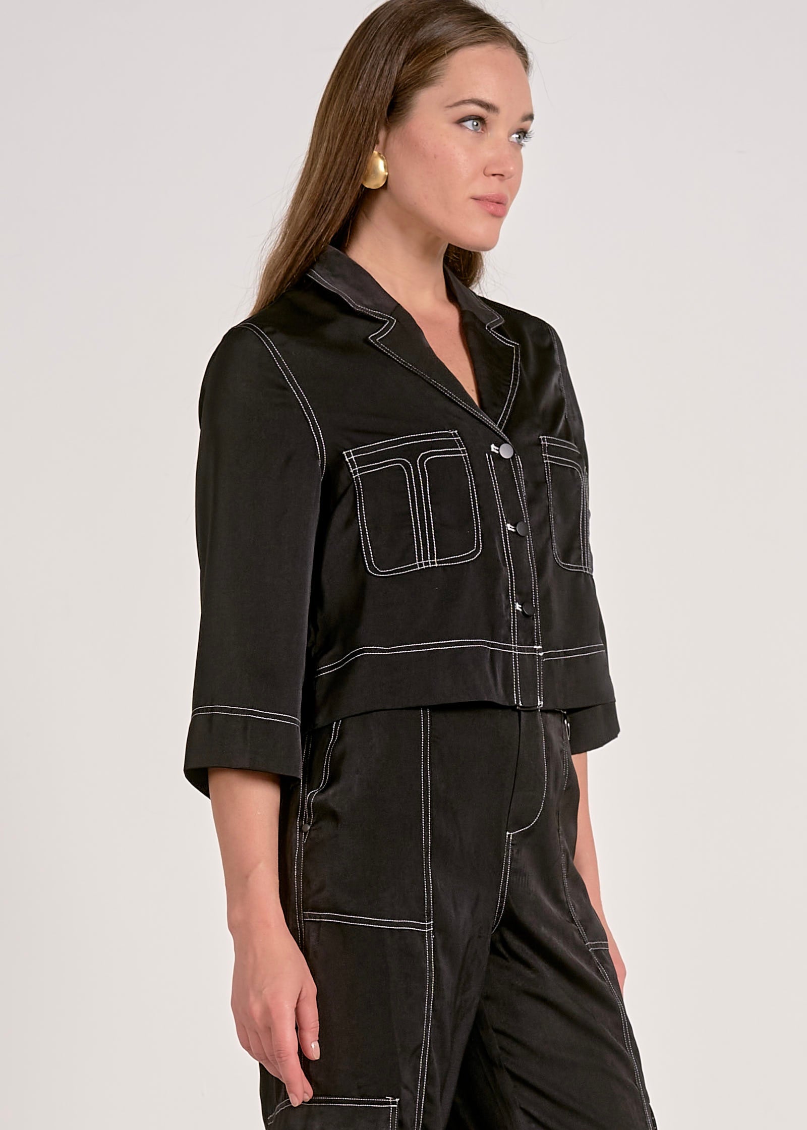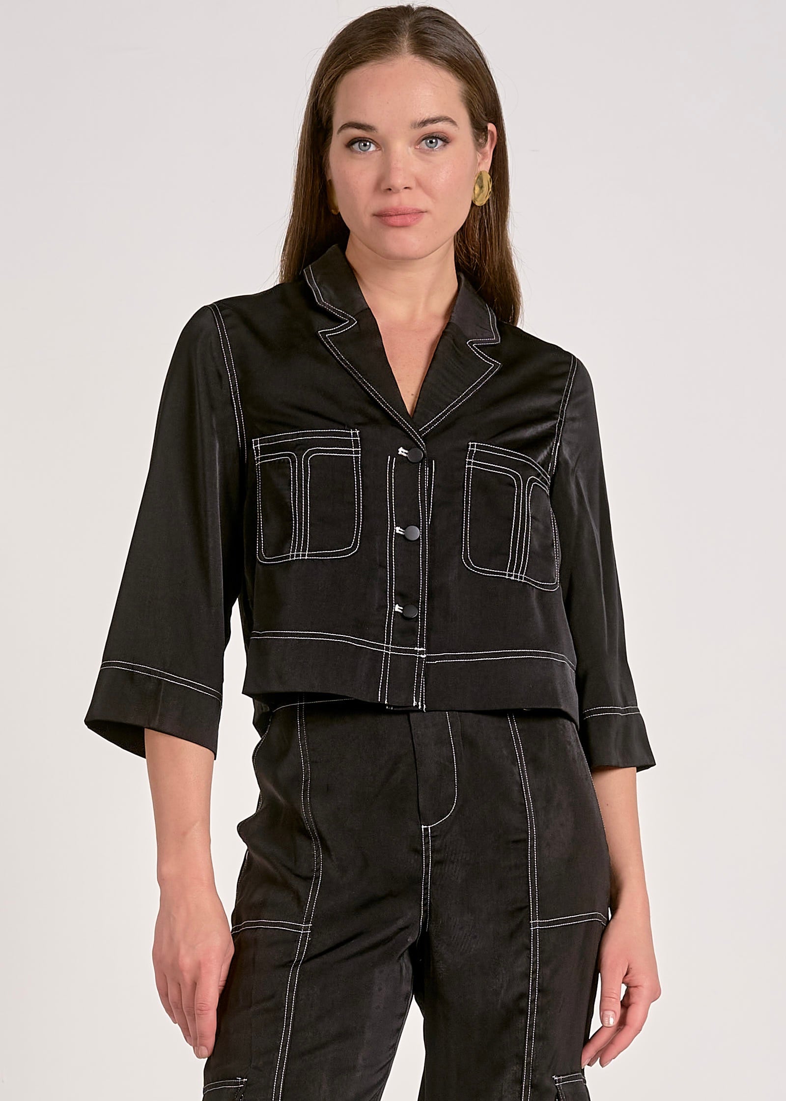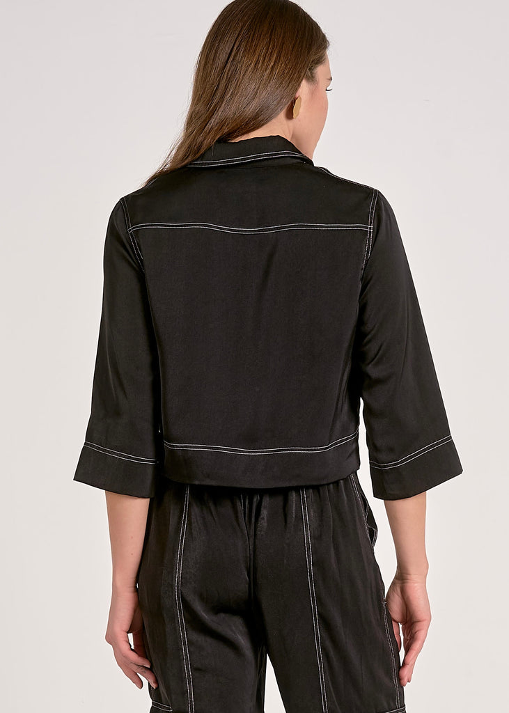 Elevate your style with the Jackie Button Up—a black 3/4 short sleeve shirt featuring eye-catching white contrast stitching. Perfect on its own or paired with the matching Jackie Cargo Jogger Pant, it’s your new go-to for effortless chic vibes. Playful, polished, and oh-so-comfy!