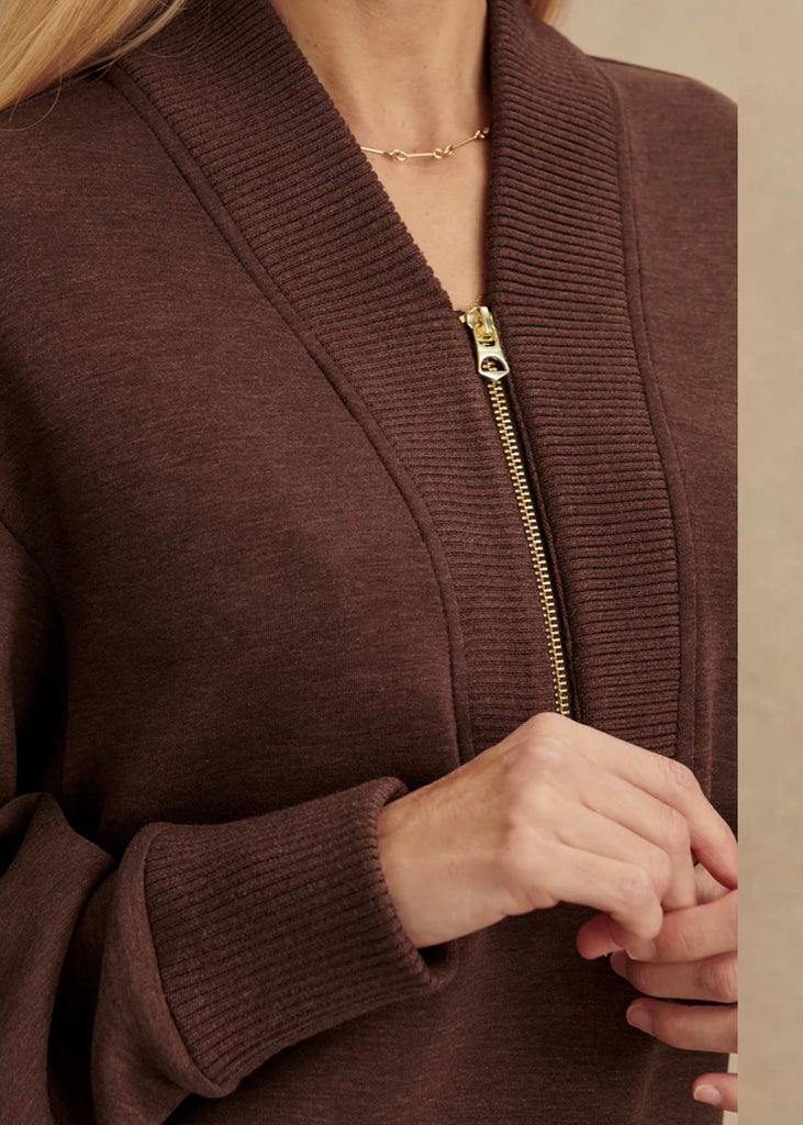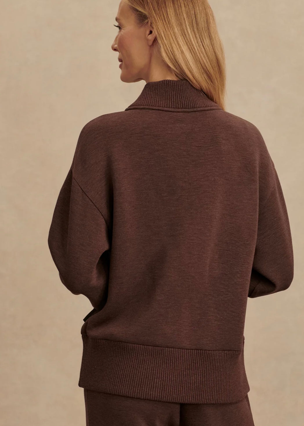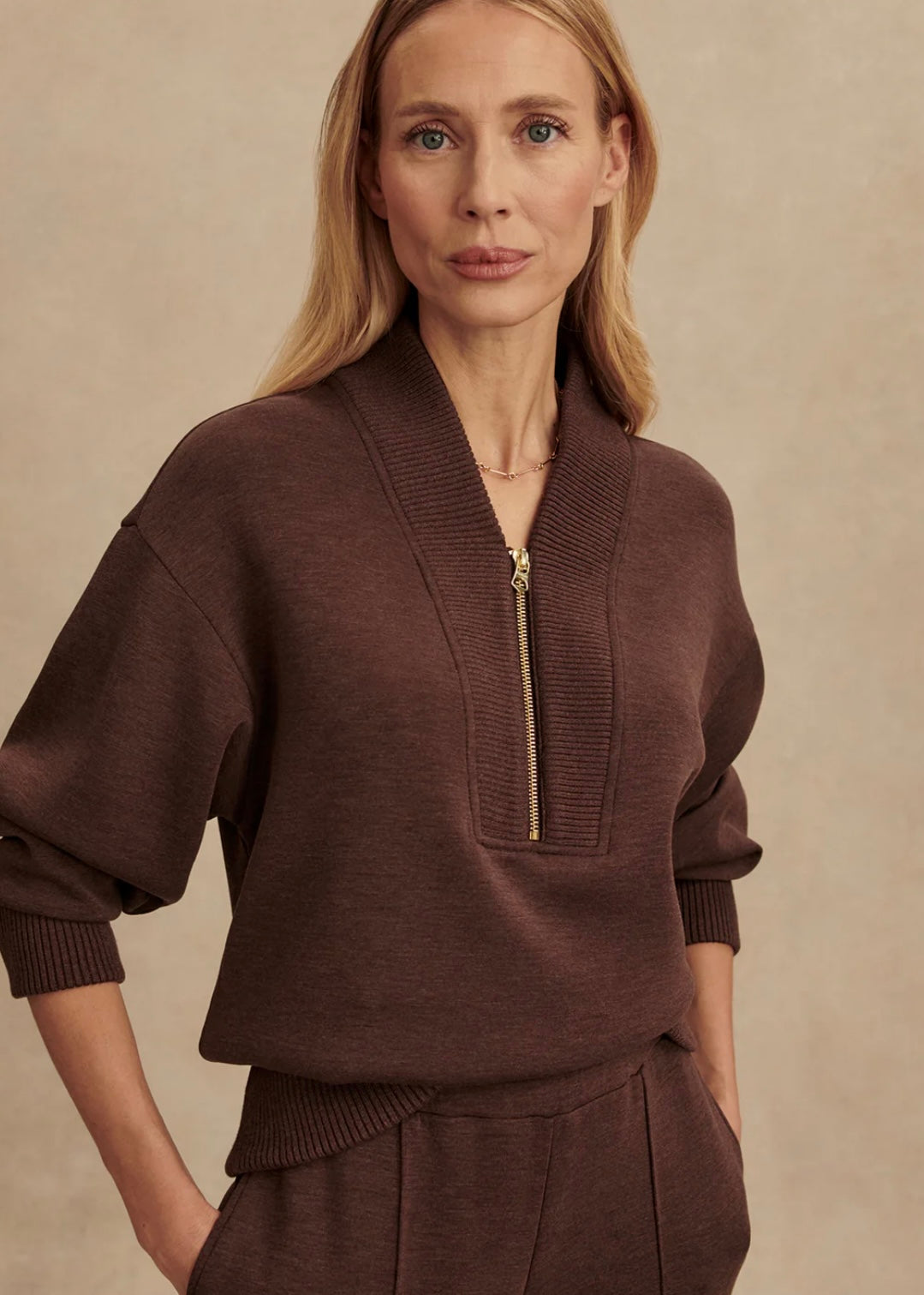 Perfect for everyday layering, the Sally half-zip sweat is a new take on our bestselling Davidson sweat. Crafted from our signature DoubleSoft® fabric, it is accentuated with chunky rib knit detailing on the V-neckline panel, the hemband, and the cuffs. Cut to a regular length, with long sleeves and a dropped shoulder, it is a versatile style for any day.