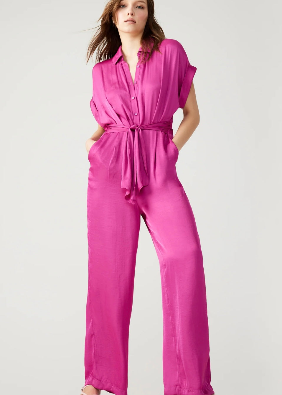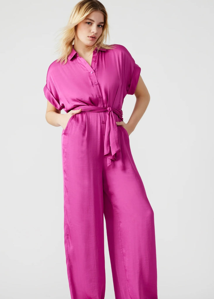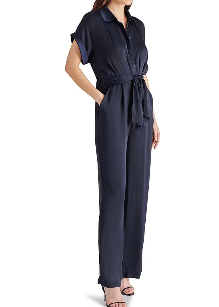 Introducing the Tori Jumpsuit! This washed satin jumpsuit features a tie front detail, wide-leg pants, and dolman sleeves. With a button front, collar neckline and rolled sleeves, this jumpsuit is perfect for any occasion. Elevate your style with this satin beauty.