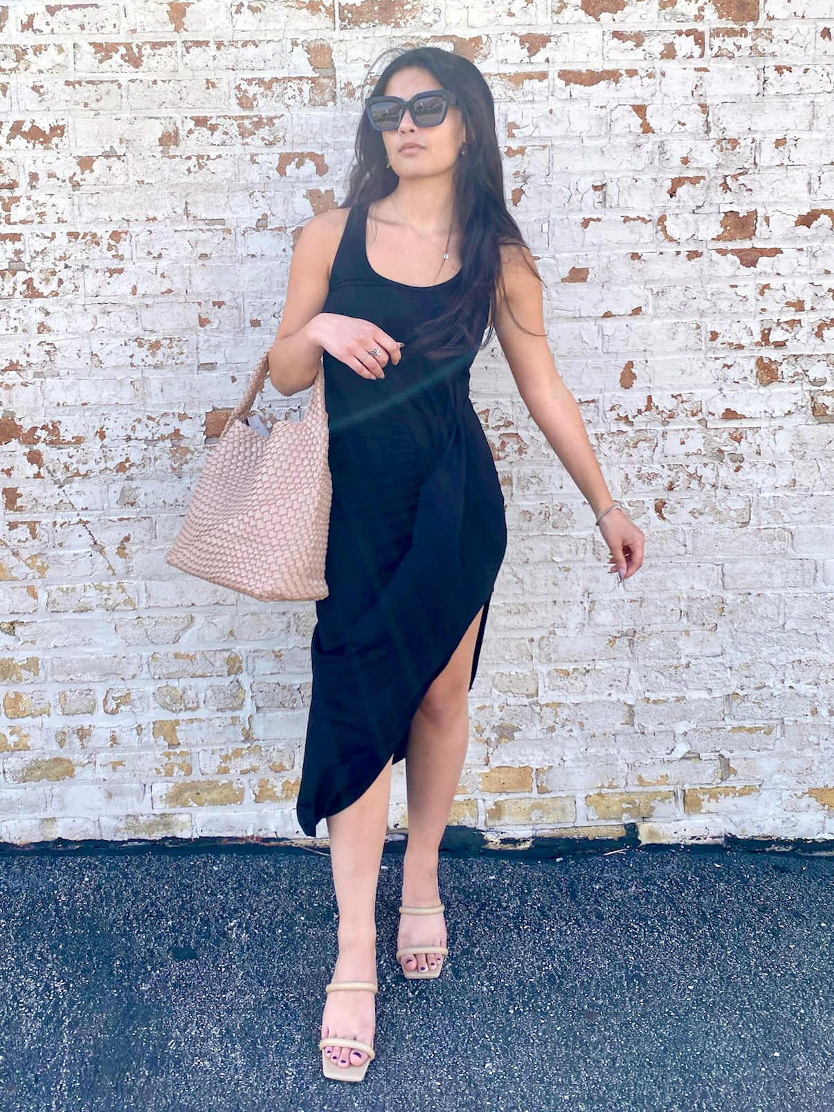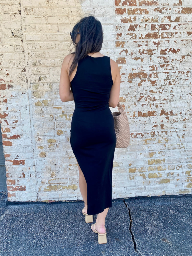 This chic draped dress features an asymmetric hem, pleat details at the waistline, and is made from a soft, supple fabric. A dress that can easily style up or down!