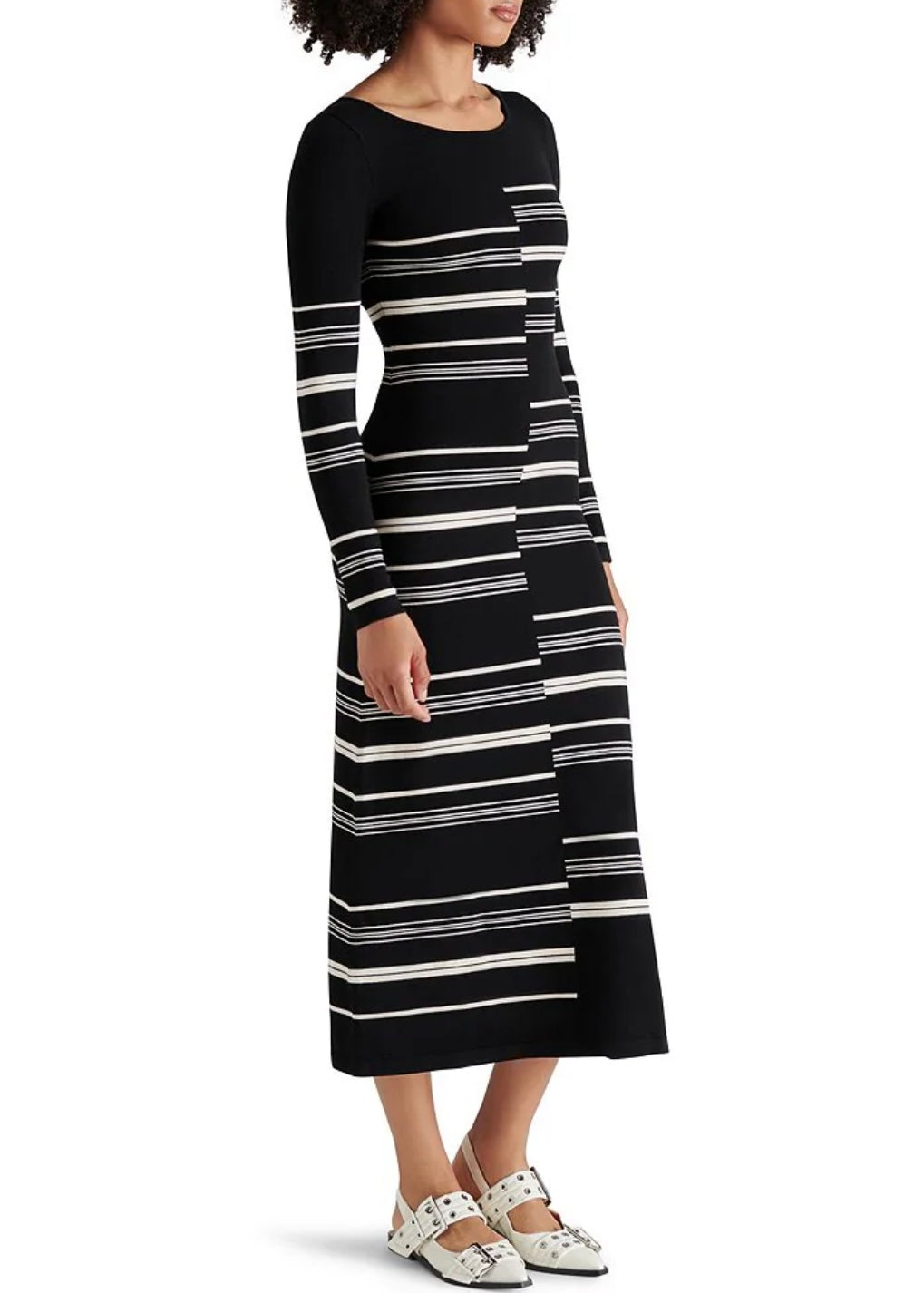 The Rayssa Sweater Dress features a cozy knit fabrication, making it the perfect cold-weather option. With a classic crew neckline and long sleeves, this dress is both stylish and functional. The stripe print adds a touch of elegance, while the pullover construction makes it easy to wear. Stay warm and fashionable with the Rayssa Sweater Dress.