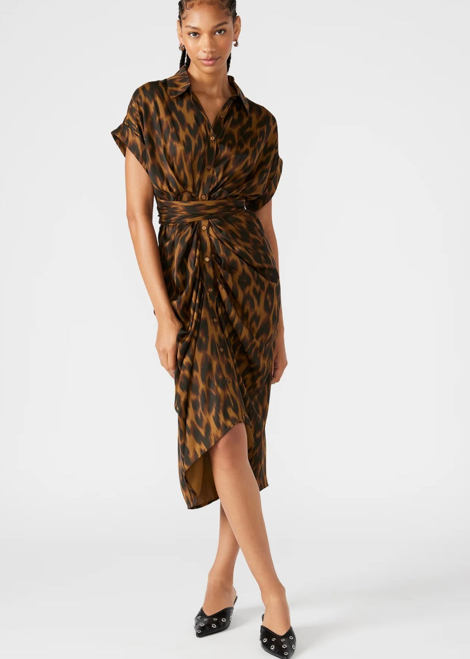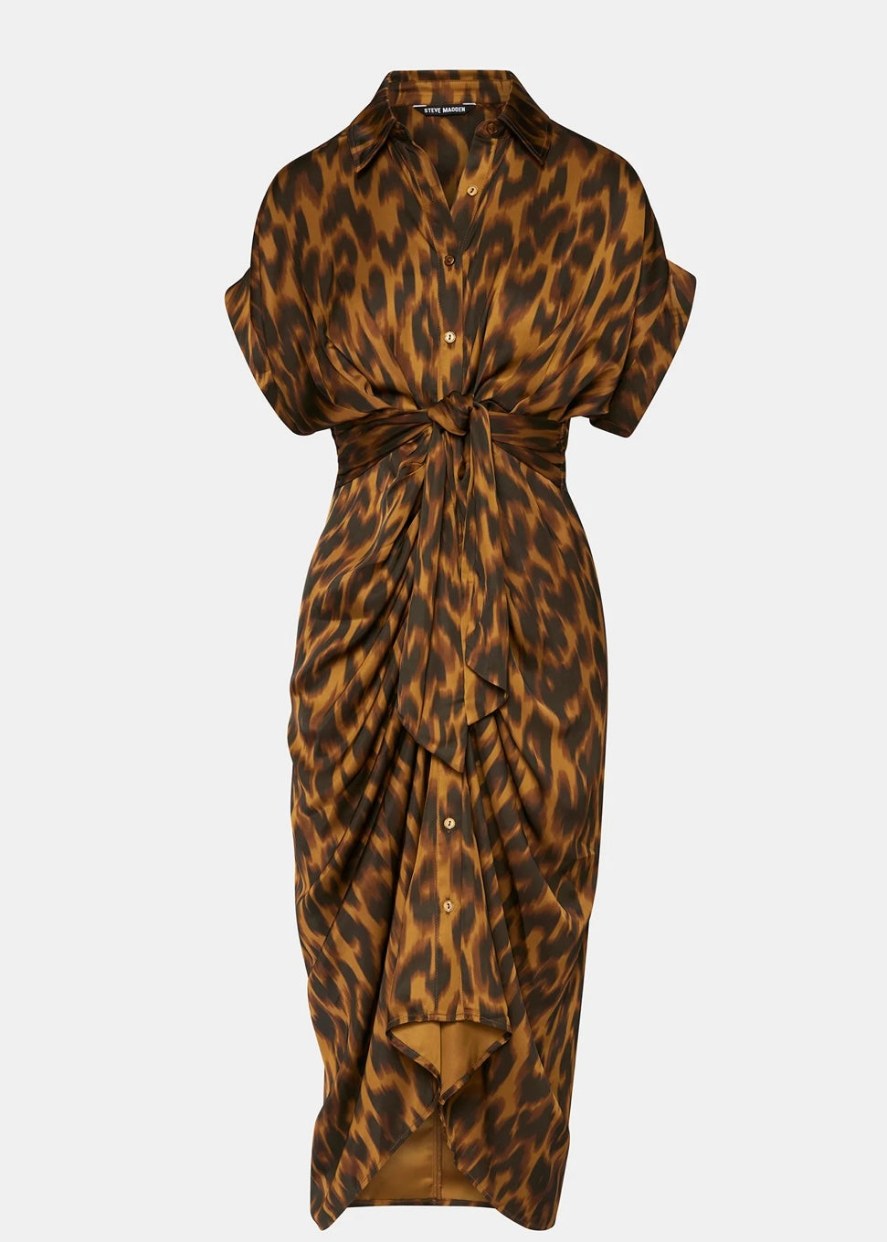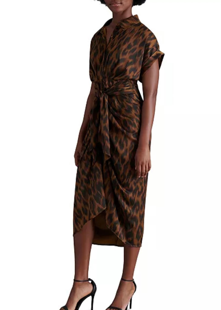 This dress has a rolled collar and cuffed short sleeves, with an adjustable gathered tie-front waist and a high-low hem. The dress is finished with a washed satin texture, giving it a polished look.