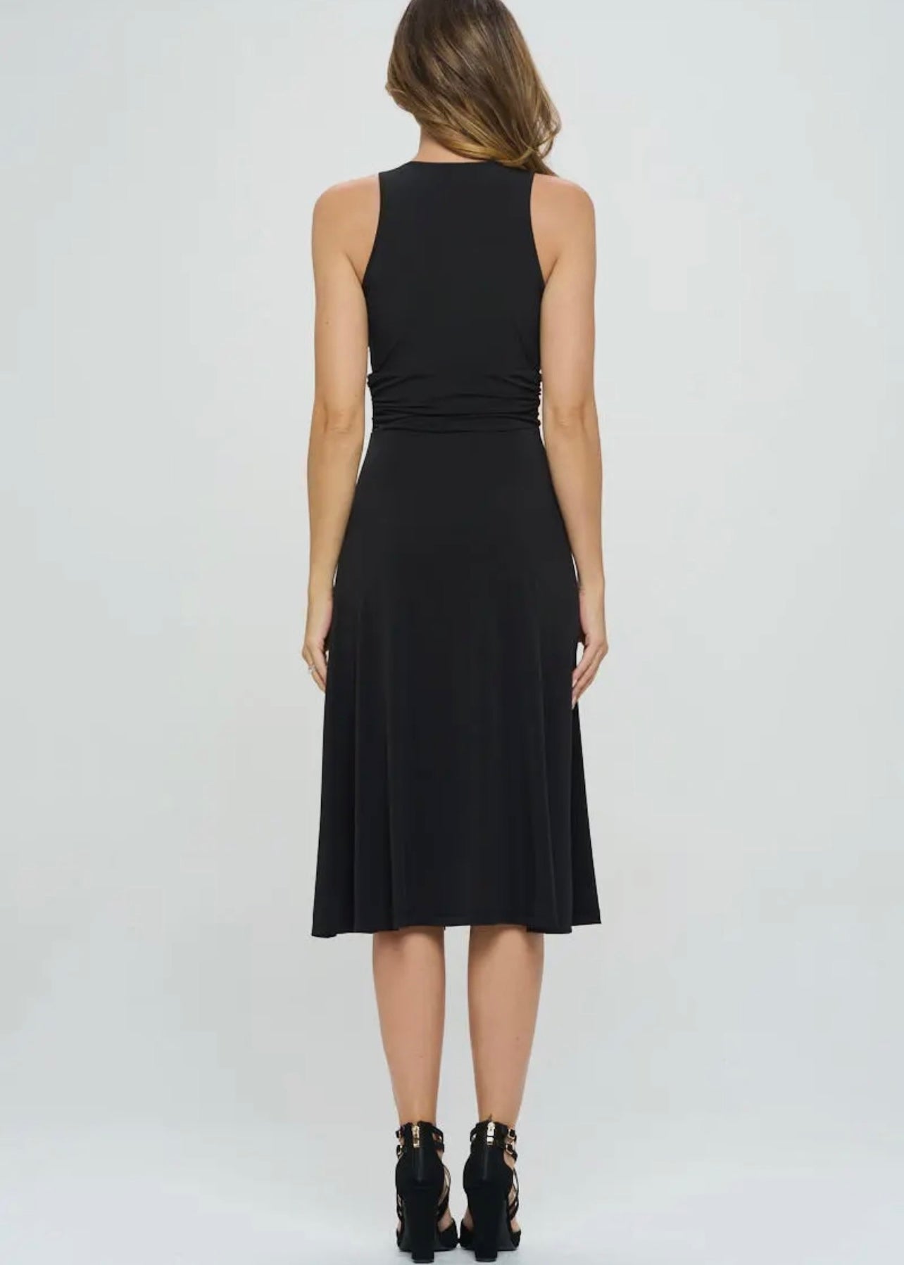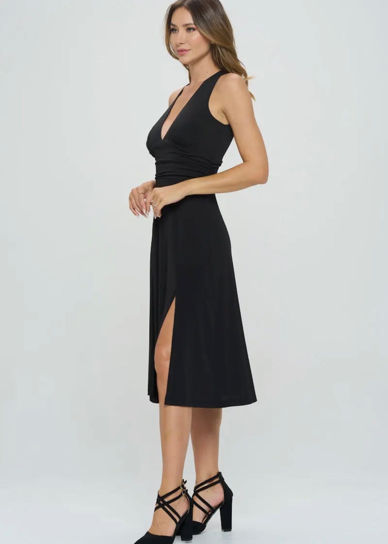 Get ready to turn heads with the Amy Dress. With its stunning solid black design, deep V neckline, and side slit, you'll be the envy of everyone in the room. The rouching at the waist adds a touch of elegance to this must-have dress.
