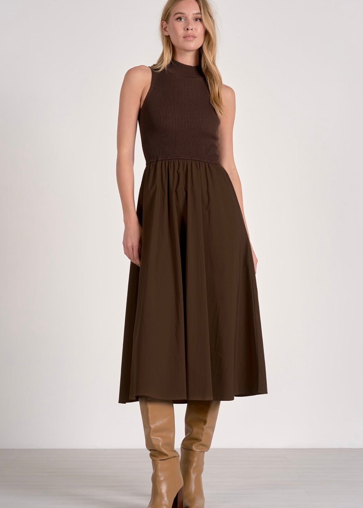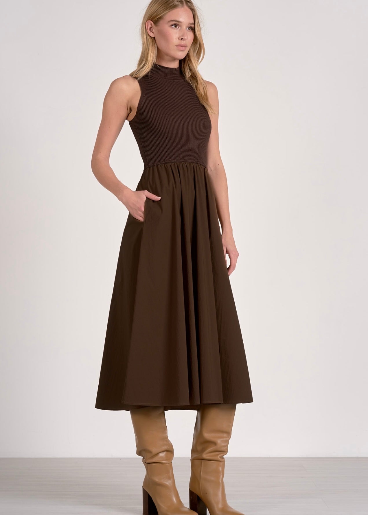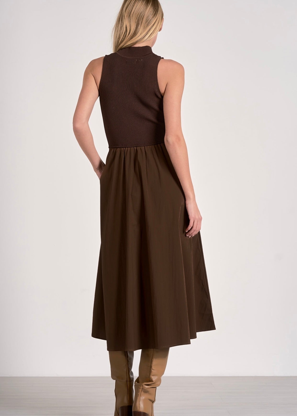 Step into style with the Cocoa Dress, a fun midi featuring a chic mock neckline and sleeveless design. Crafted from mixed media fabrics, this dress blends texture and comfort effortlessly. Its rich Cocoa hue captures the season’s must-have color, making it perfect for turning heads wherever you go.