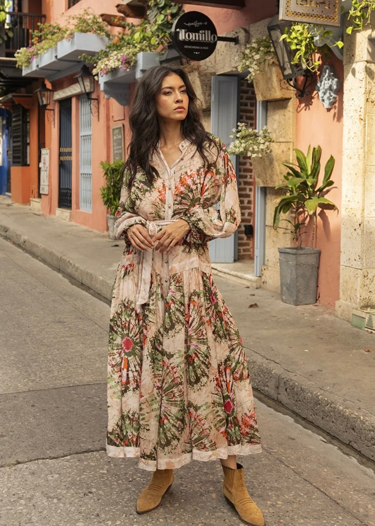 The Juana Dress: fashionable, flowy, and perfect for your next adventure. With its boho vibes and airy design, this dress is made for travel. Stay stylish and comfortable in this must-have piece!