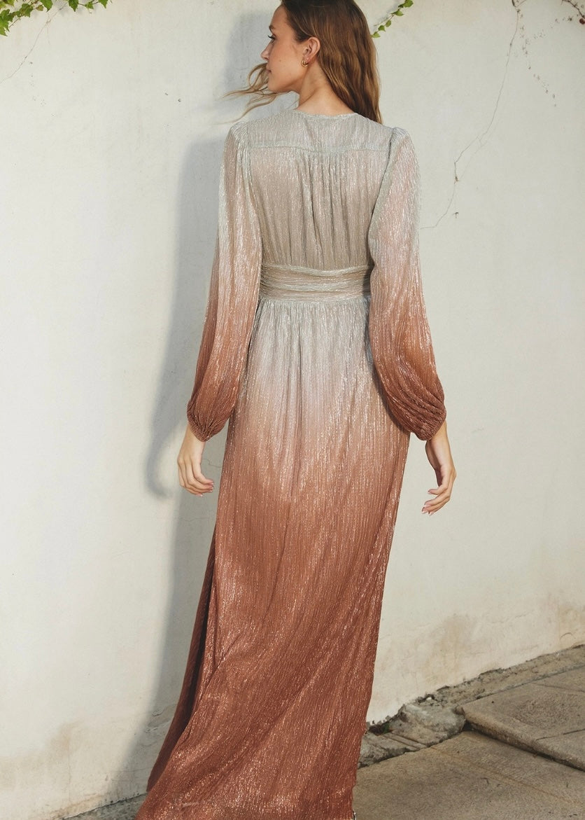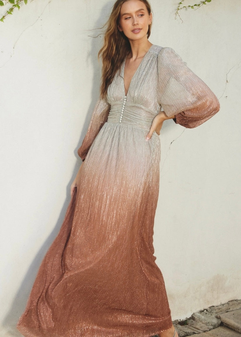 Shimmer and shine in our Starlight Maxi Dress! This bold dress features a plunging neckline and ruched waist with a playful button detail. The metallic dye print catches the light, making you the star of any event. Plus, with hidden zippers and bubble sleeves, you'll be both stylish and comfortable all night long.