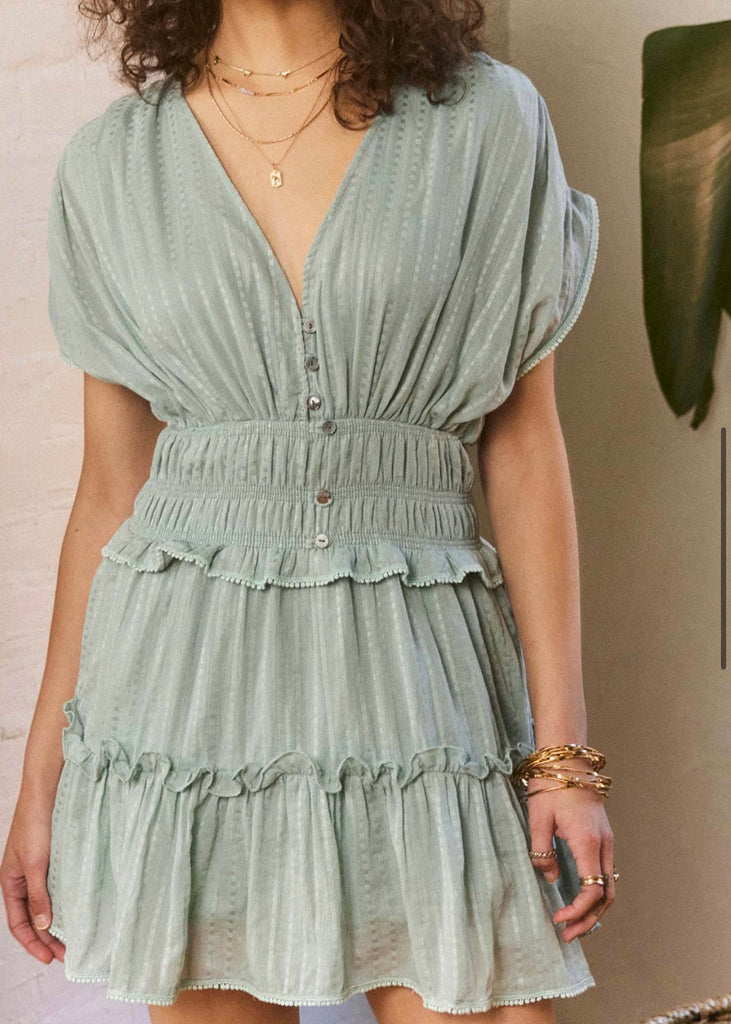 The Baxter Dress is effortlessly cool. Crafted from soft striped voile, it features elastic waist seams, dropped shoulders, and self-ruffles. Delicate pompom trim embellishes the sleeve and ruffle edges.