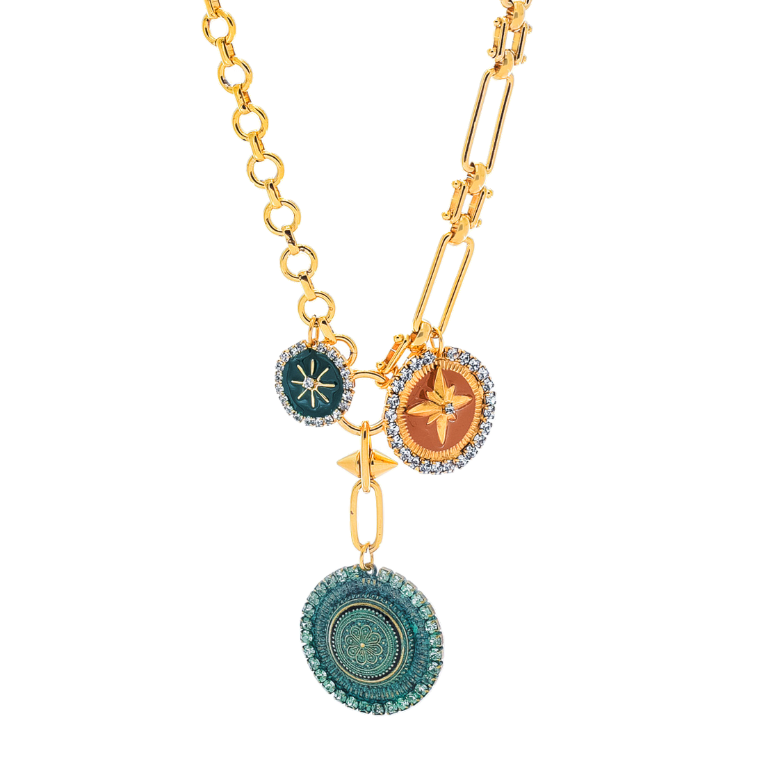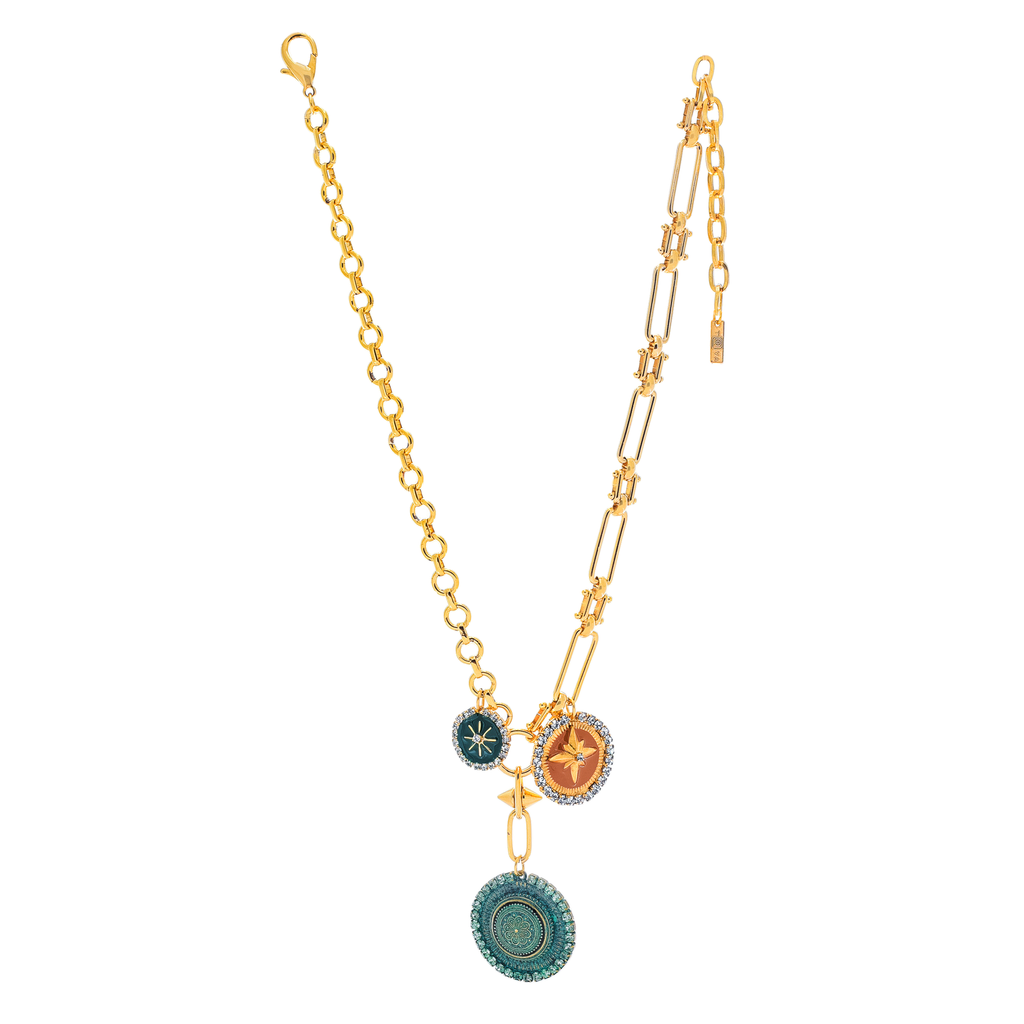 Featuring antique gold plating and hand painted enamel charms, this playful piece is adorned with high quality crystals