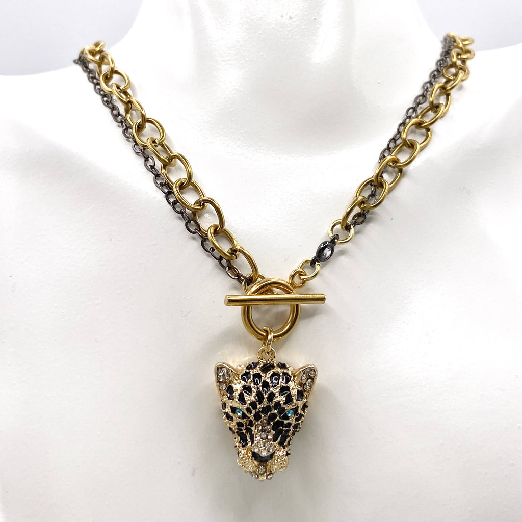 • Necklace: 19”Mixed non tarnishing chains design with toggle clasp + cheetah pendant