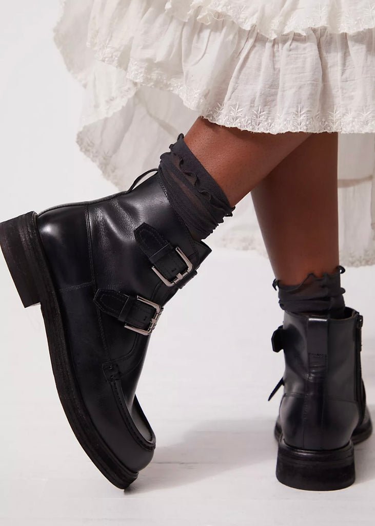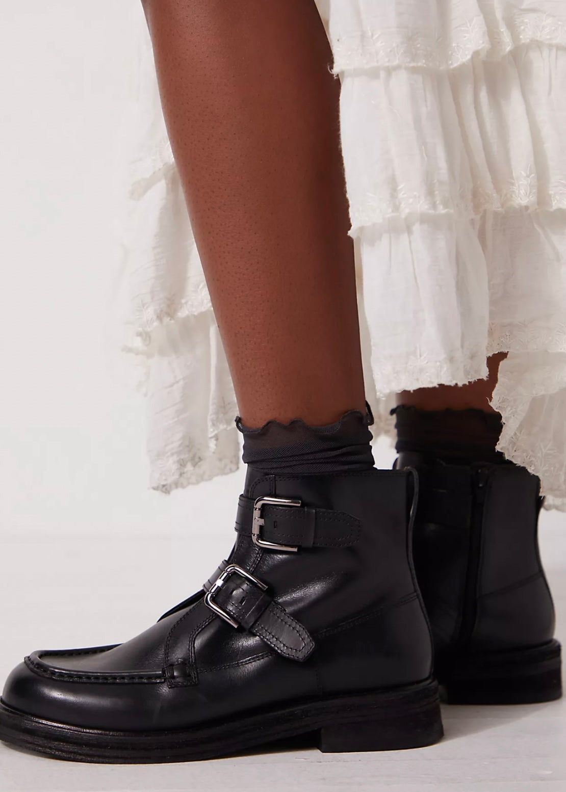 * Features: ankle length, leather uppers, round toe, raised seam, adjustable double-buckle closure, inner ankle zipper, pull tab, flat rubber outsole