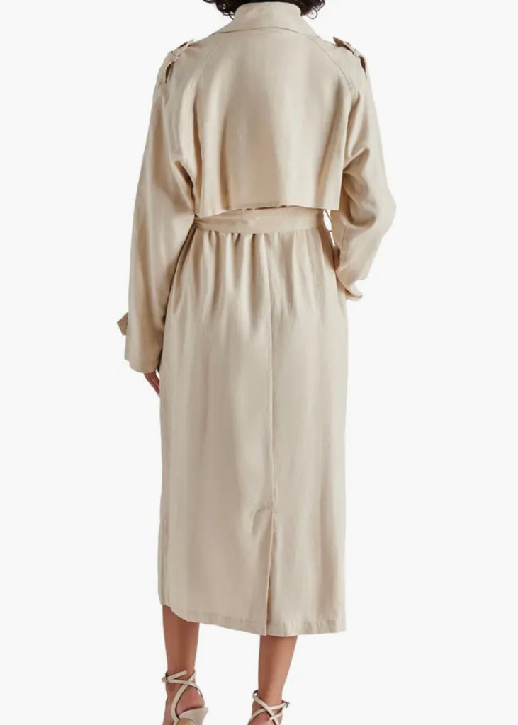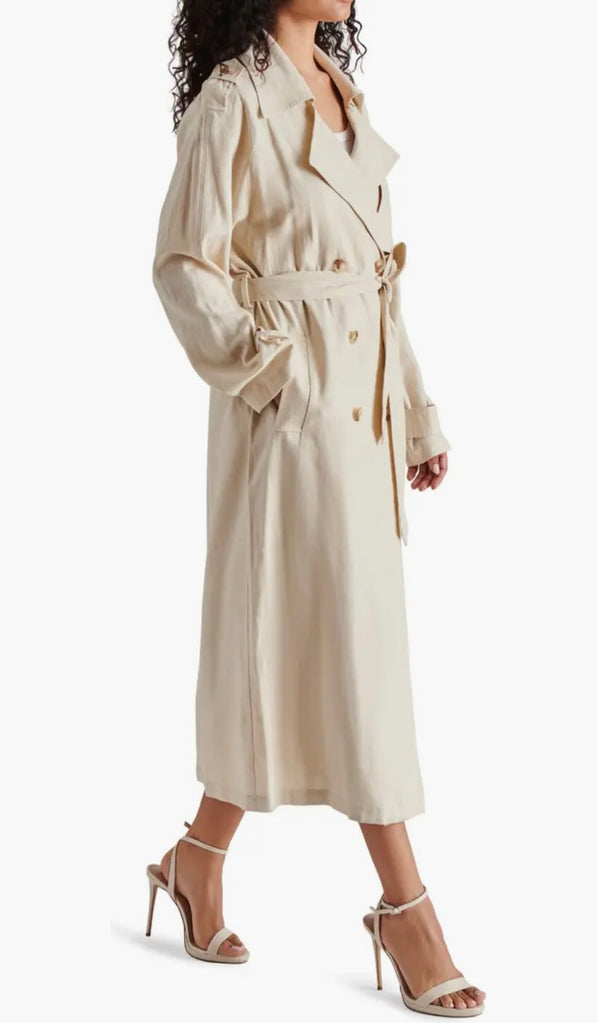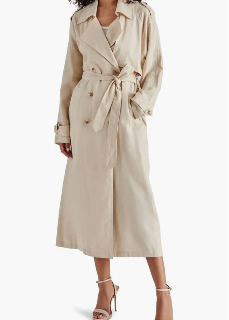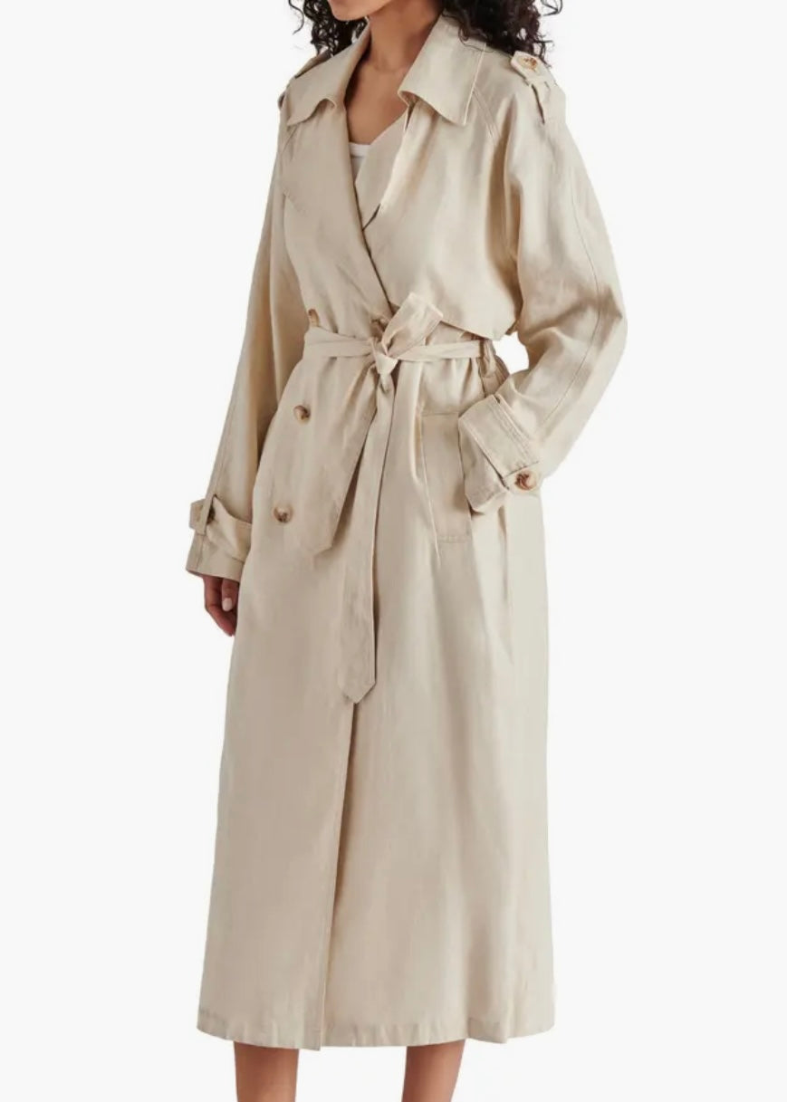 Transform your wardrobe with the Lennox Trench, featuring a linen-forward fabric for a relaxed yet refined look. This classic trench boasts double breasted closure, notched lapels, and a removable sash for versatility. Stay stylish and comfortable with front welt pockets and a back vent for ease of movement. Perfect for any occasion!
