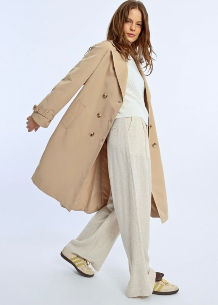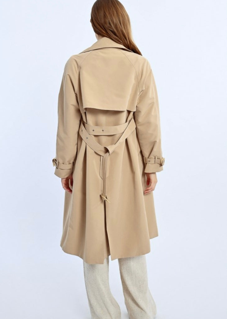 The Liza Trench is a timeless classic with a modern twist. This long trench coat features long sleeves and strapped cuffs for added comfort and style. The wide collar and double breasted design are both functional and fashionable. Complete with a crossed button closure and a wide belt to cinch at the waist, this coat also boasts a wide slit on the lower back for added movement.