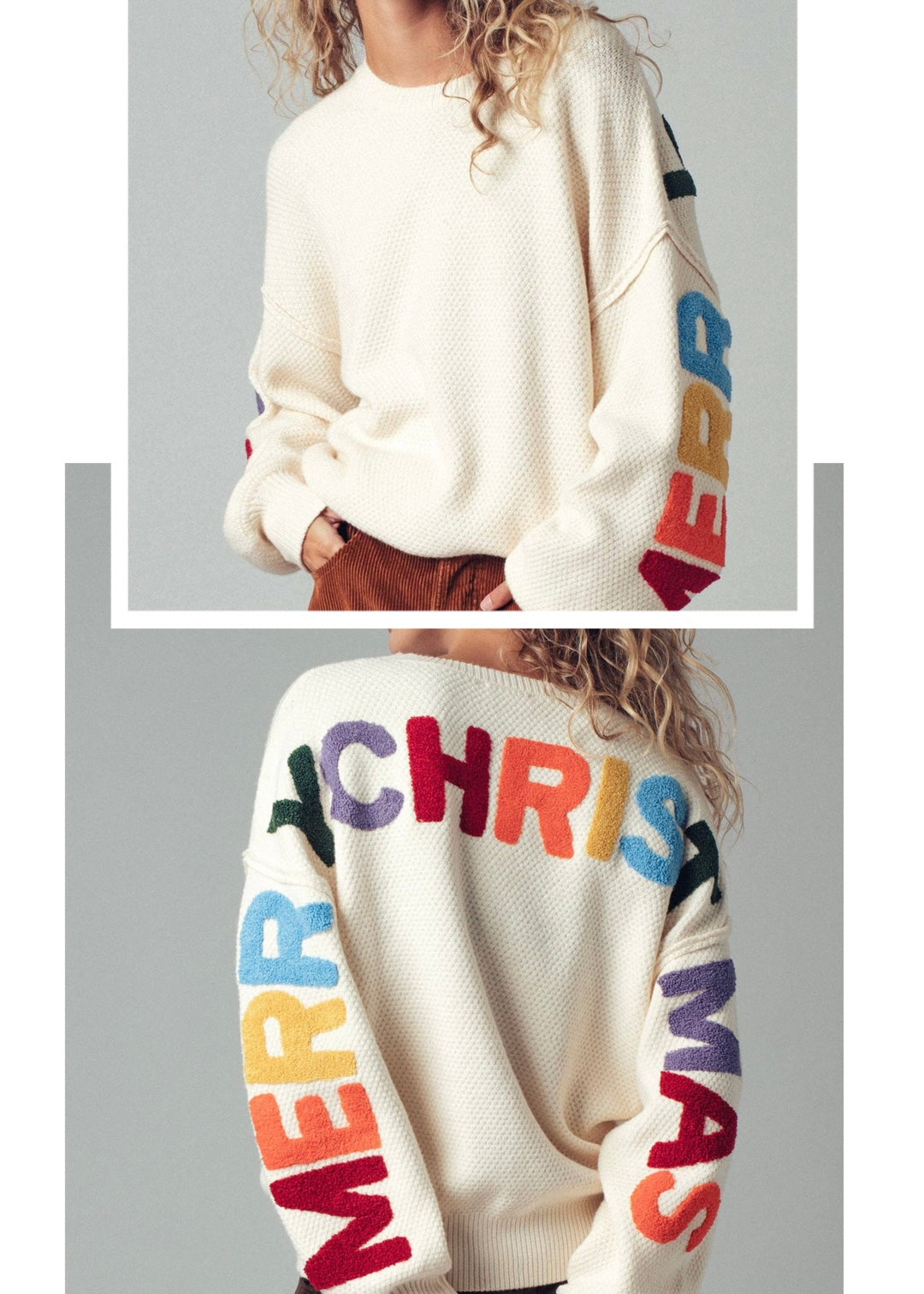 This cozy sweater featuring bold, colorful lettering across the back and sleeves