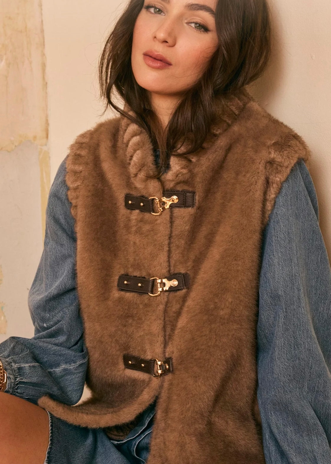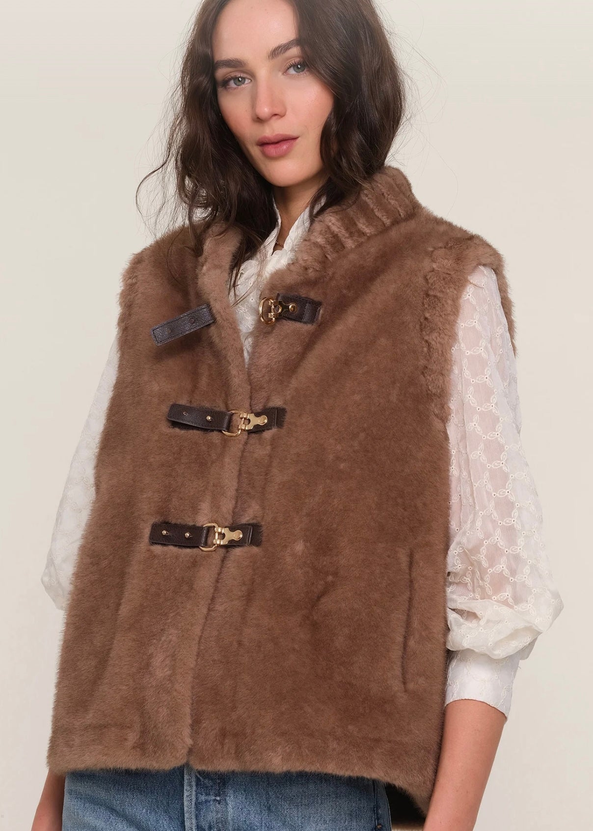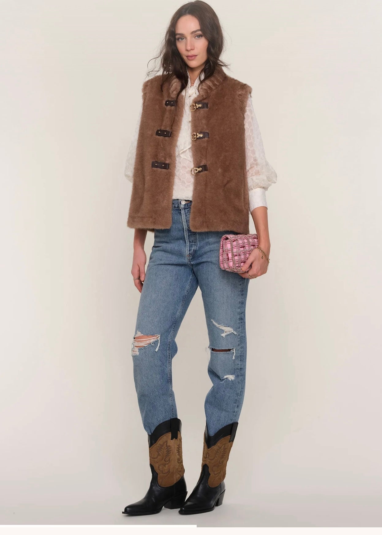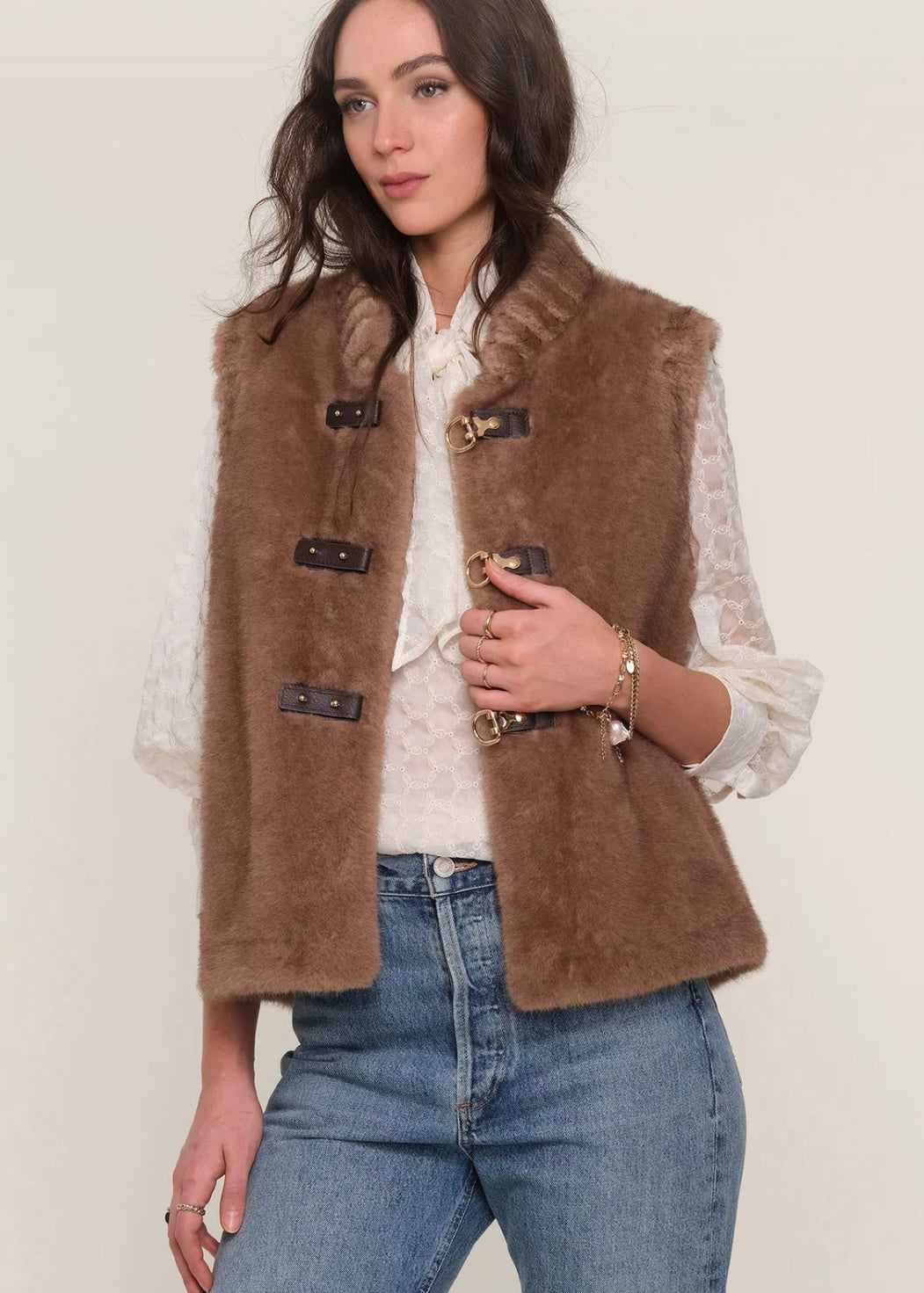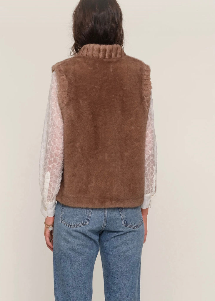 The Hosk Vest is made from a soft, faux fur. It has a relaxed fit, making it perfect to layer over your sweaters.