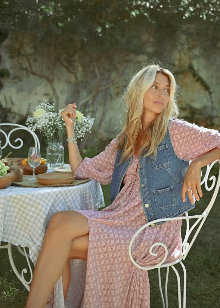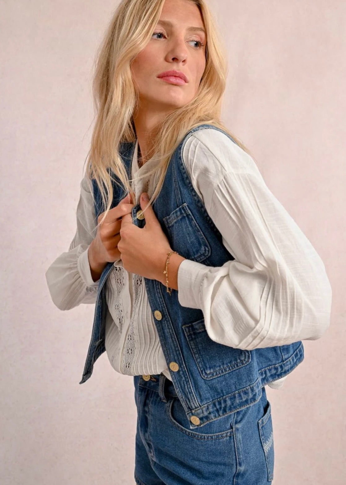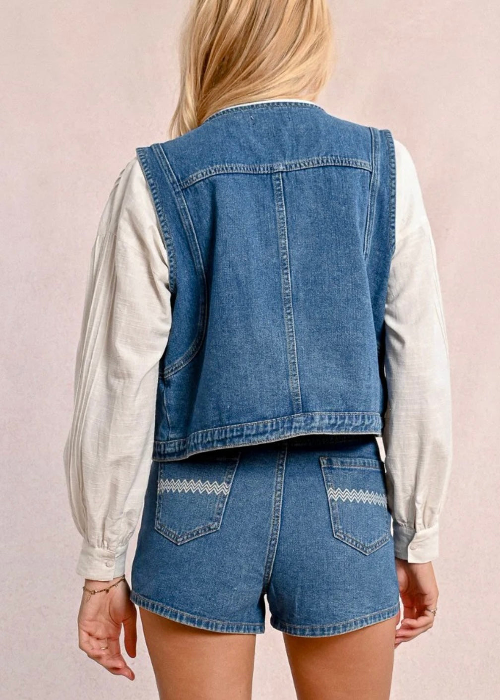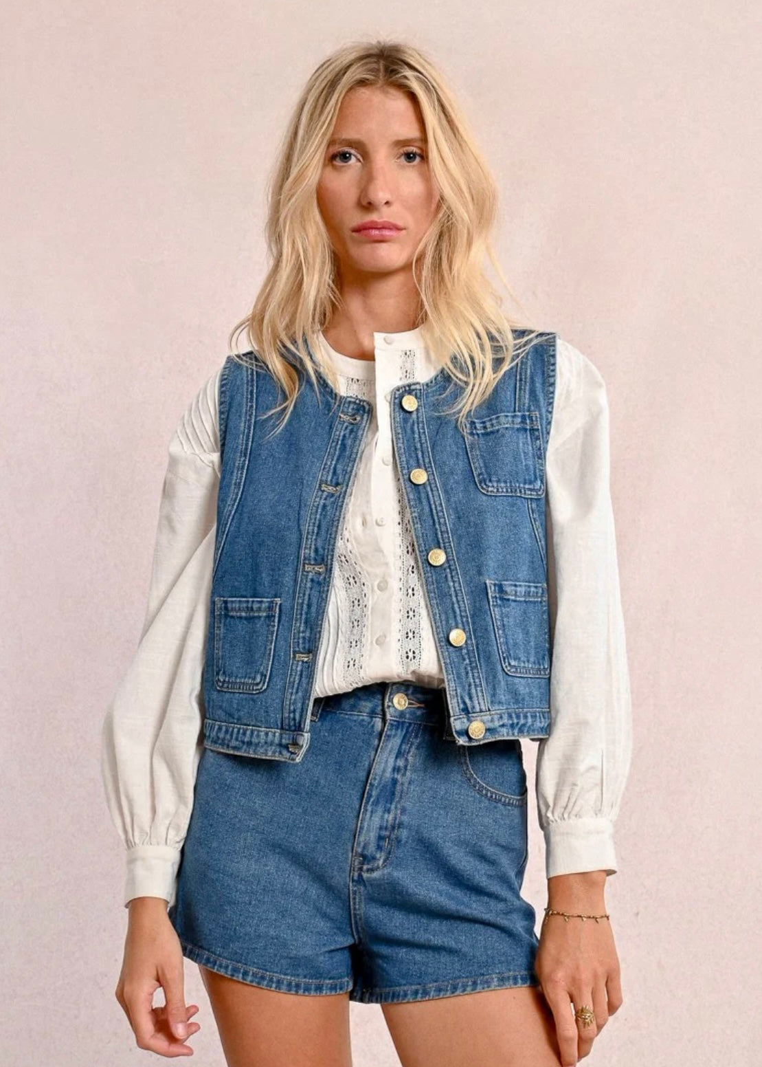 Introducing the Knox Denim Vest - the perfect addition to your wardrobe. This sleeveless jacket features a round neckline and a short, straight cut for a flattering fit. With cutouts on the sides and 3 patch pockets on the front, this vest offers both style and functionality. The contrasting button closure in the center front adds a touch of personality.