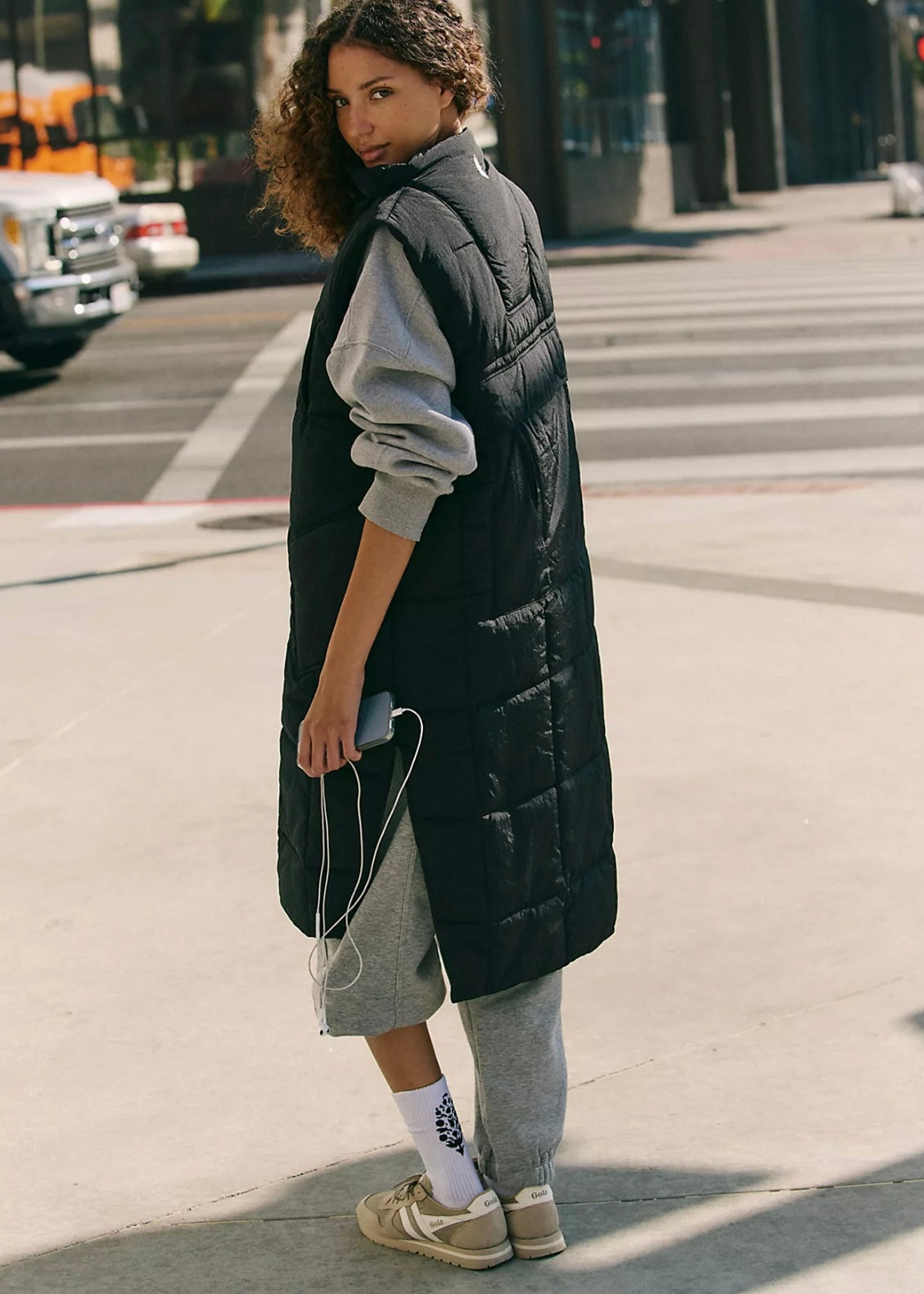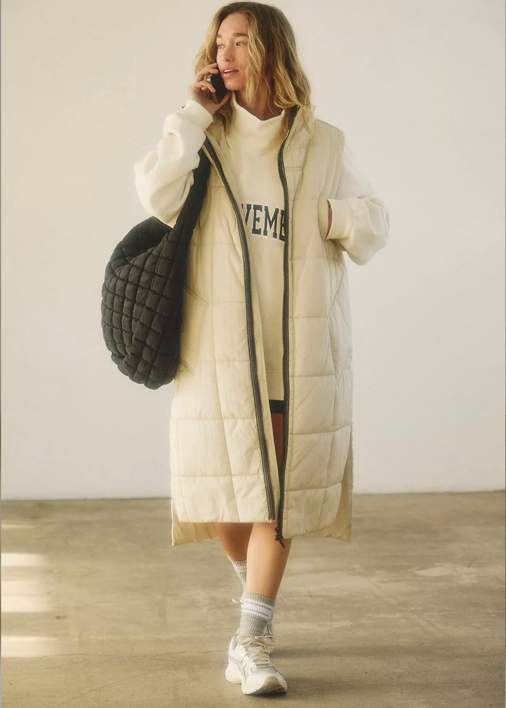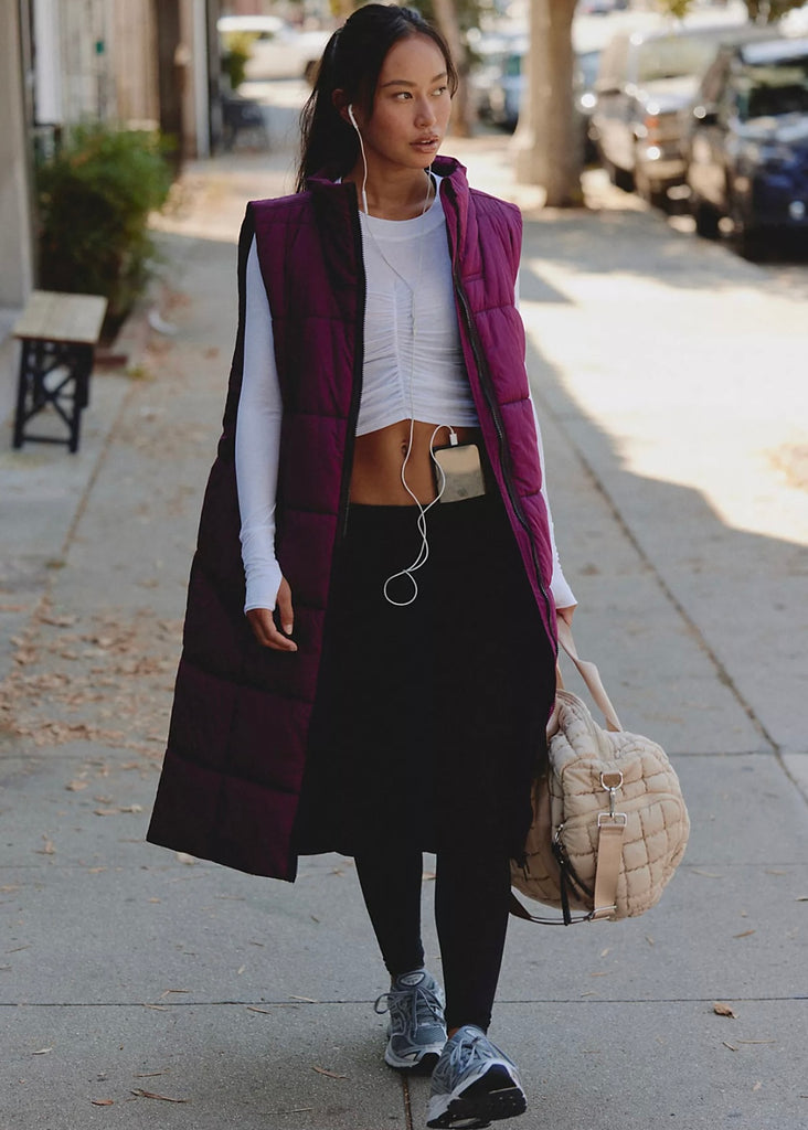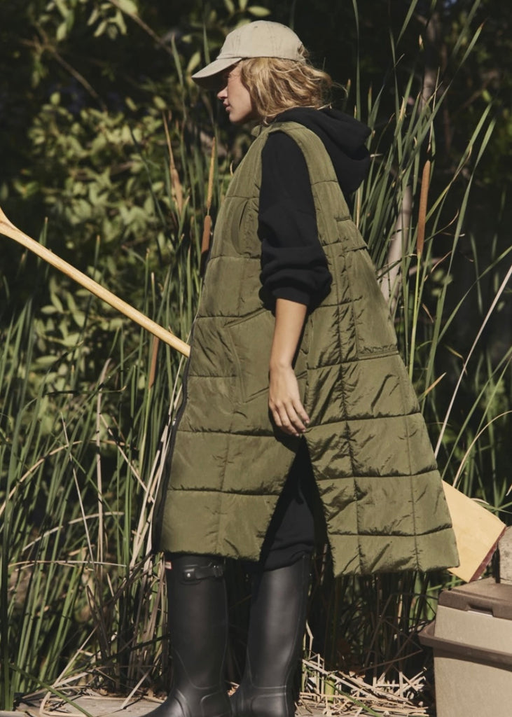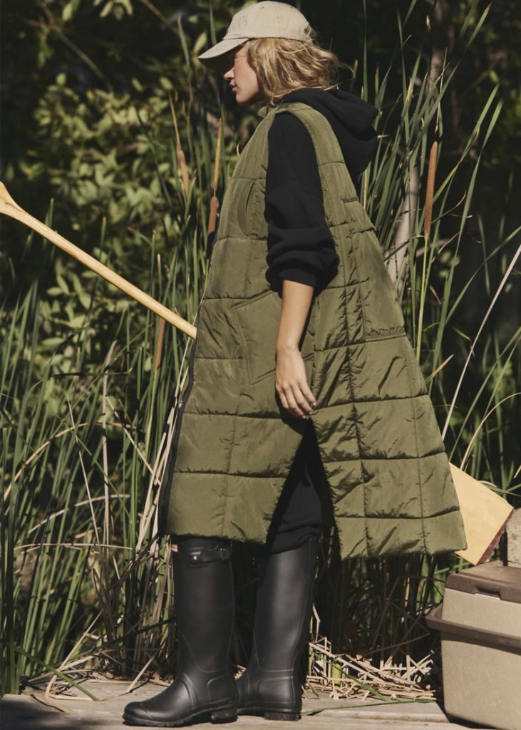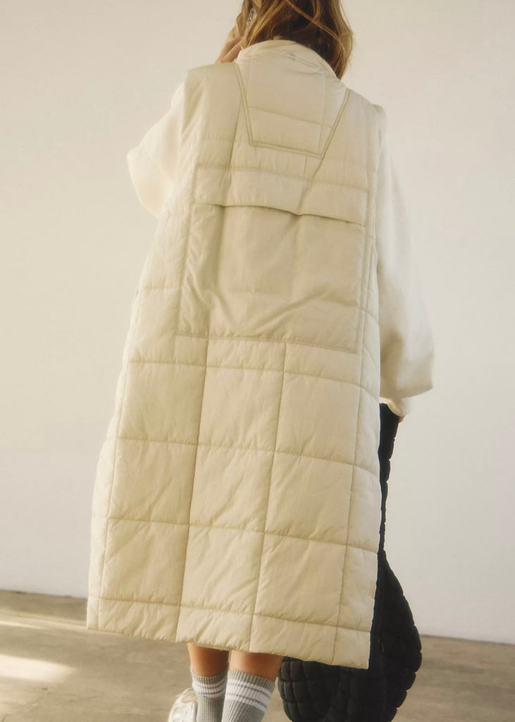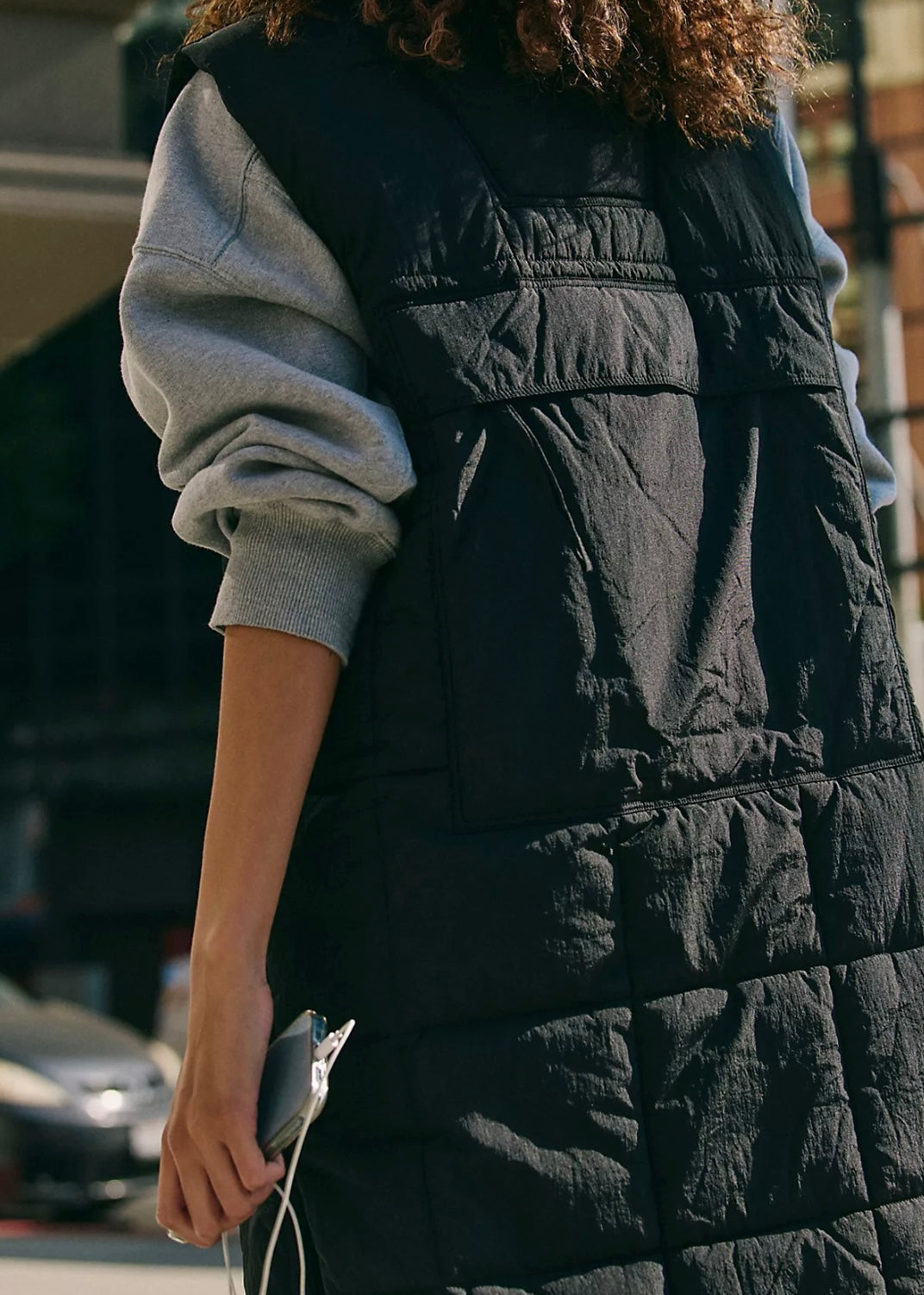 Pack it up and take it everywhere. This functional vest is featured in a quilted fabrication and knee-length silhouette with low-cut armholes and exaggerated side slits.
