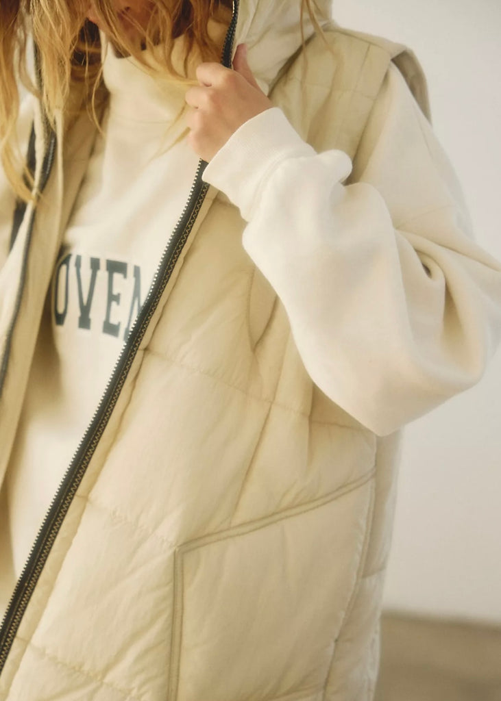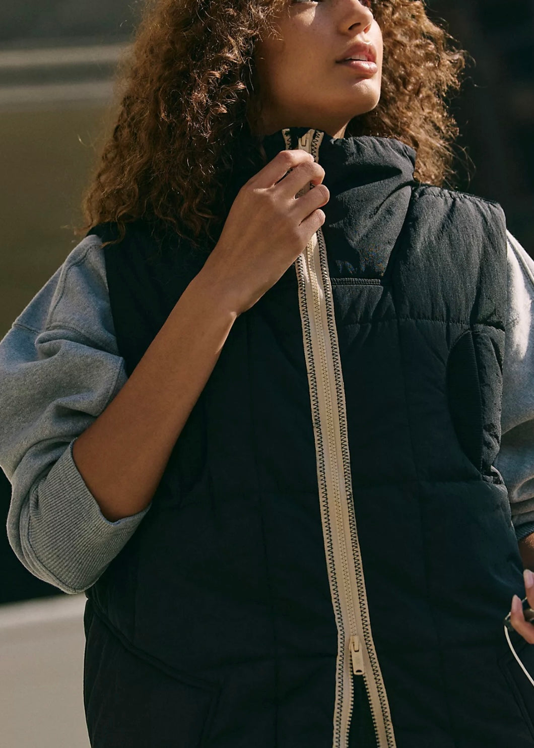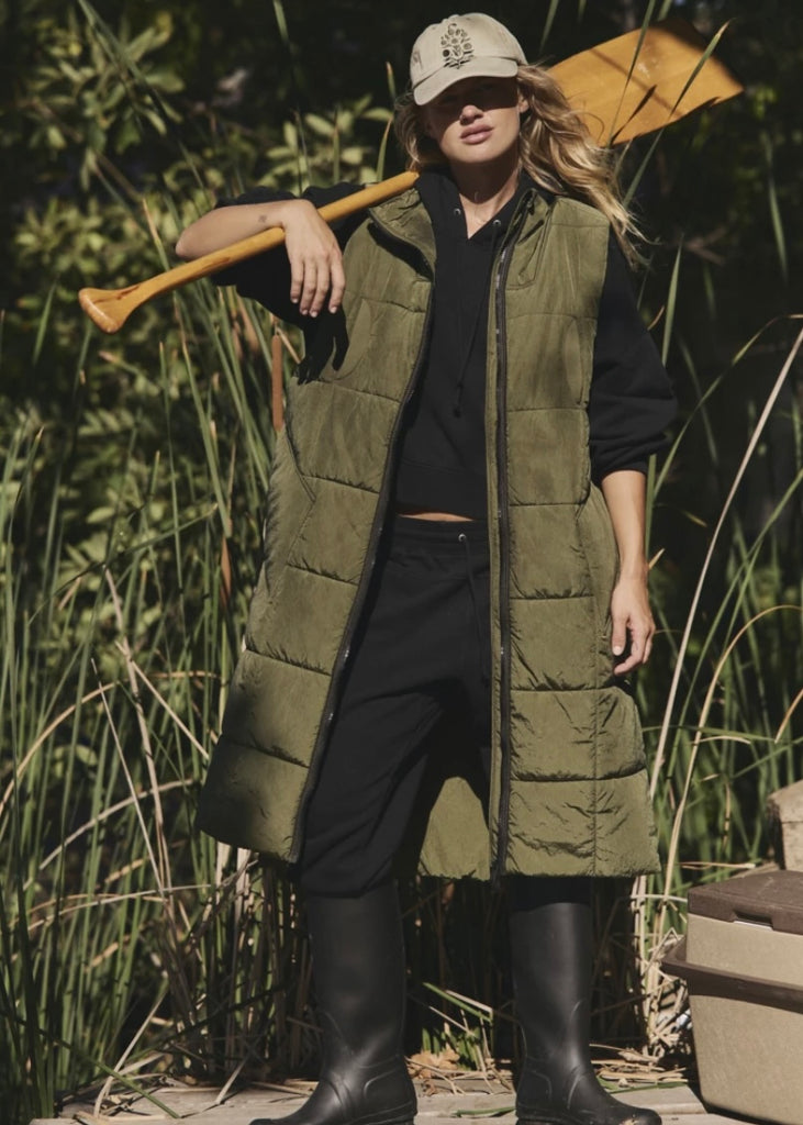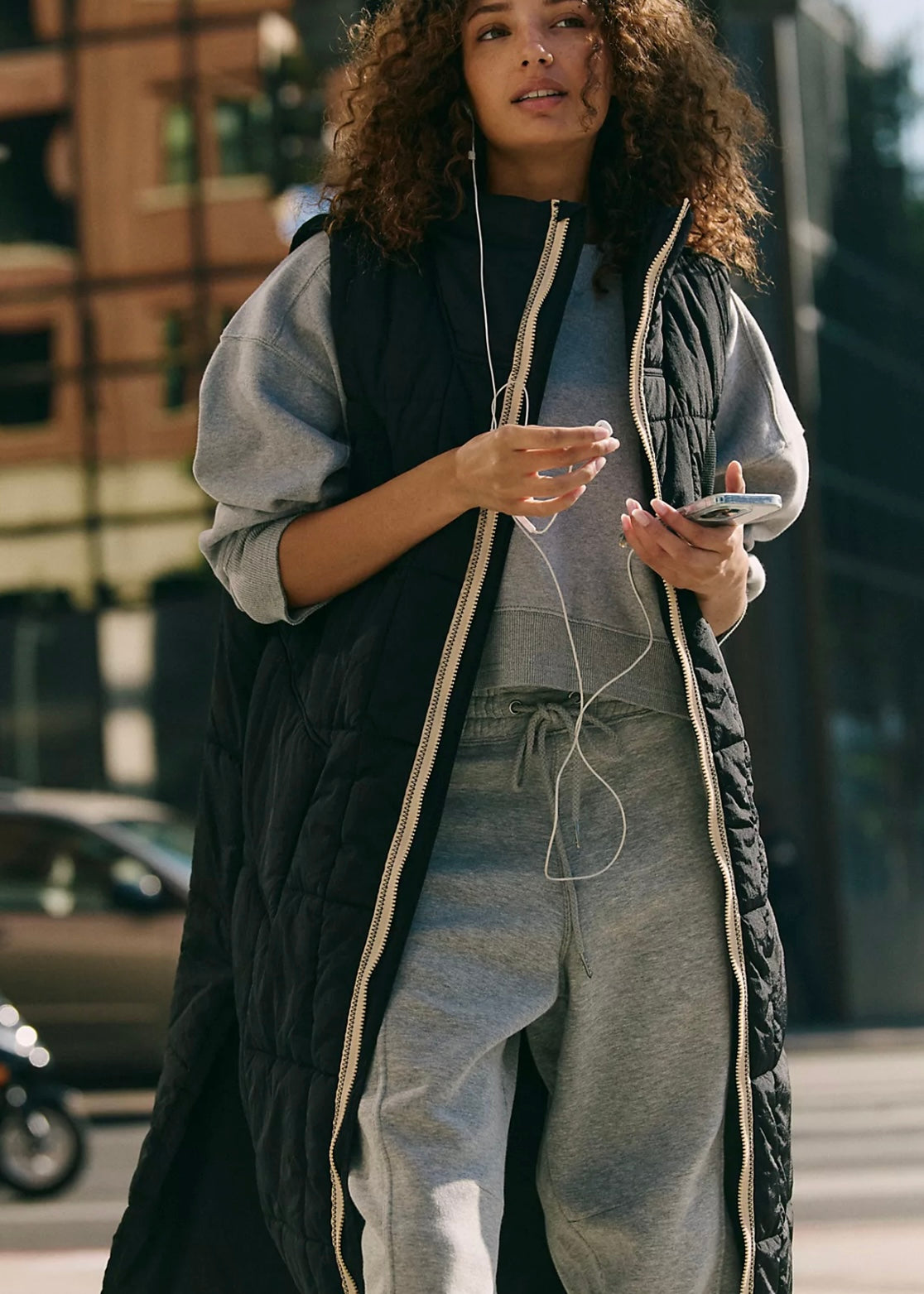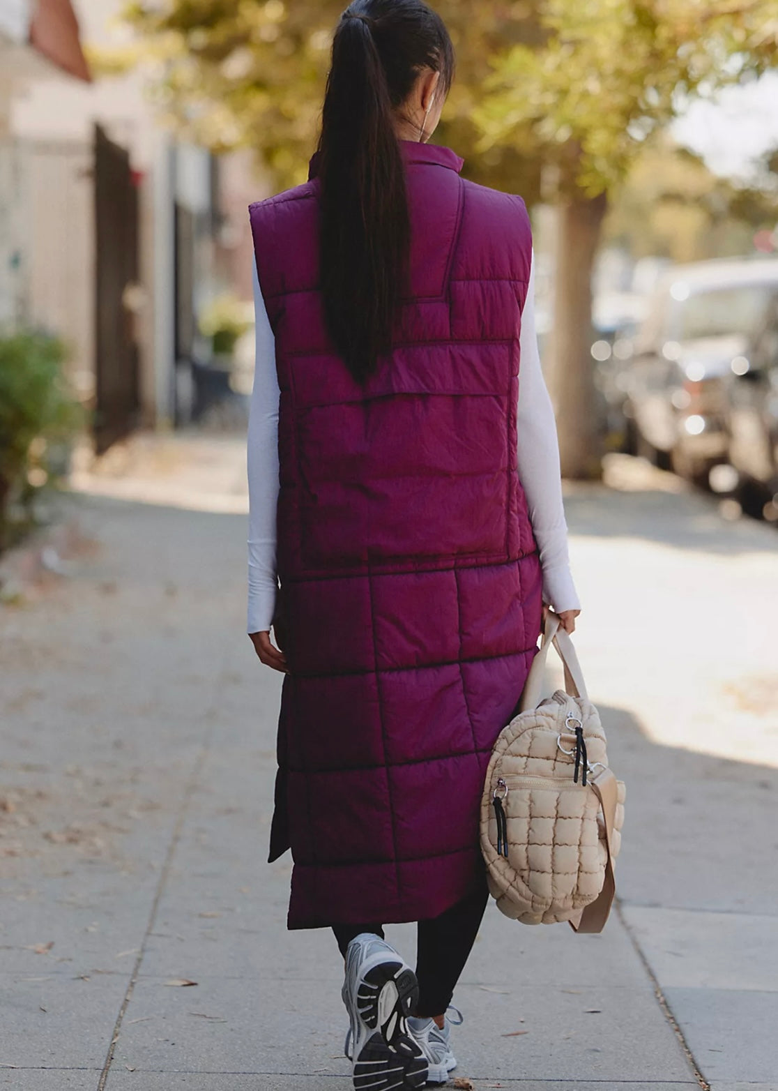 Pack it up and take it everywhere. This functional vest is featured in a quilted fabrication and knee-length silhouette with low-cut armholes and exaggerated side slits.