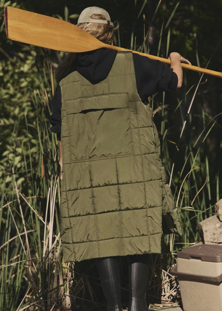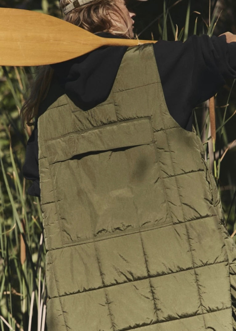 The Feel: Quilted nylon fabrication, lightweight with Primaloft insulation for a warm feel