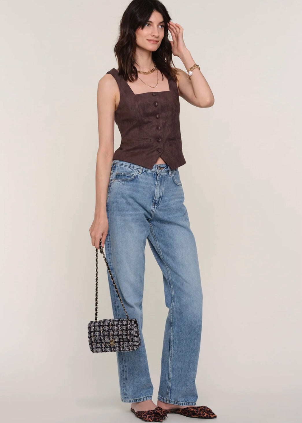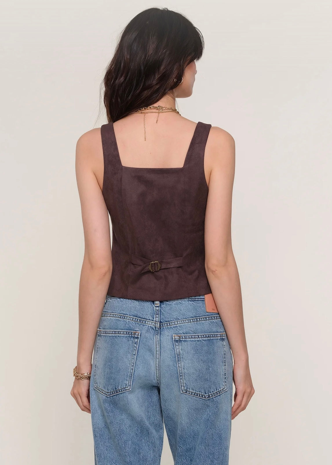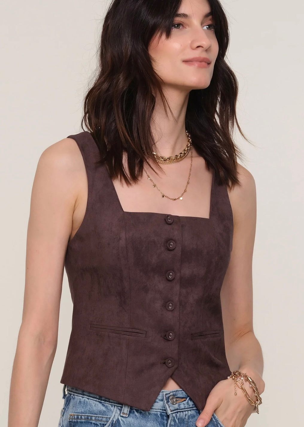 The Terra Vest is a faux suede top with a really flattering fit. It features a square neckline and a button front closure. We love it paired with denim.