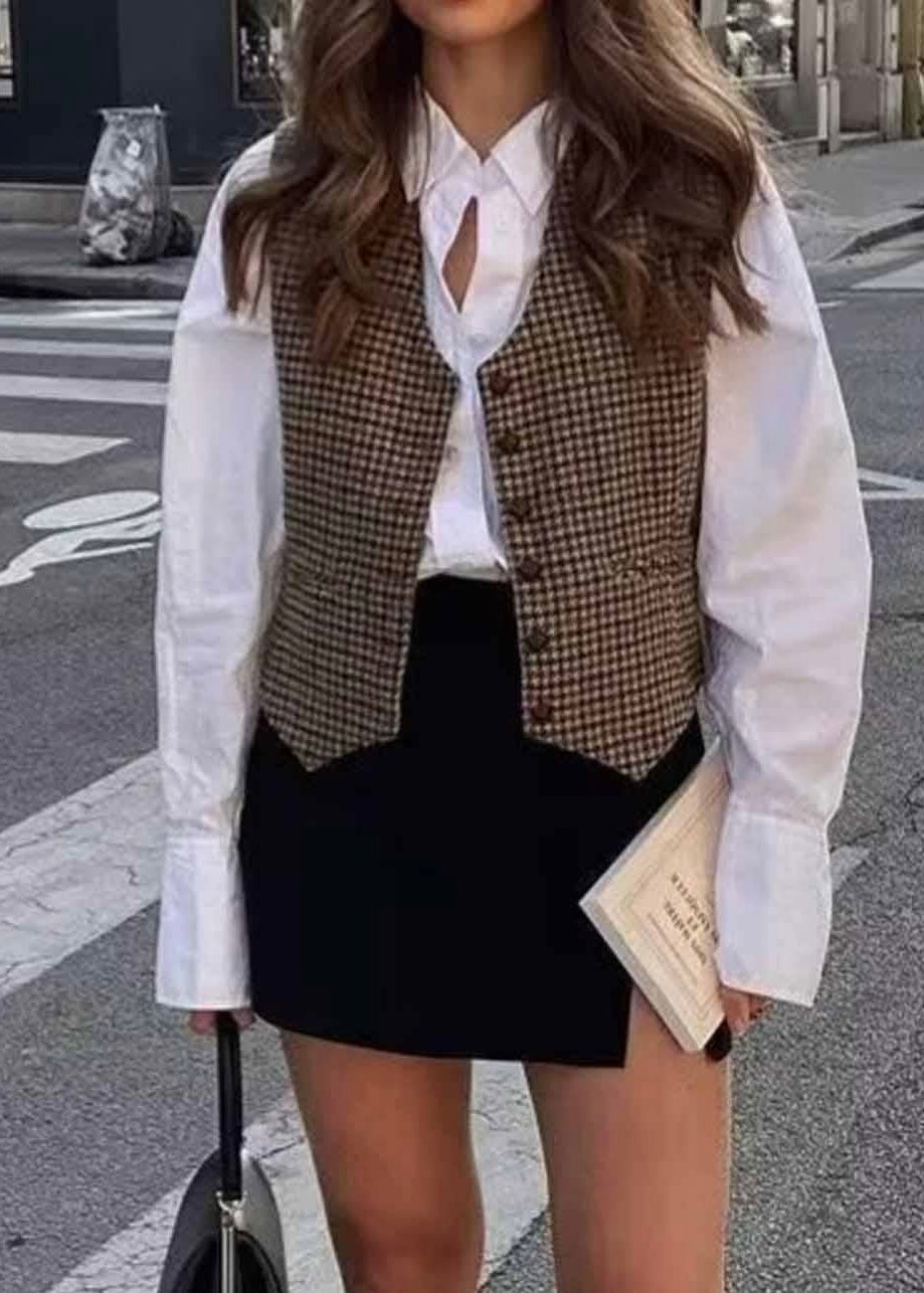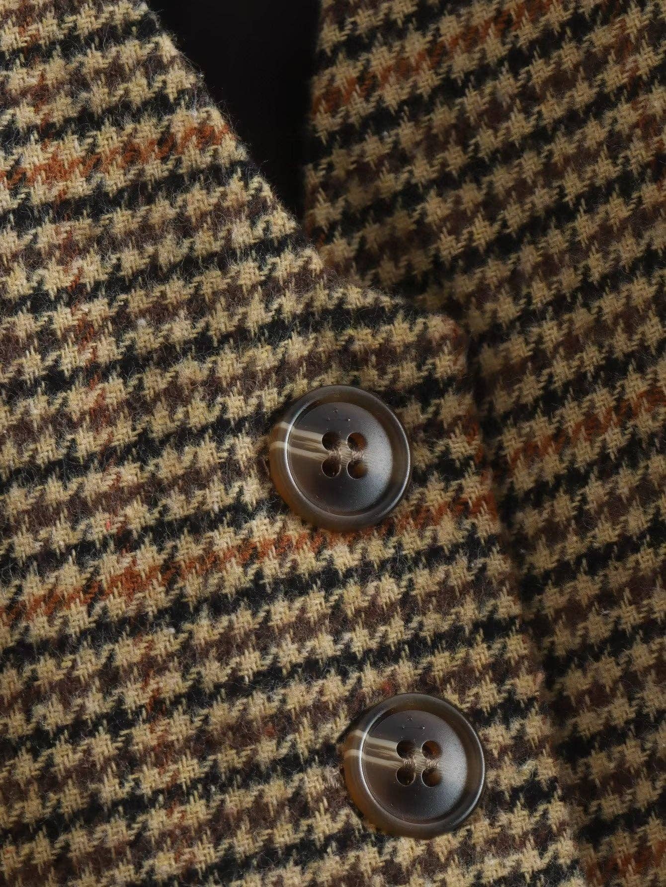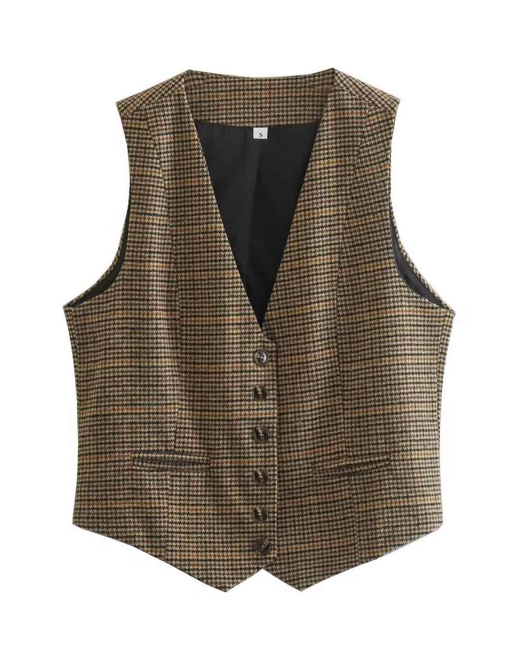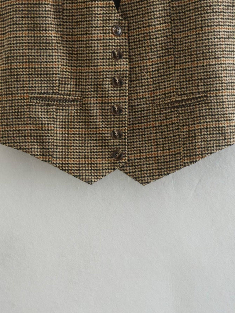 The Vintage Plaid Tweed Vest features a classic plaid pattern, a V-neck design with buttons and a slim fit