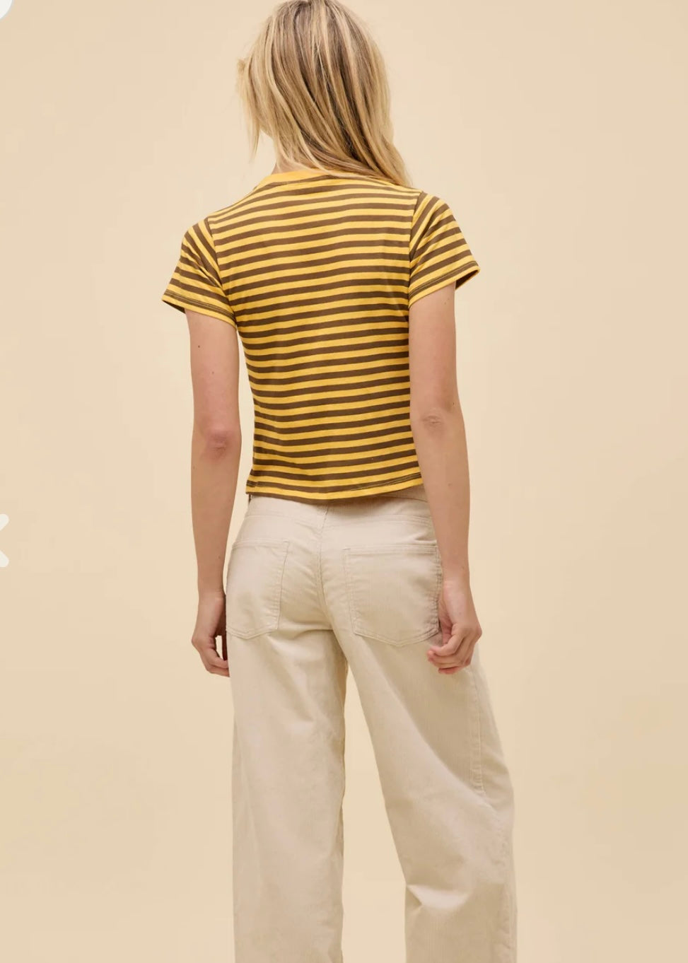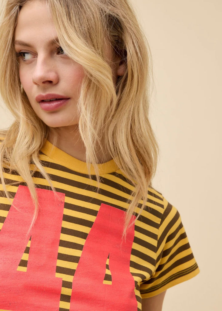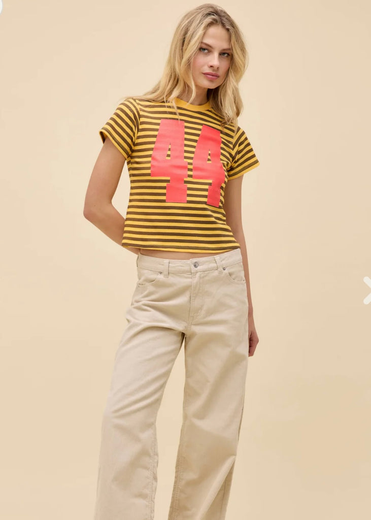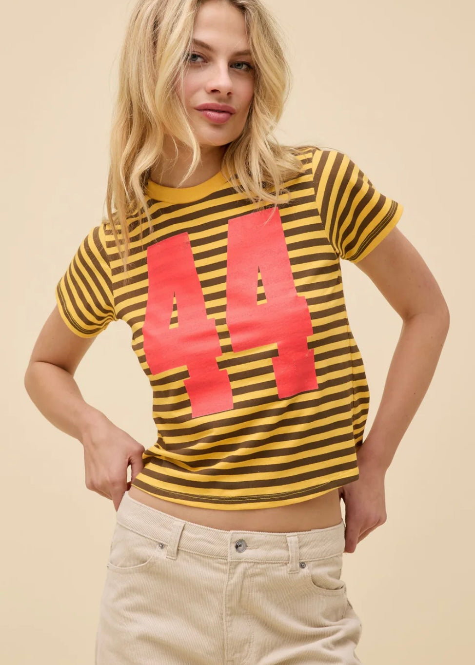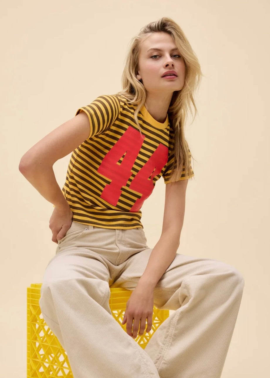 A striped shrunken tee with oversized numbers reminiscent of a thrift store find makes for a major league look.