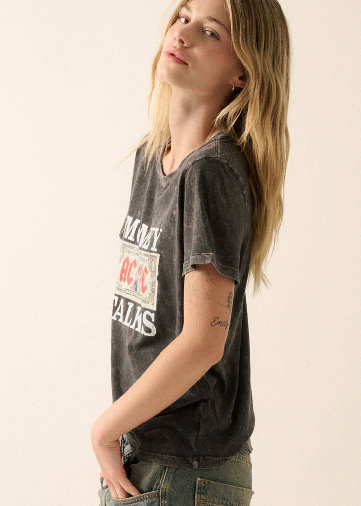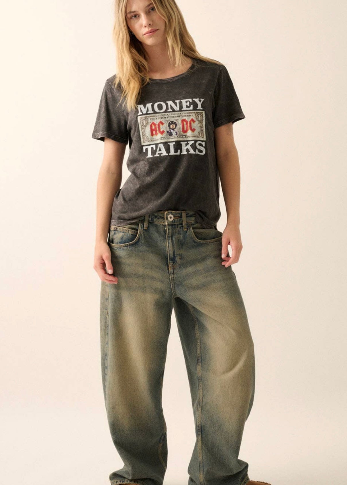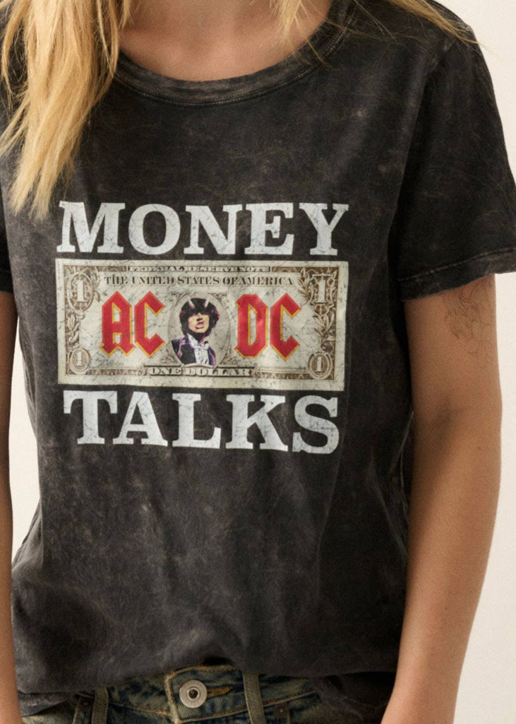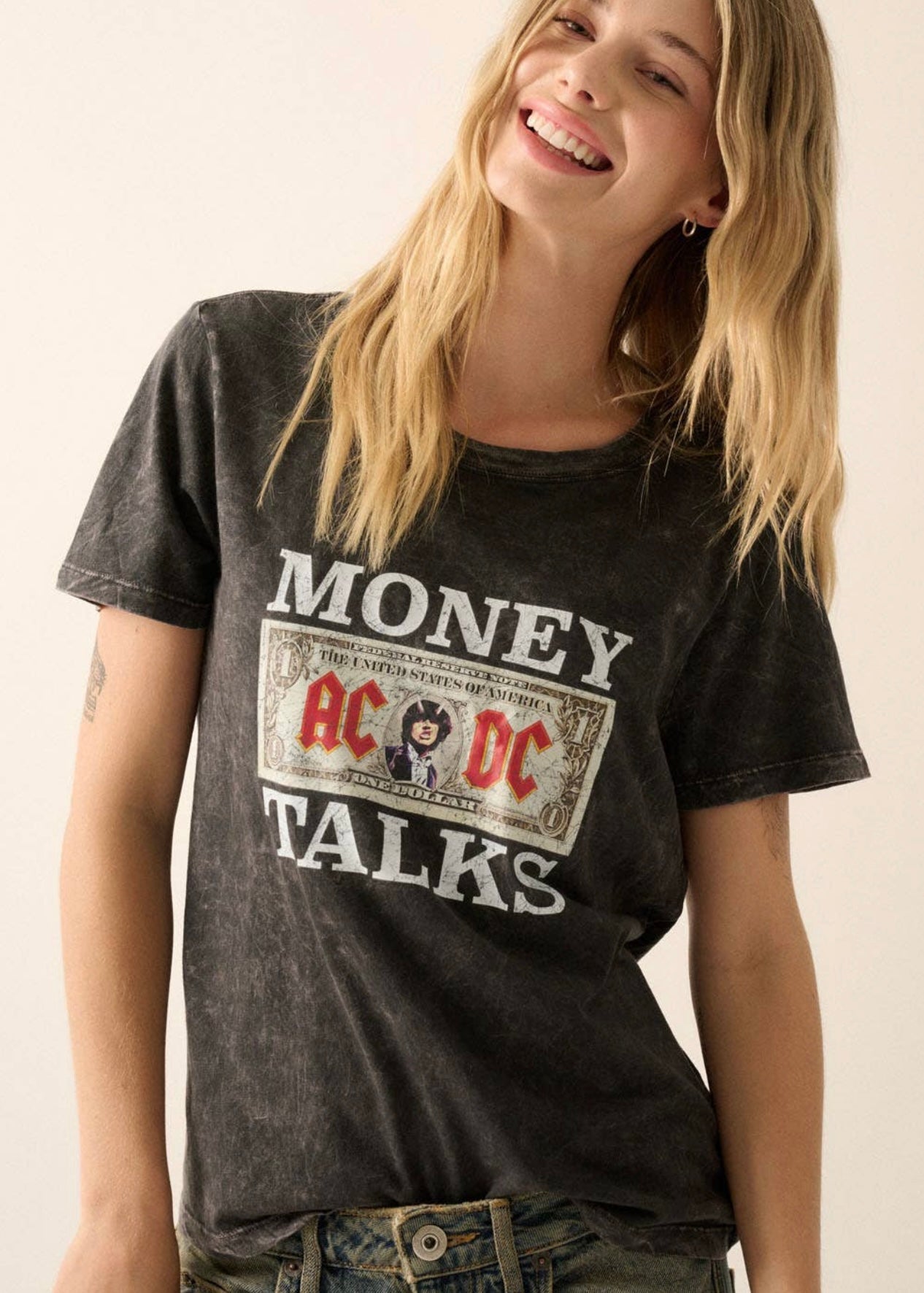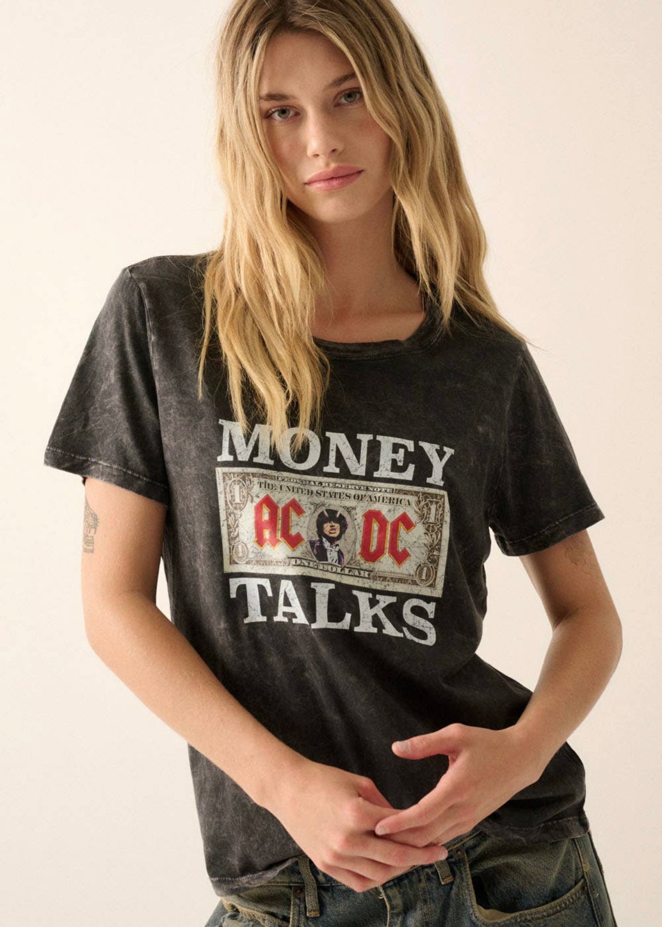 Get rockin' style with this AC/DC Money Talks Tee! Featuring a vintage dollar graphic and playful "Money Talks" text, this relaxed fit tee is perfect for any fan. With a round neckline and short sleeves, it's a must-have addition to your casual wardrobe.