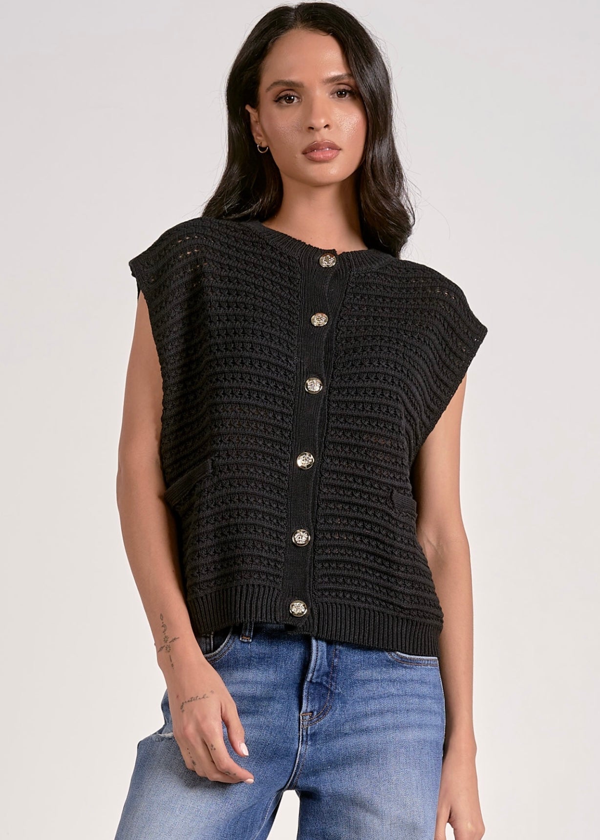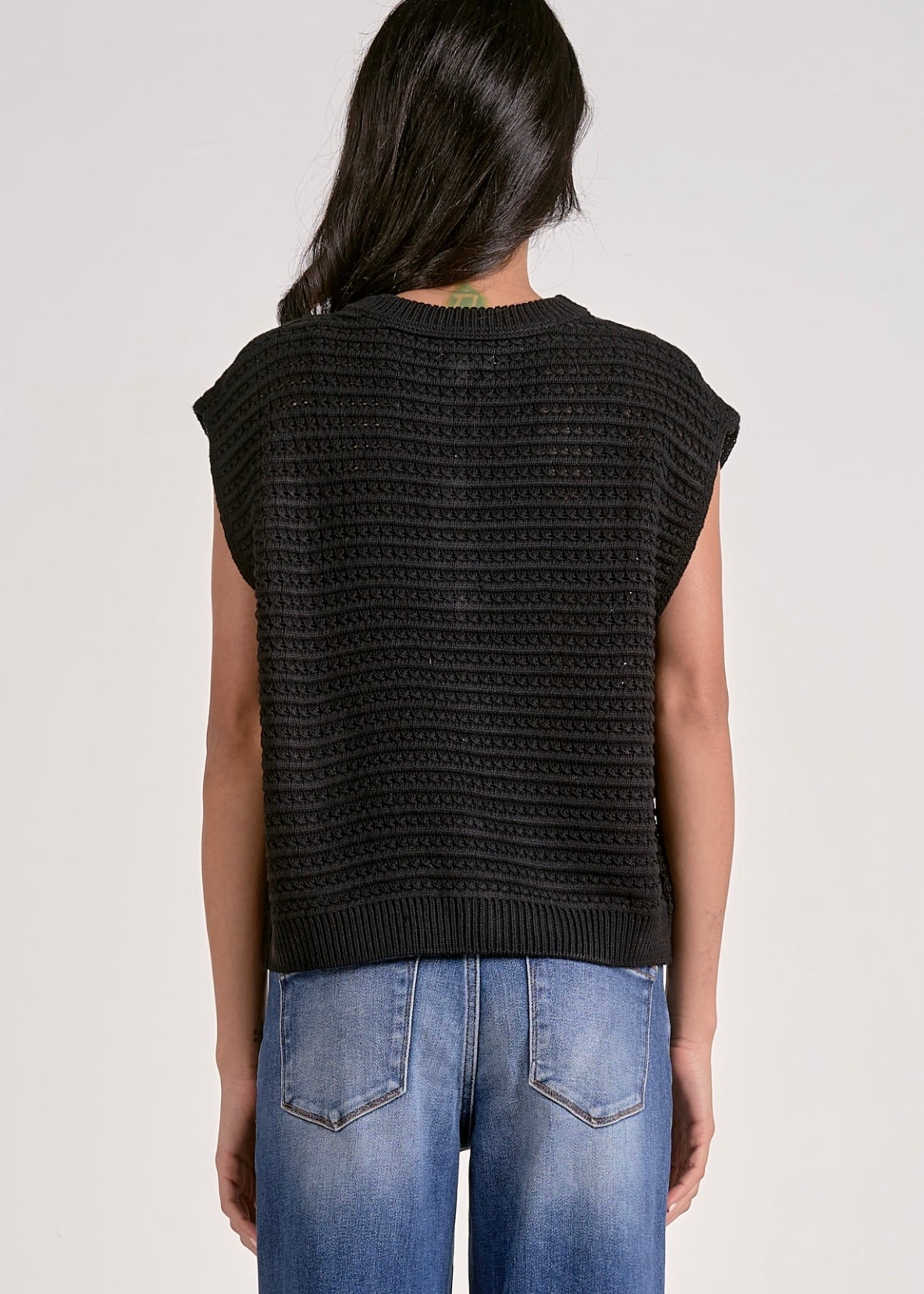 The Ayla Sweater Vest features a sophisticated open knit design with dropped shoulders, offering a relaxed yet refined silhouette.