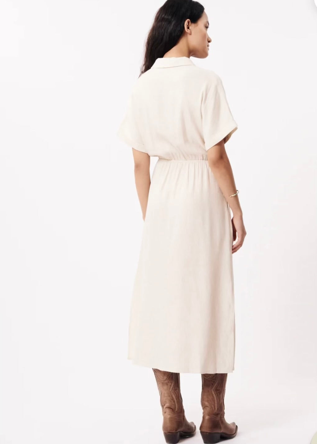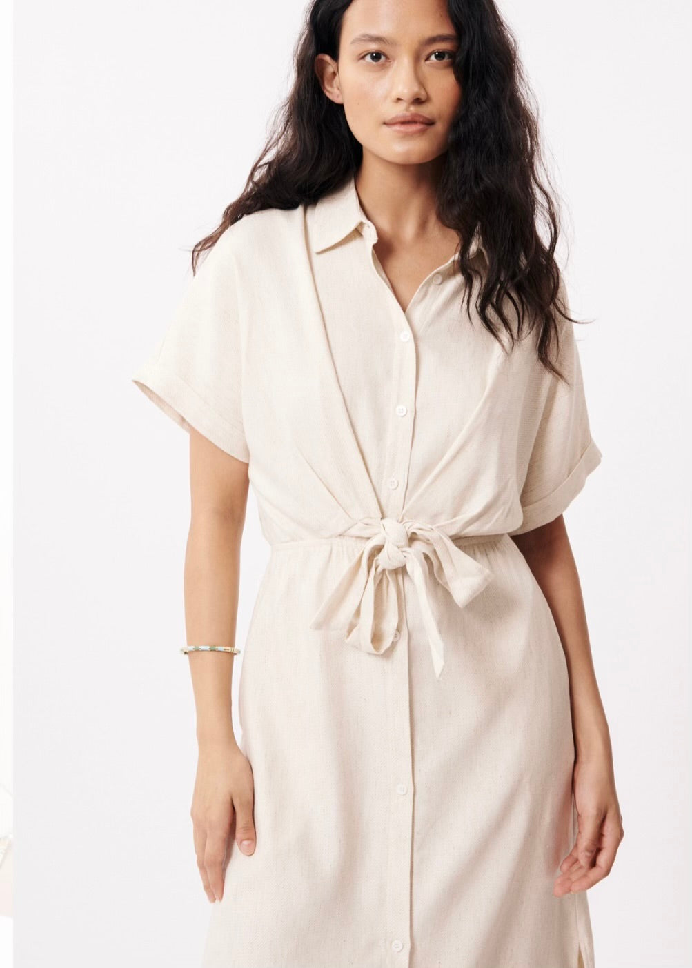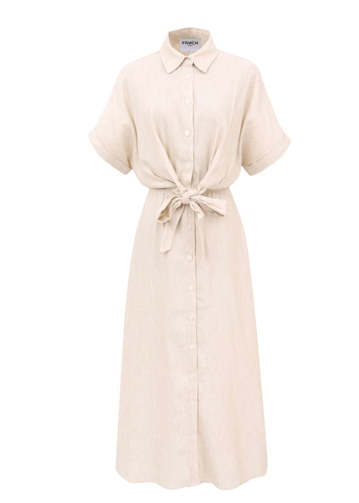 Alienor is a long shirt-style dress, with an open collar, short sleeves and a belt at the waist to emphasize your figure. Perfect for a romantic meal.
