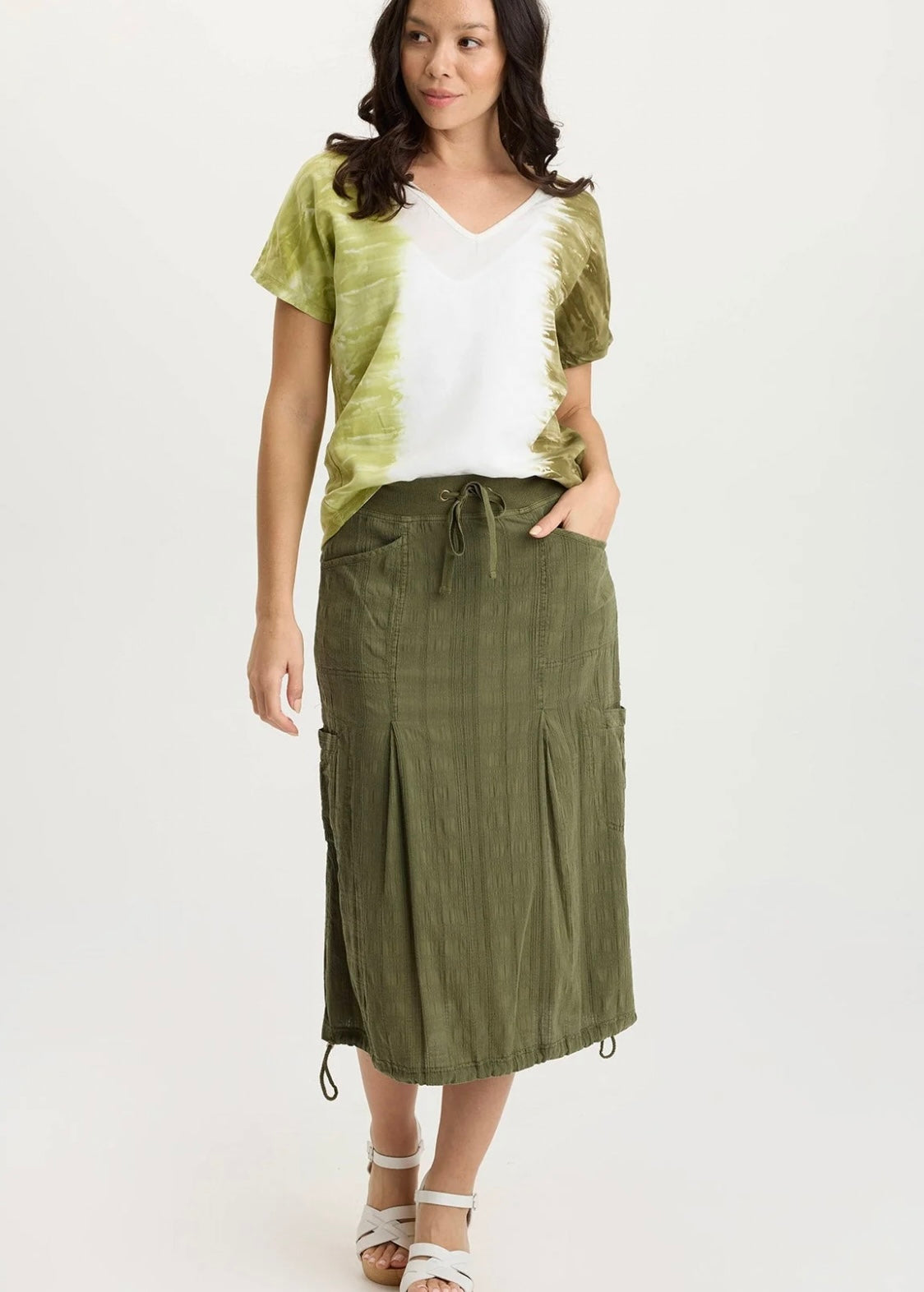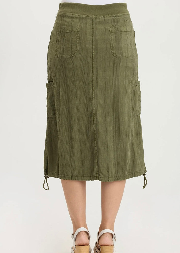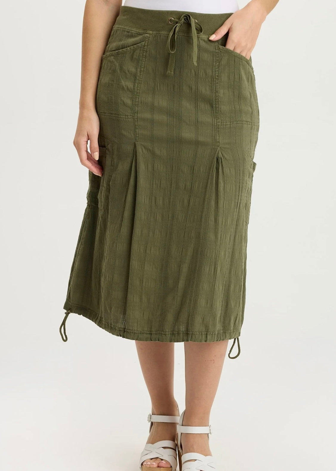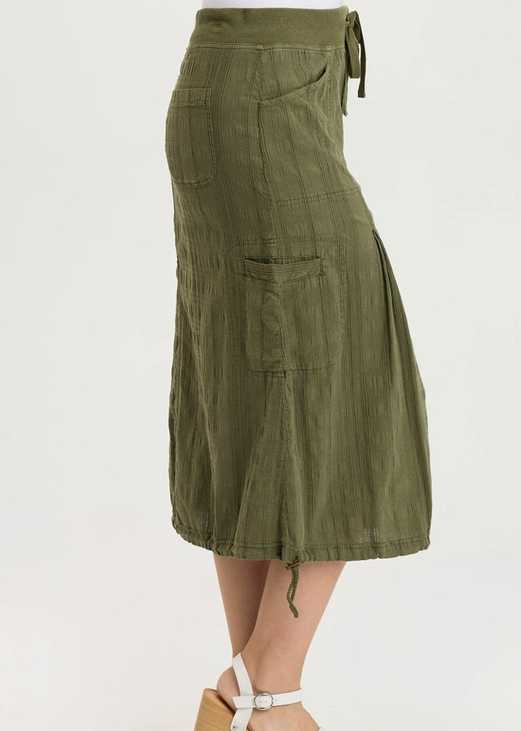 Aracelle Bubble Skirt features a cinchable hem with two welted cargo pockets, and traditional front and back pockets with a rib and drawstring waistband.