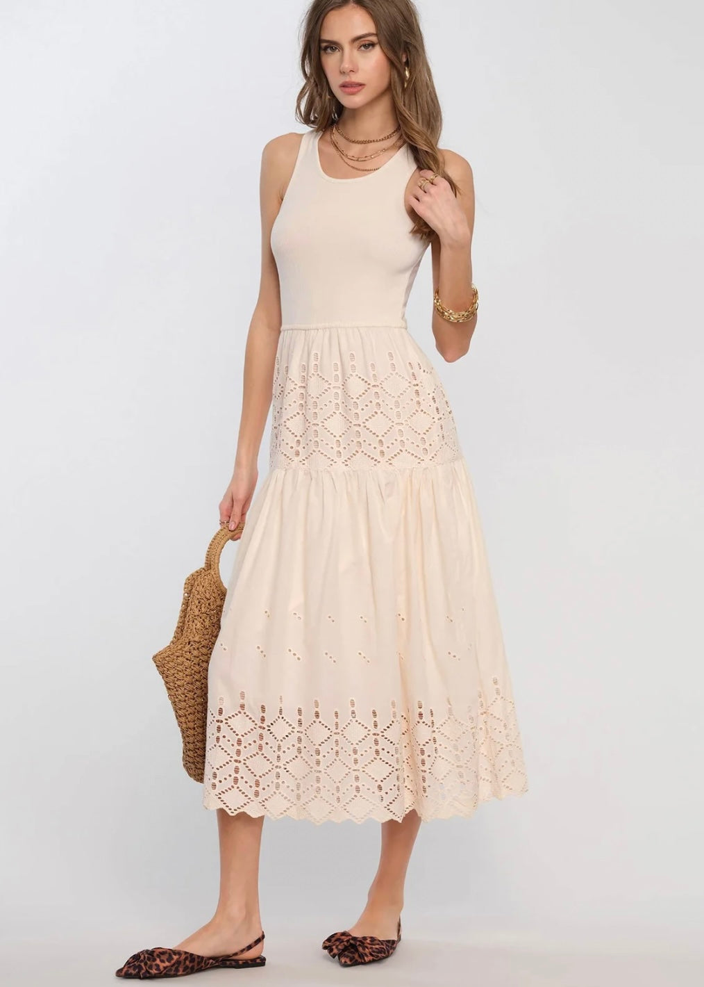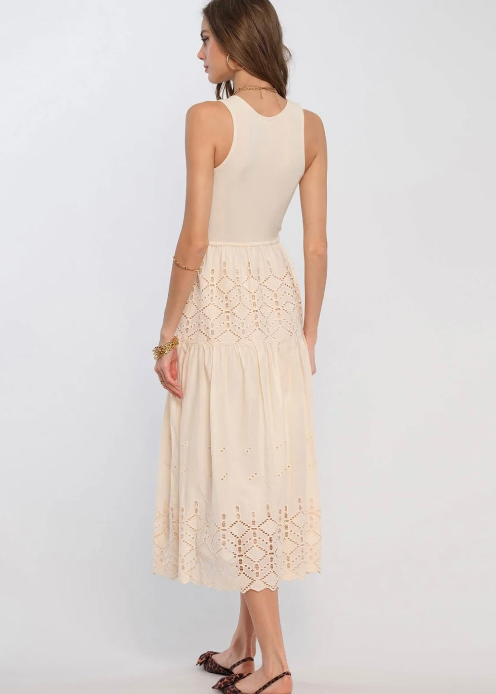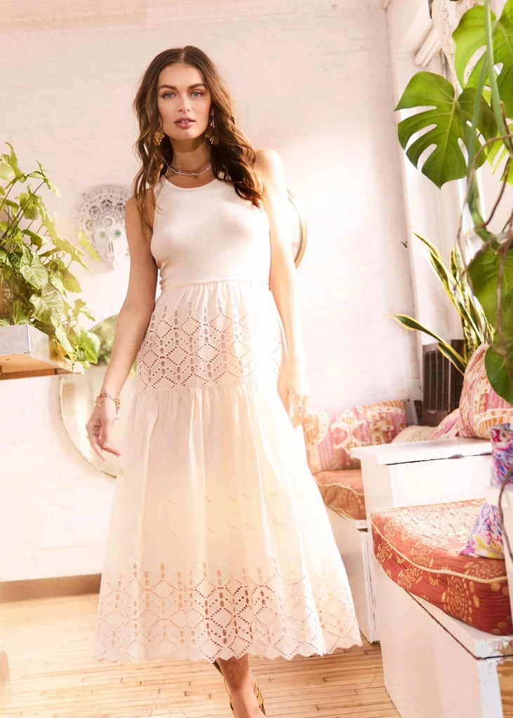 Introducing the Aribelle Dress, a dreamy mid-length piece. The slim-fitting bodice is crafted from our buttery soft ribbed knit, while the skirt features our super-special placed cotton eyelet. Effortlessly cool and endlessly chic.