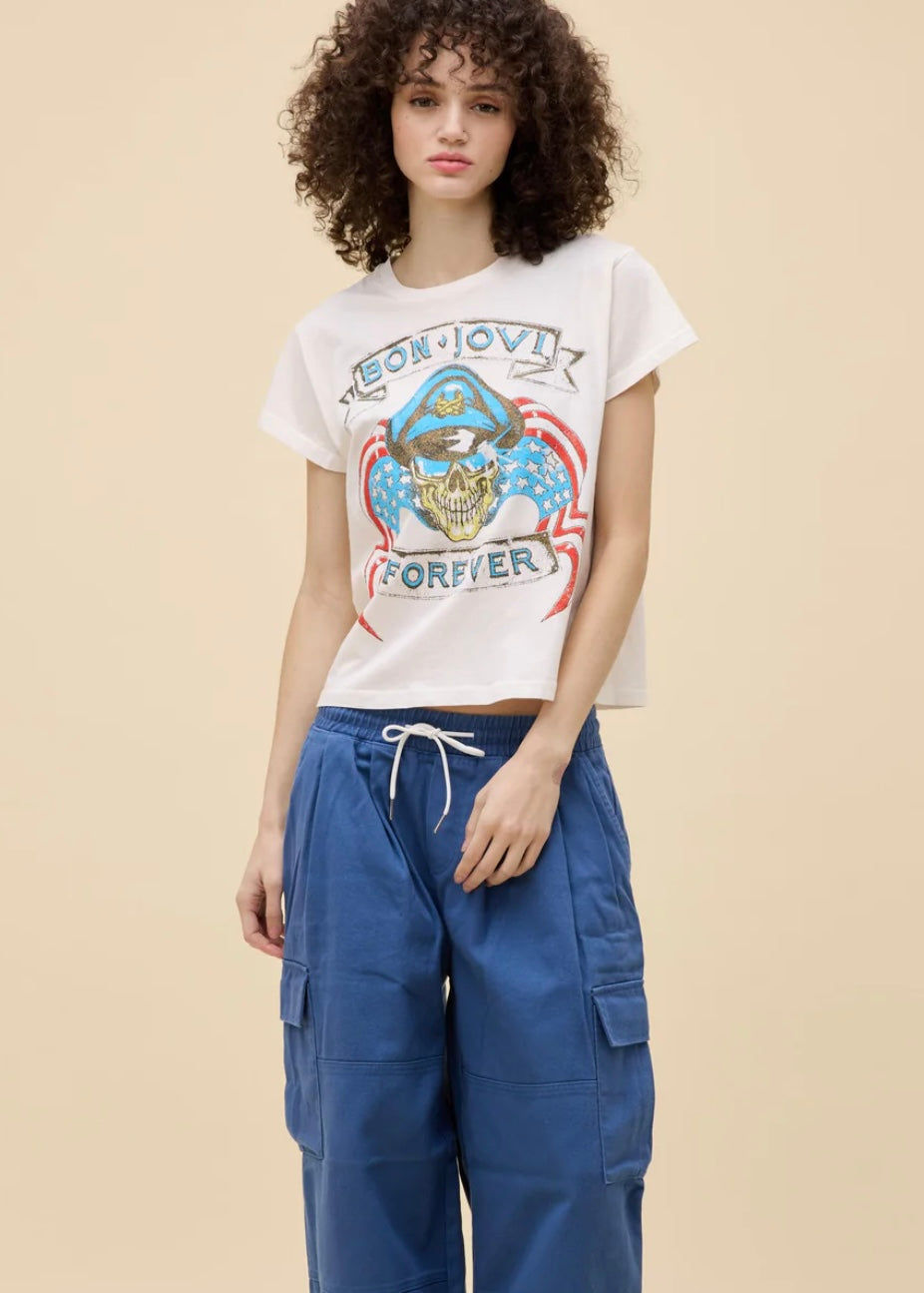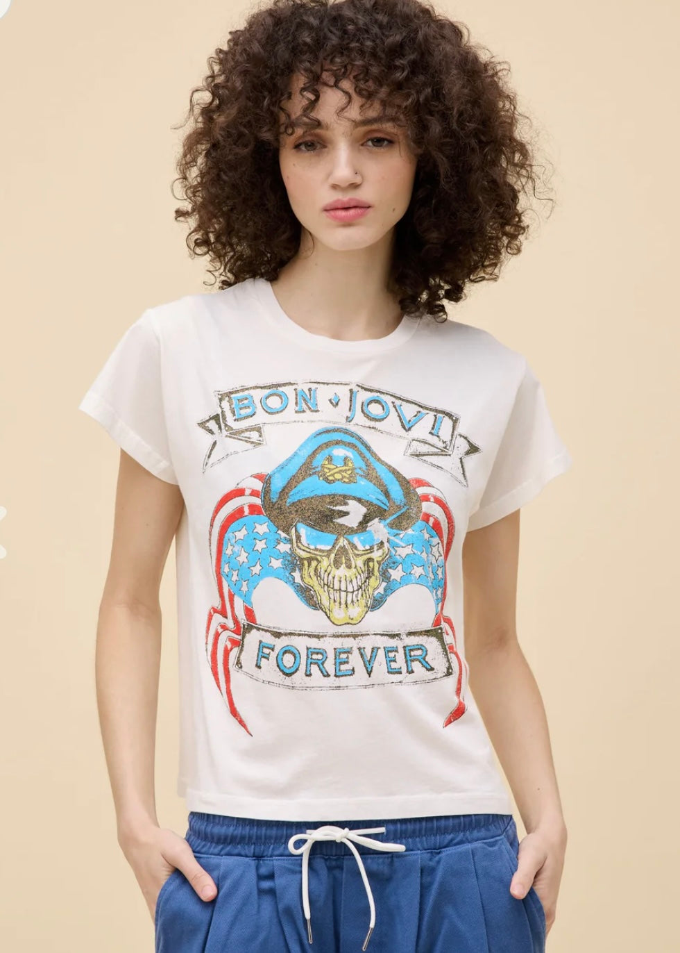 Bon Jovi Forever. Tributing the 80's rock band that has withstood the test of time, this Solo Tee nods to the group's successful studio album and features an Americana skull accented in glitter ink.