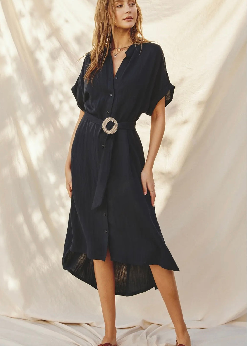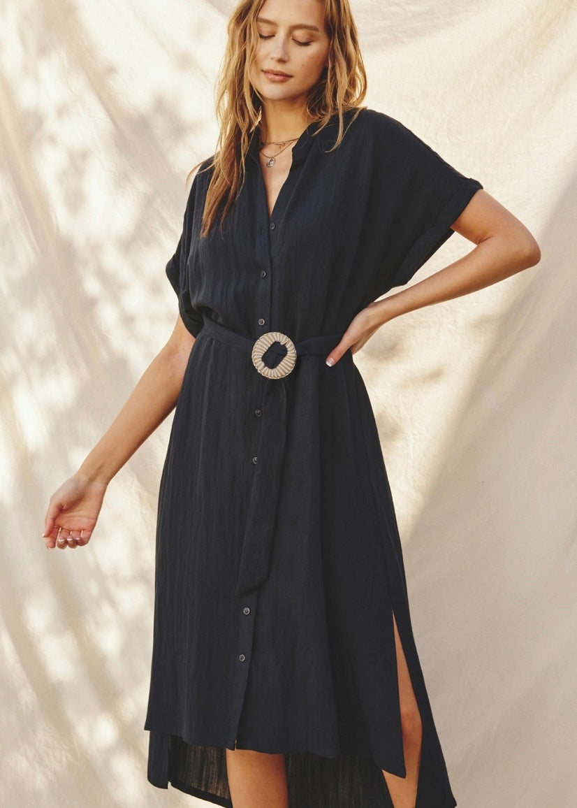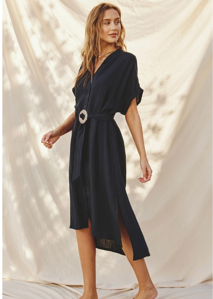 Indulge in effortless elegance with our Breezy Button Down Dolman Sleeve Dress. The flowy dolman sleeves and side slits provide a breezy feel while the V-neck and front button closure add a touch of sophistication. Complete the look with the included sash belt featuring a chic wicker belt buckle.