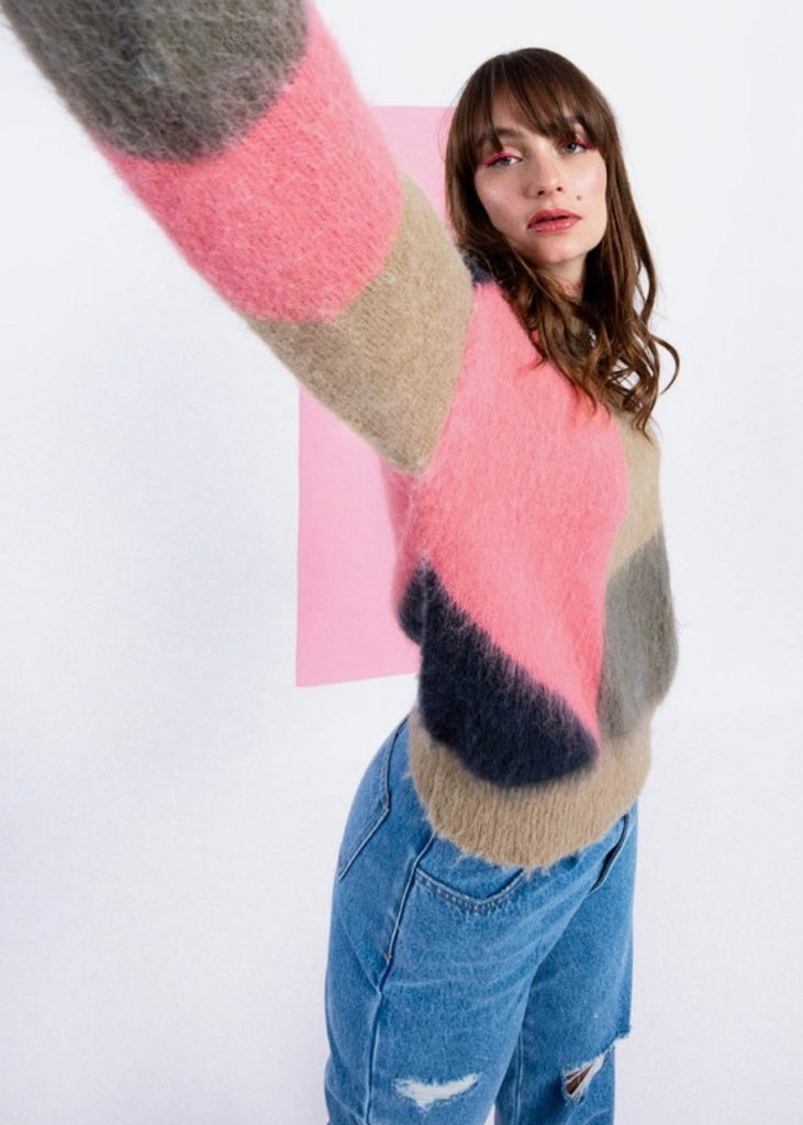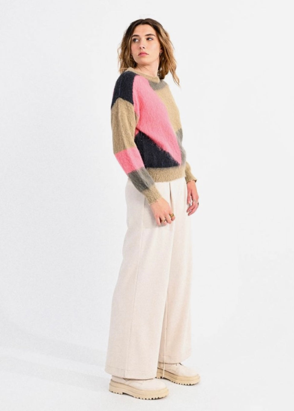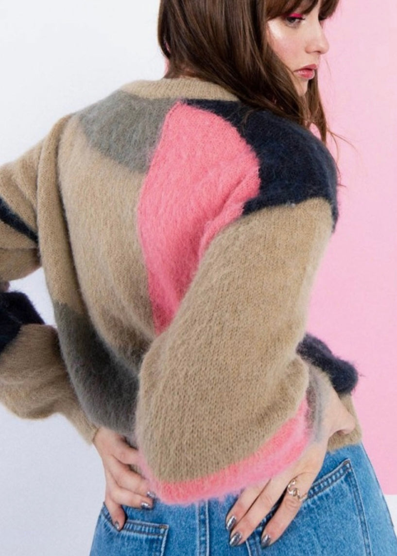 This unique crewneck knit is featured in a relaxed fit and hip-length with cool colorblock detailing and long sleeves.