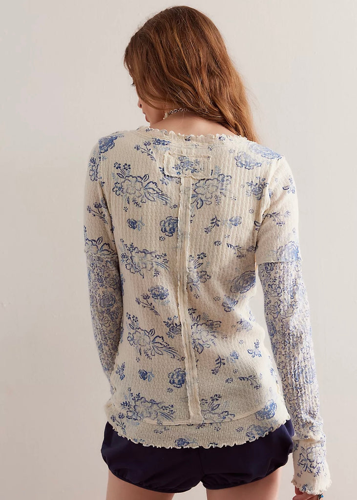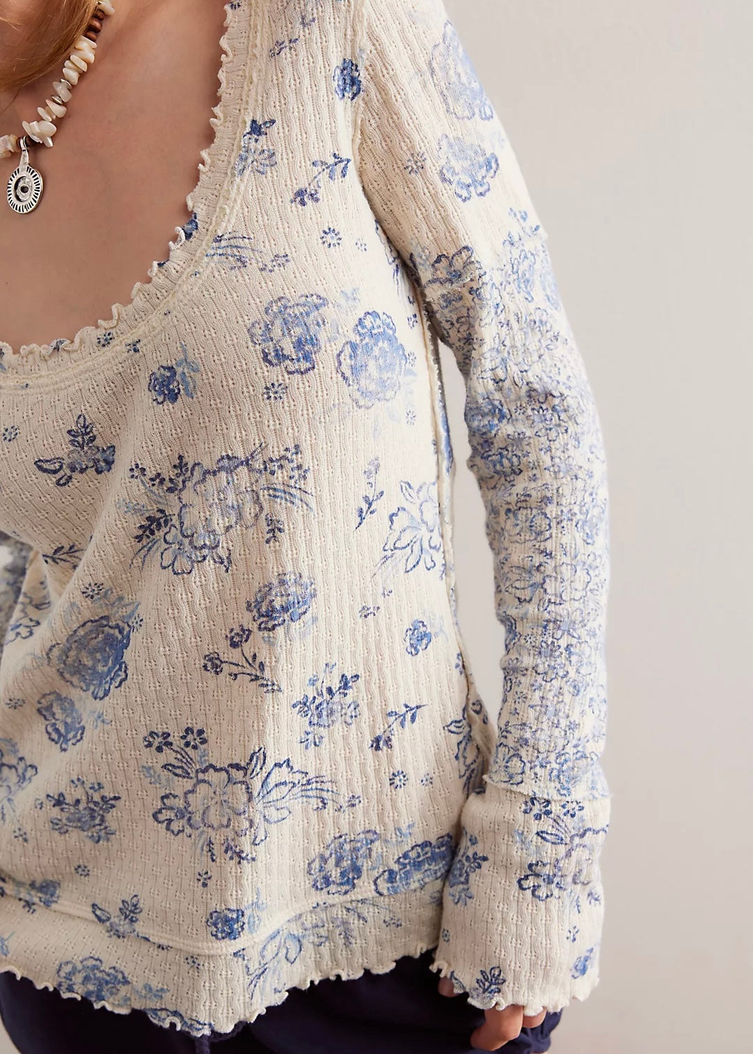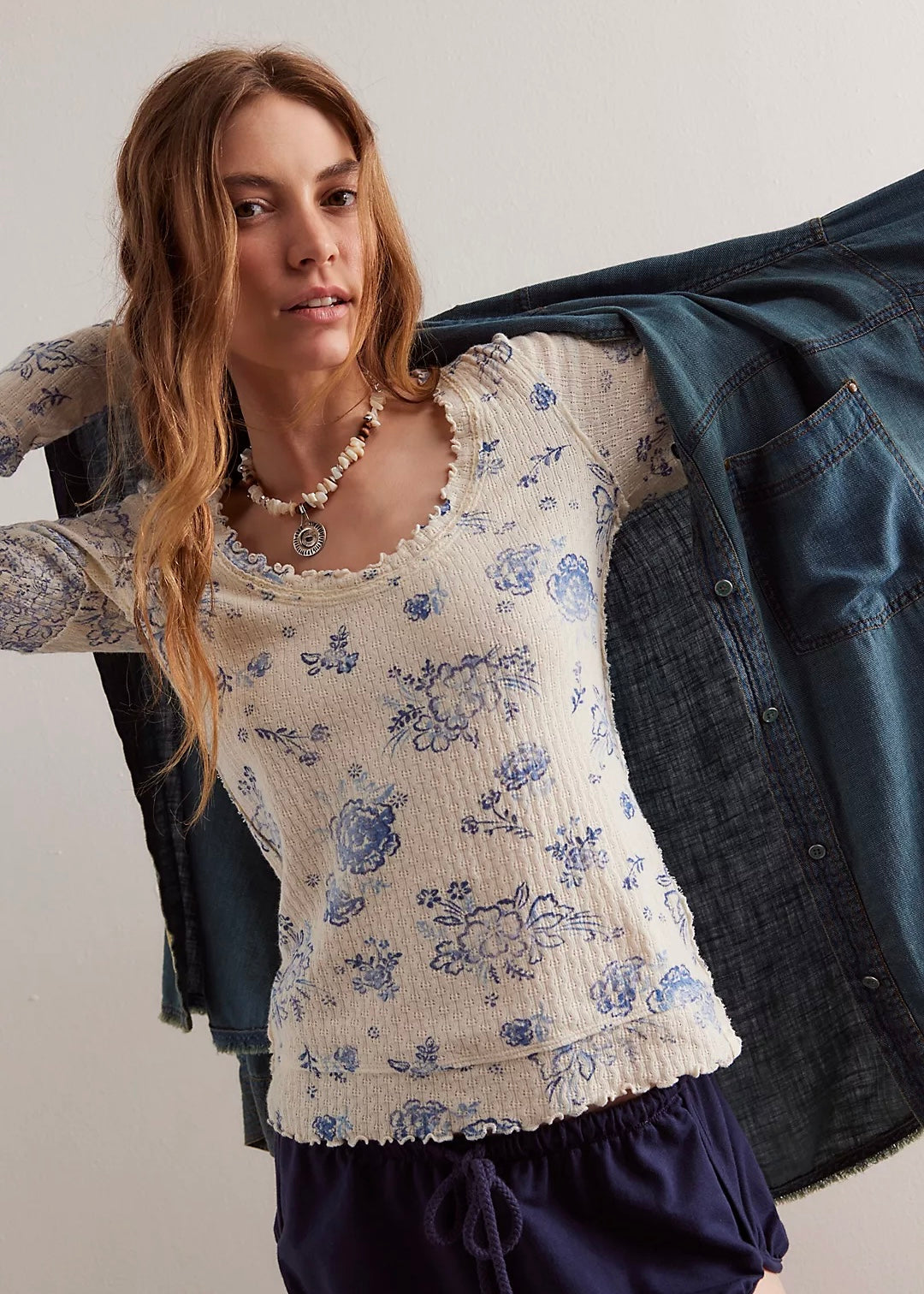 Features: Soft cotton fabrication, printed detail all over, low scoop-neckline, slim-fitting long-sleeves, exposed seam detail, layered hem, lettuce-edge trim